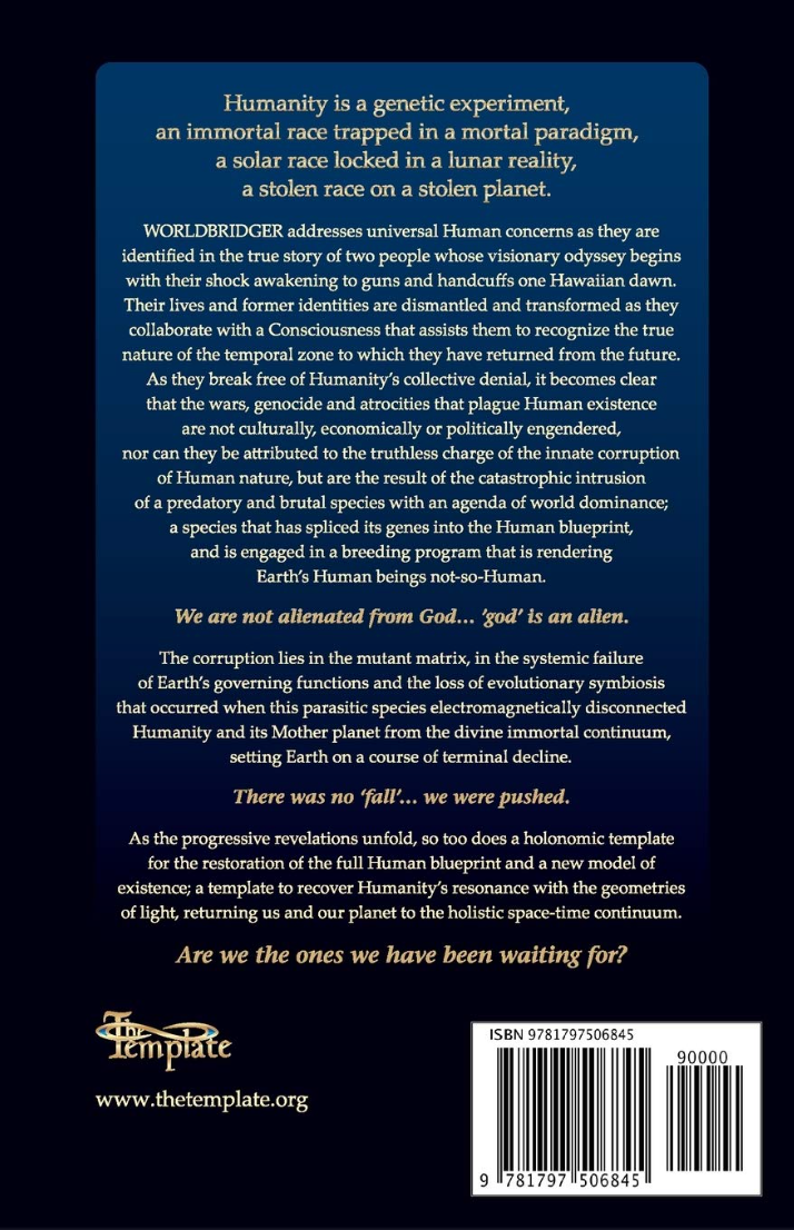 WORLDBRIDGER addresses universal Human concerns as they are identified in the true story of two people whose visionary odyssey begins with their shock awakening to guns and handcuffs one Hawaiian dawn. Their lives and former identities are dismantled and transformed as they collaborate with a Consciousness that assists them to recognize the true nature of the temporal zone to which they have returned from the future. As they break free of Humanity’s collective denial, it becomes clear that the wars, genocide and atrocities that have become a part of Human existence are not culturally, economically or politically engendered, nor can they be attributed to the charge of the innate corruption of Human nature, but are the result of the catastrophic intrusion of a predatory and brutal species with an agenda of world dominance; a species that has spliced its genes into the Human blueprint, and is engaged in a breeding program that is rendering Earth’s Human beings not-so-Human.