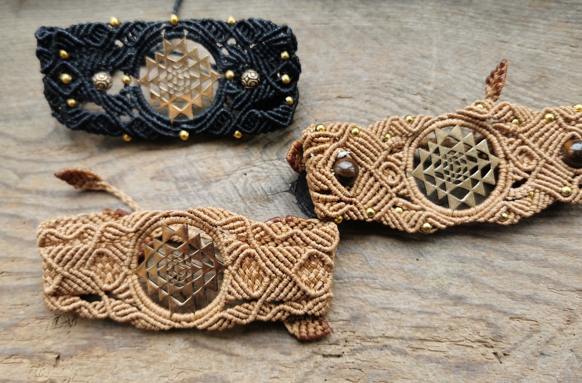 Ref.BR0039 - Macrame bracelet with Sri Yantra motif in brass.