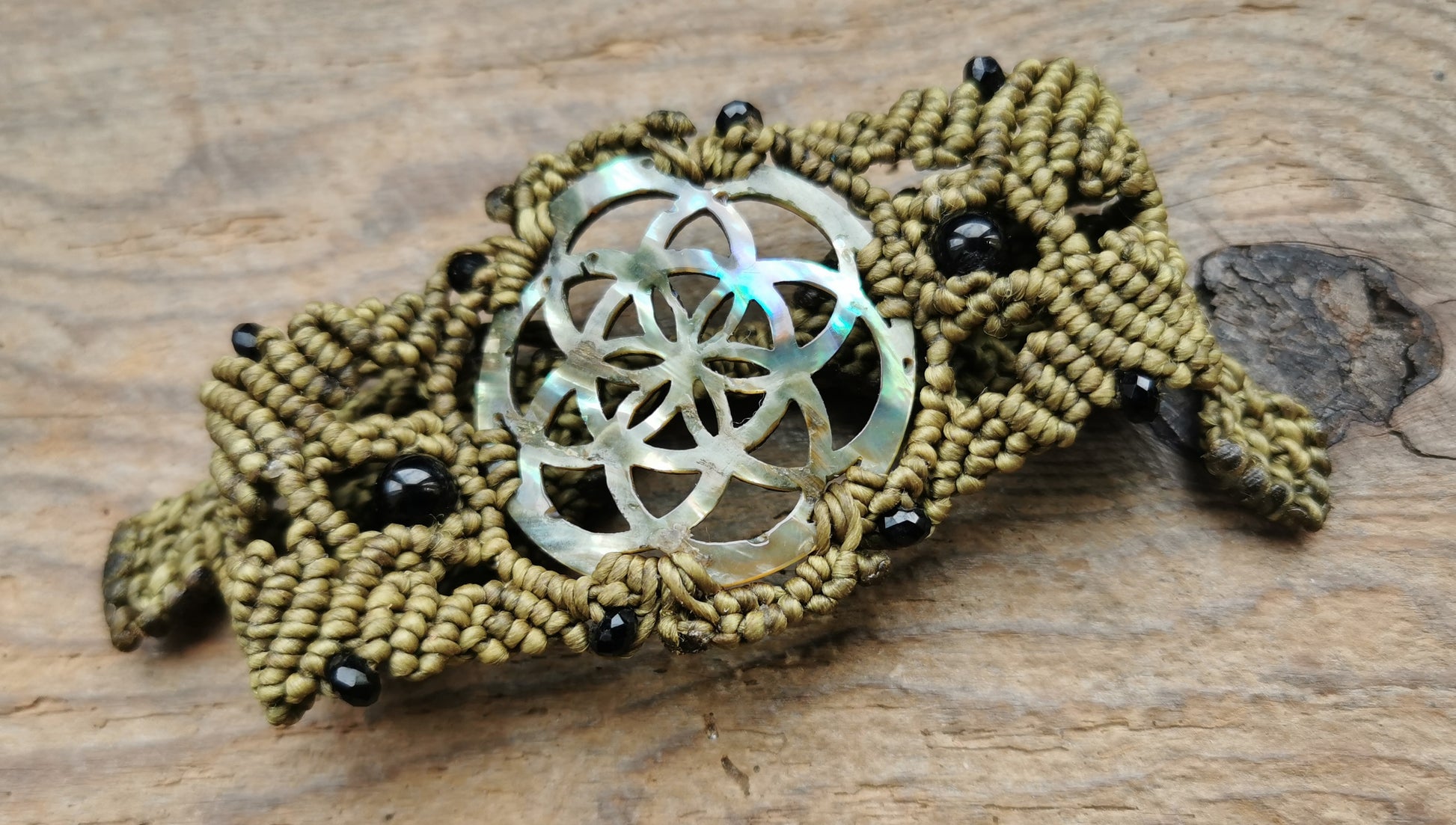 Ref.BR0044 - Macrame bracelet with Solar Mandala, aka Seed of Life, motif in abalone shell.