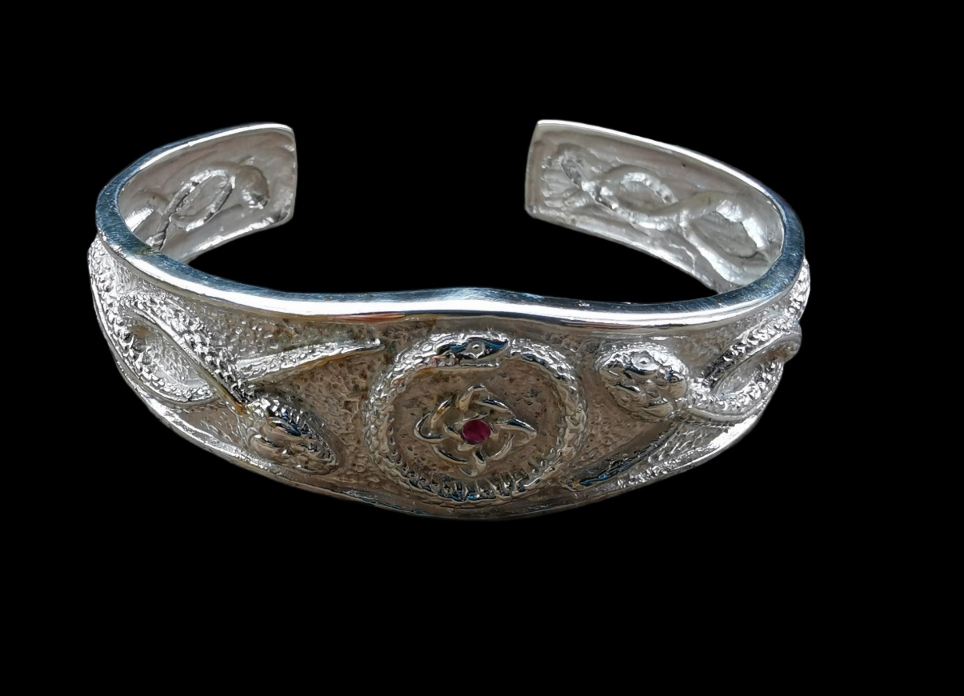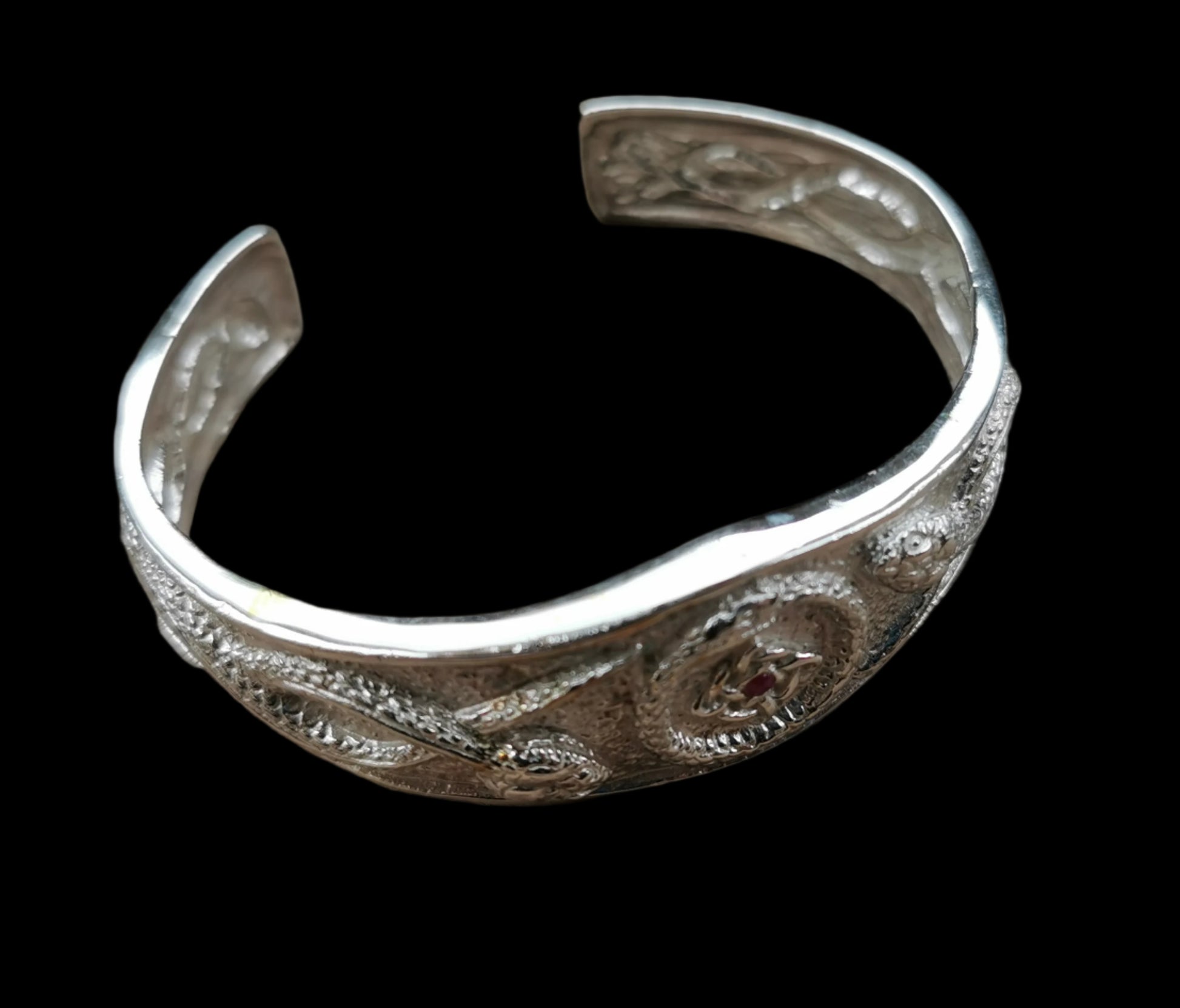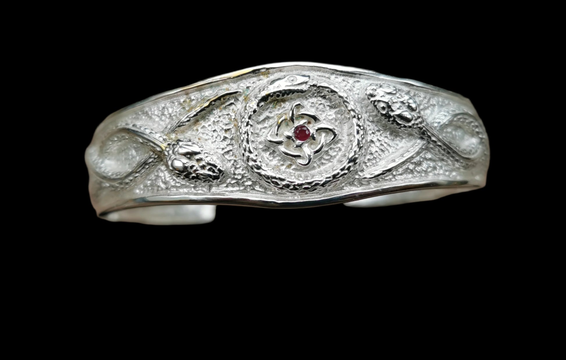 Ref.BR0054 - Sterling silver bracelet with ouroboros motif and gemstone.