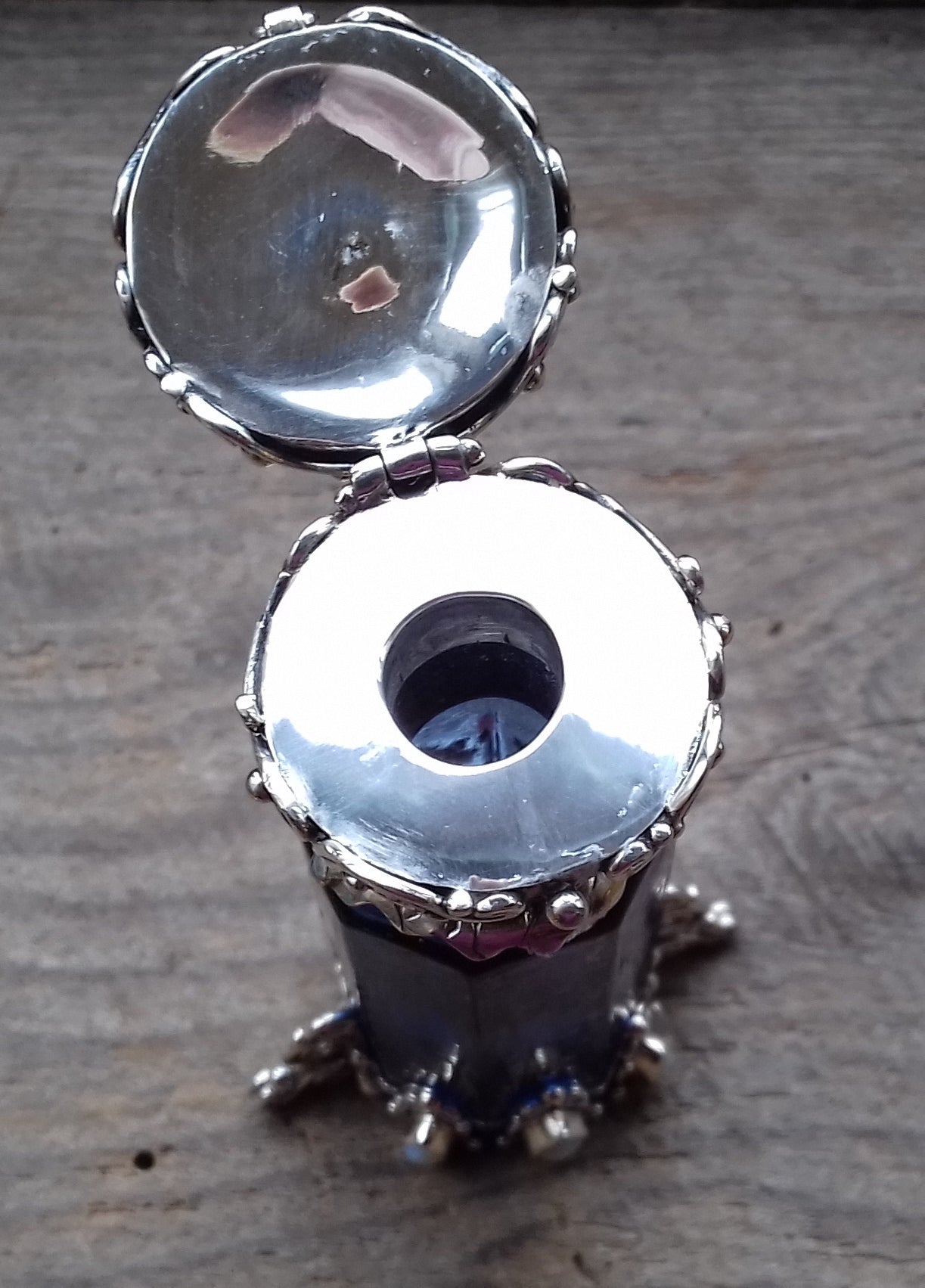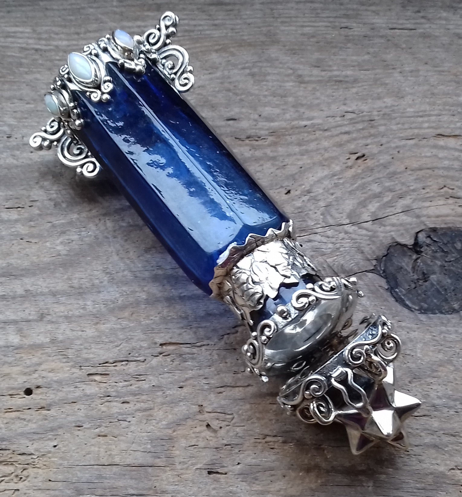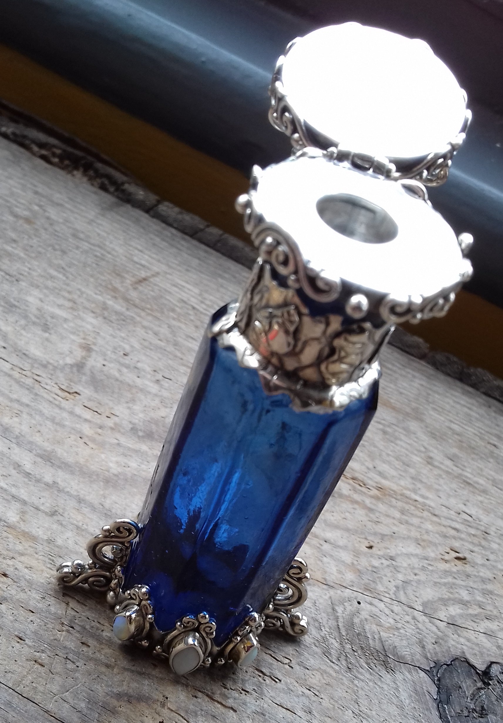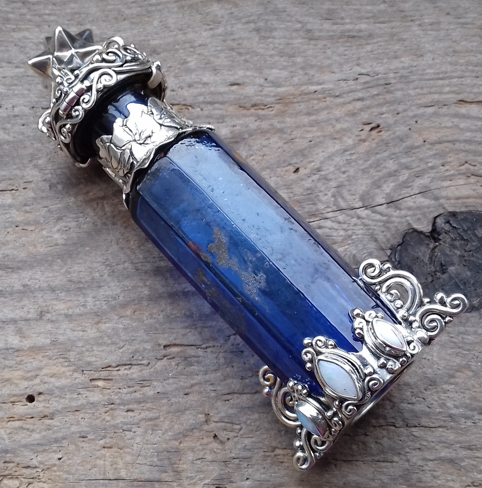 Ref.BT0003 - Blue bottle with silver Solar Star geometry, and opal gemstones.