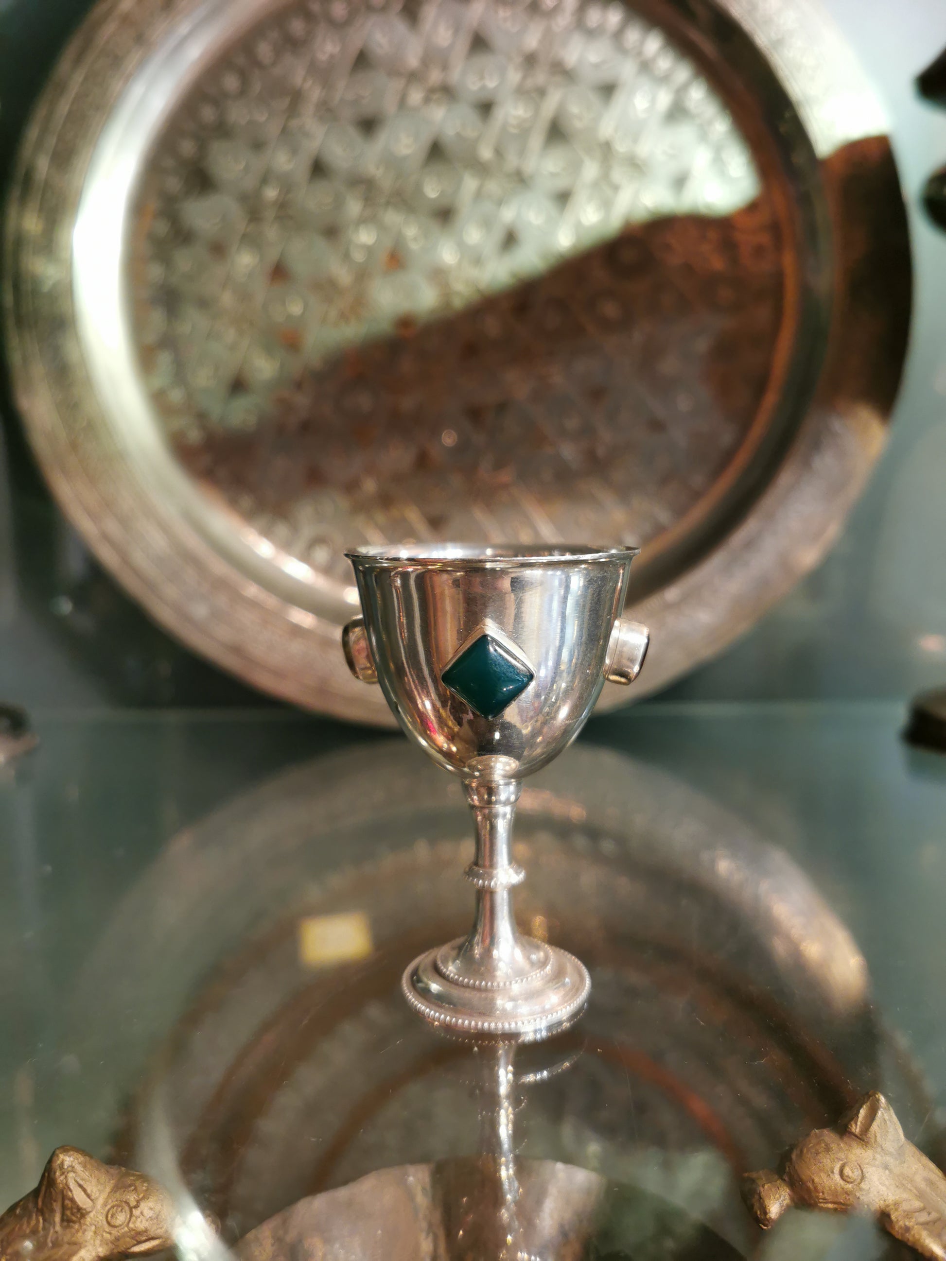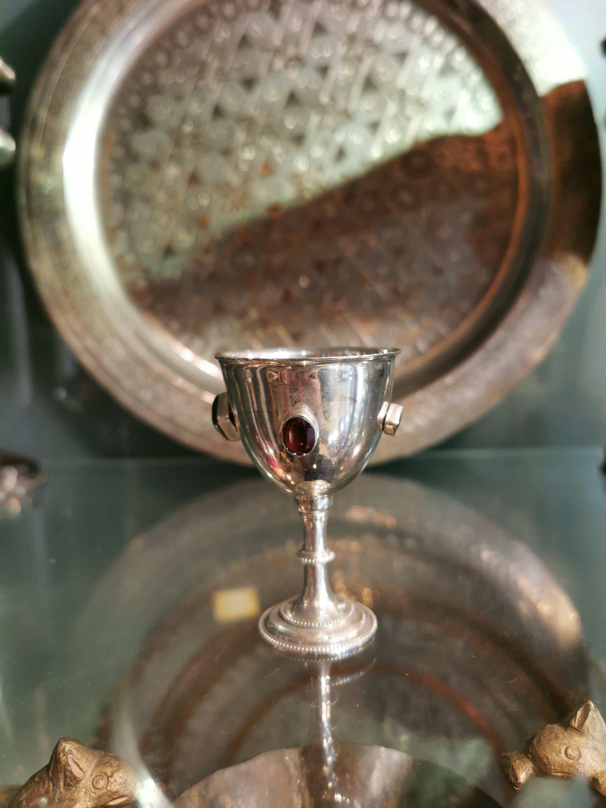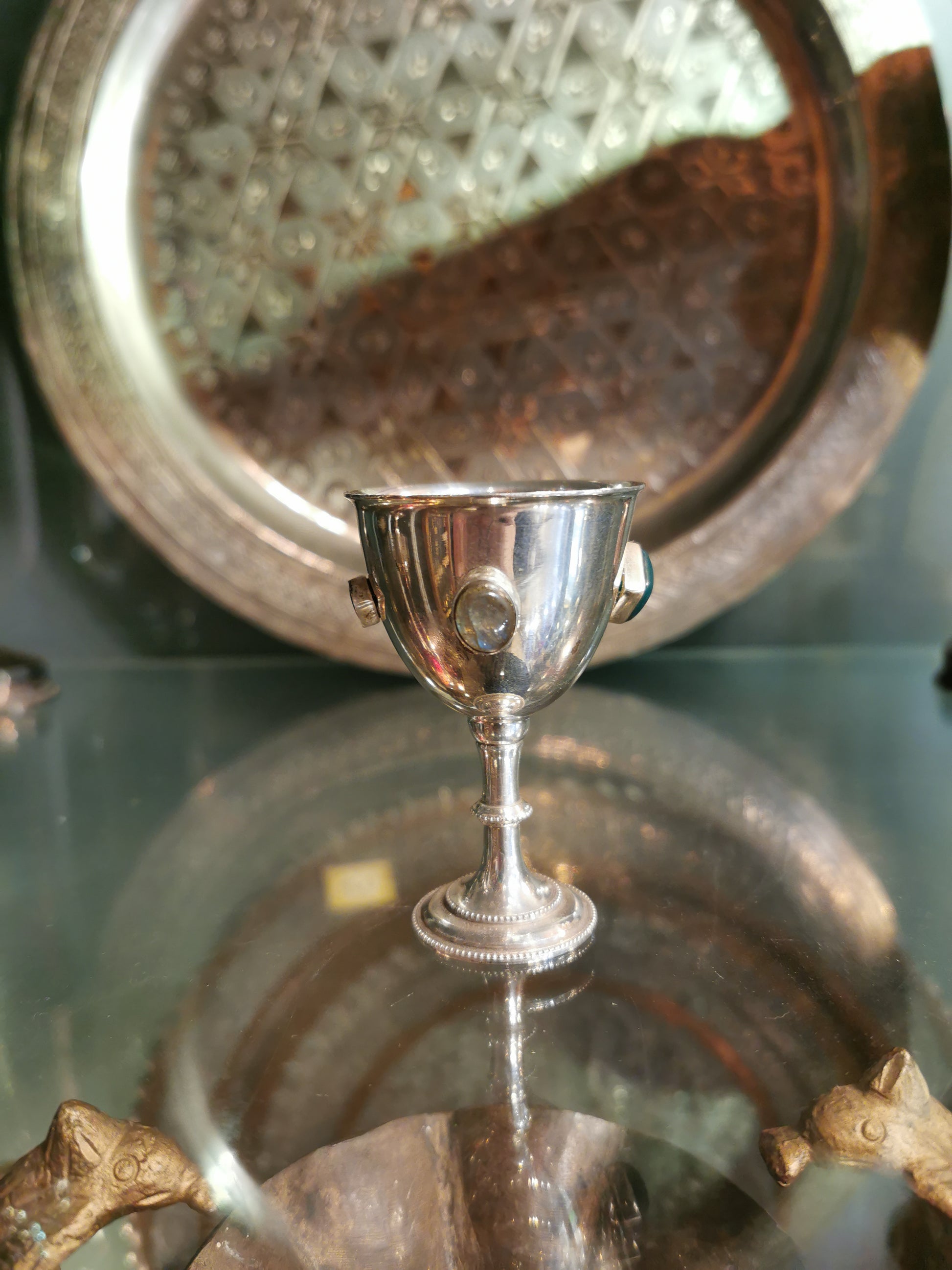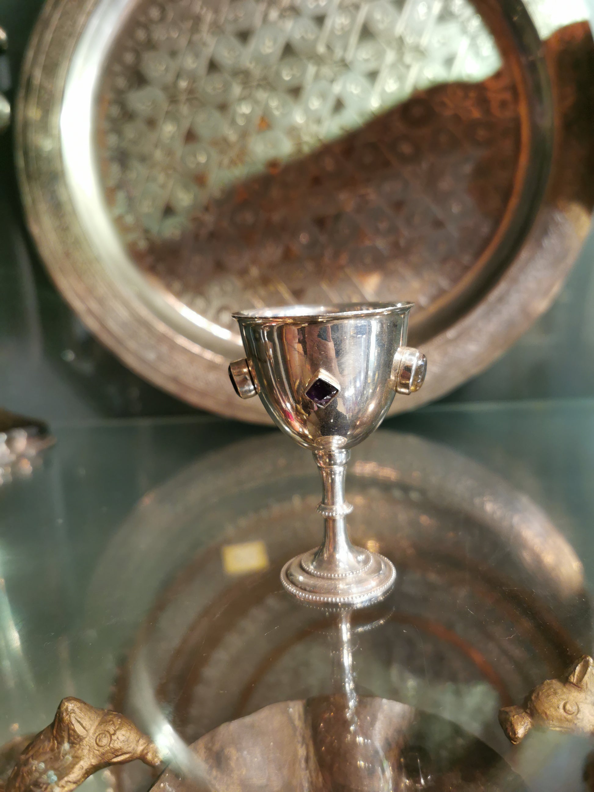 Ref.CH0151 - Silver plated goblet with garnet, onyx, labradorite, and amethyst gemstones.