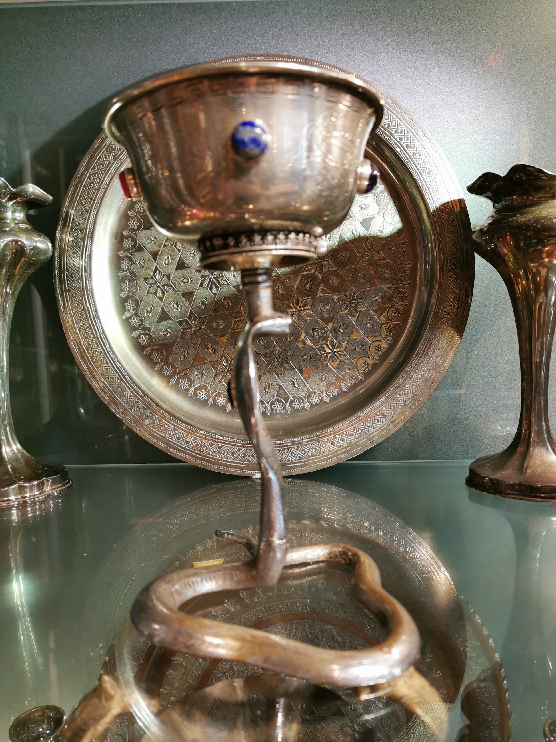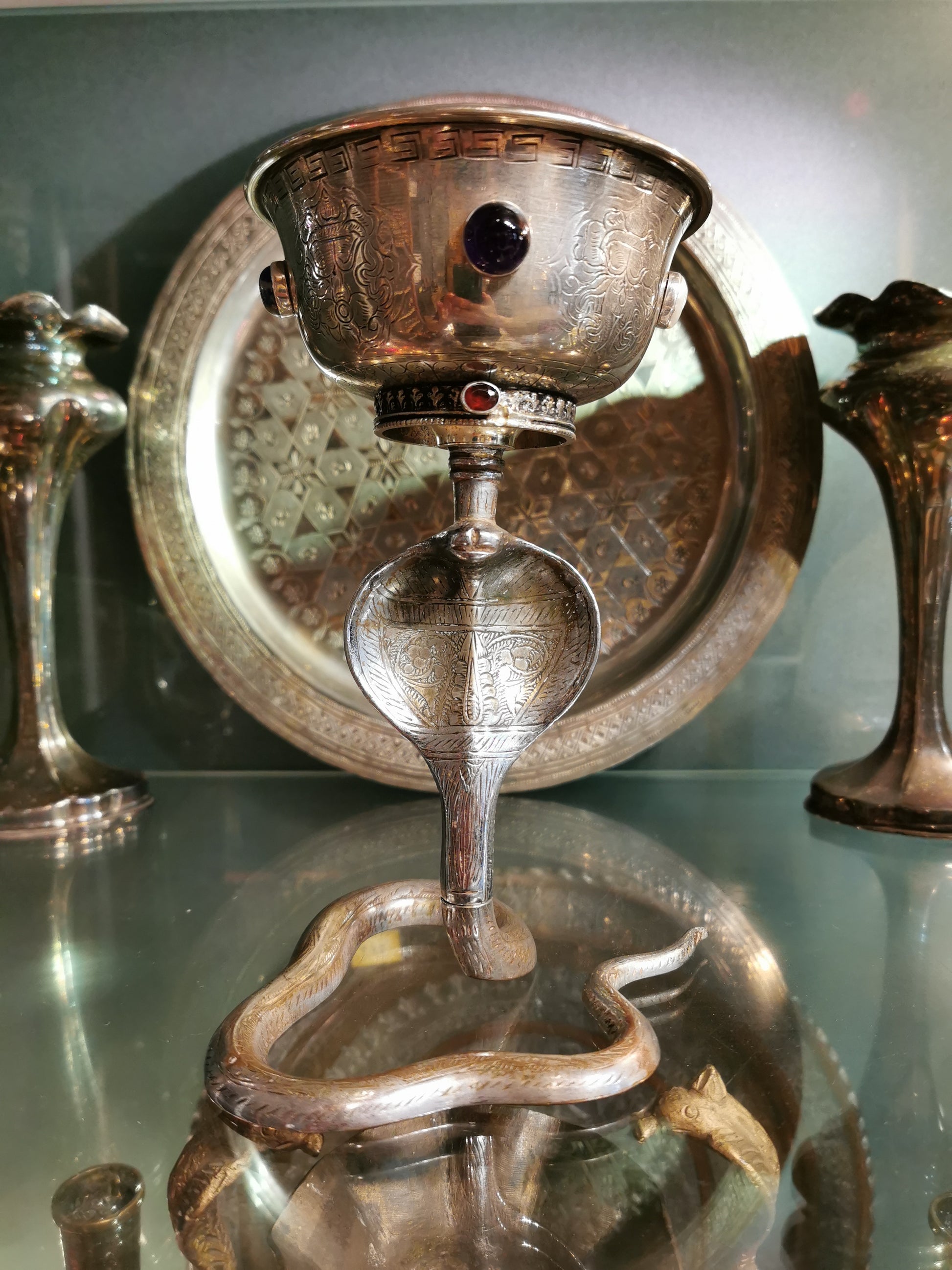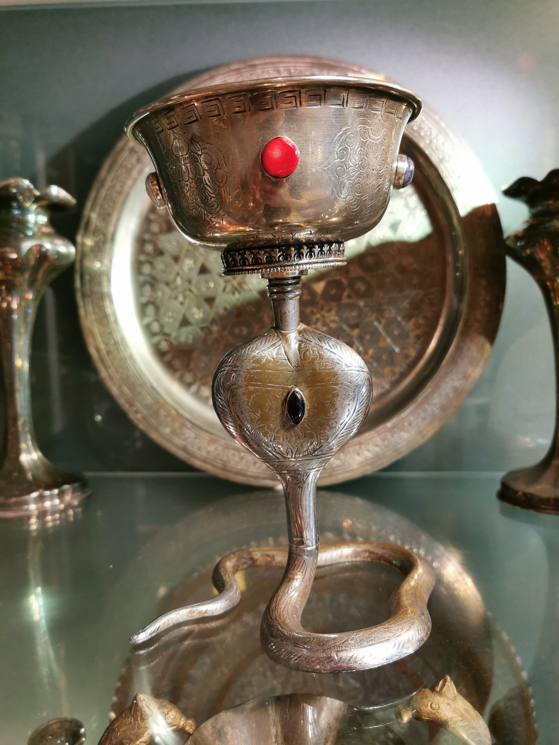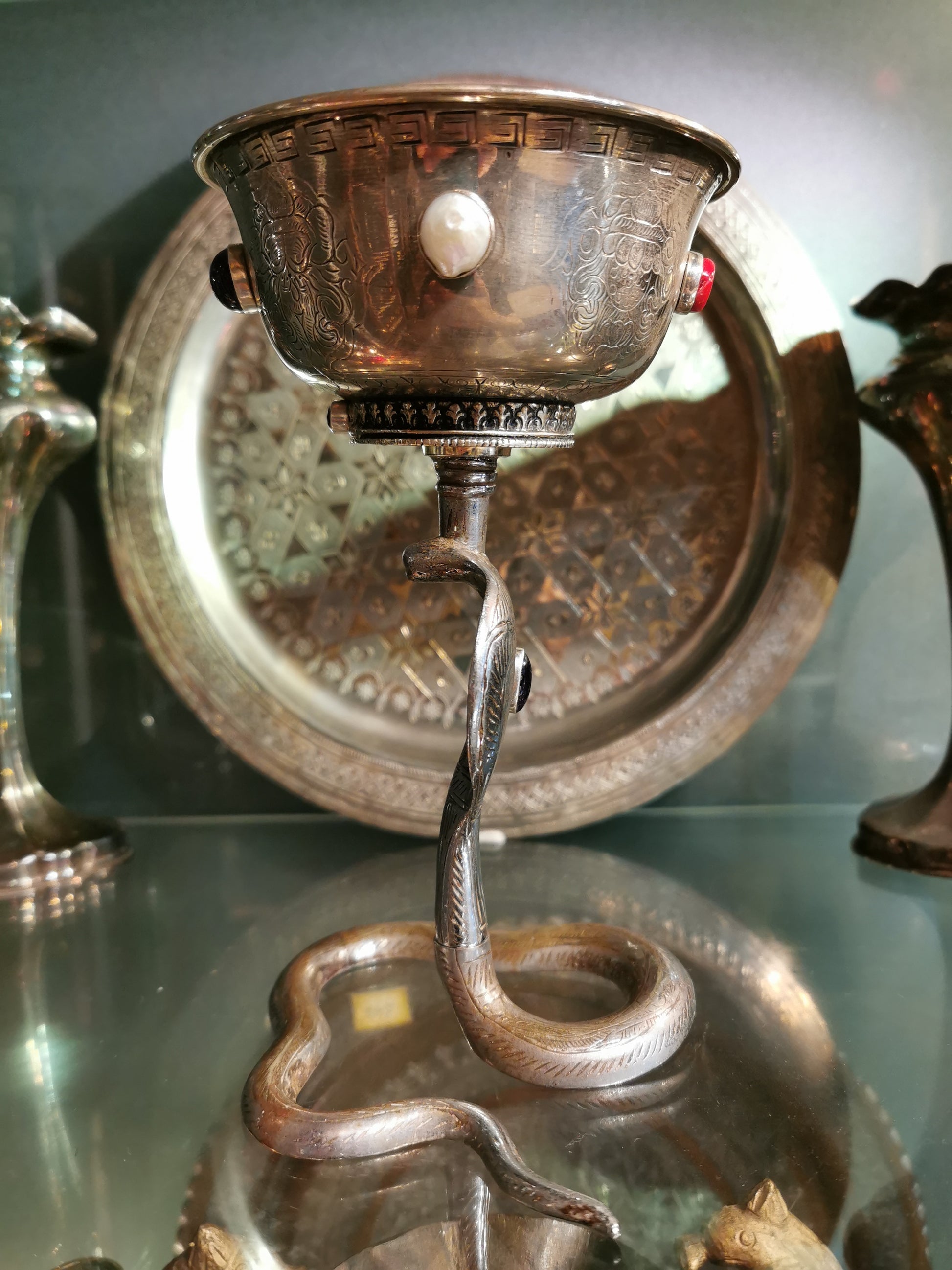 Ref.CH0154 - Silver plated goblet with pearl, coral bit, lapis lazuli, garnet, and amethyst gemstones.