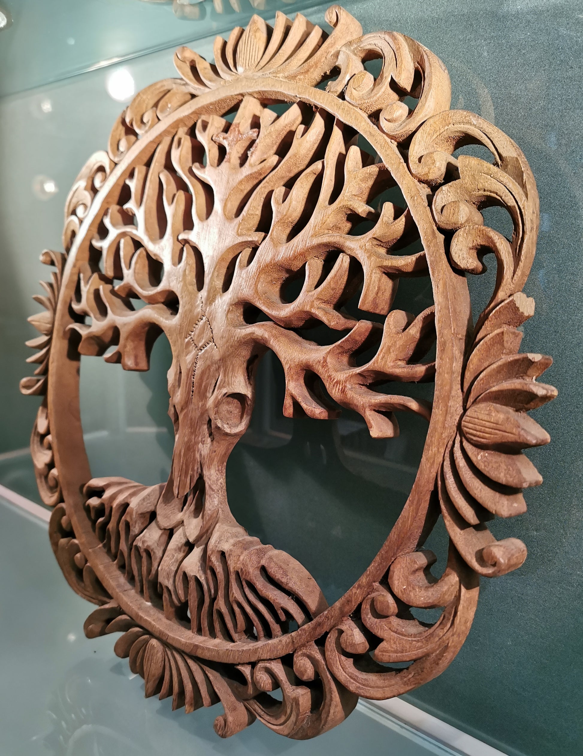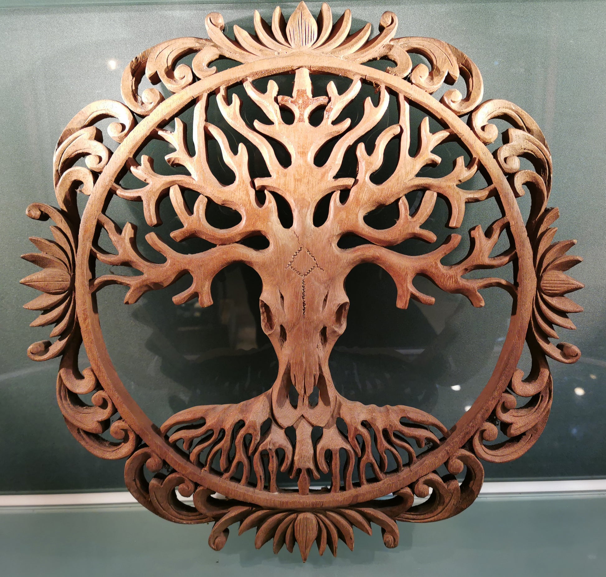 Ref.CR0078 - Tree of Life + buffalo skull carving in mahogany wood. - AS IS -
