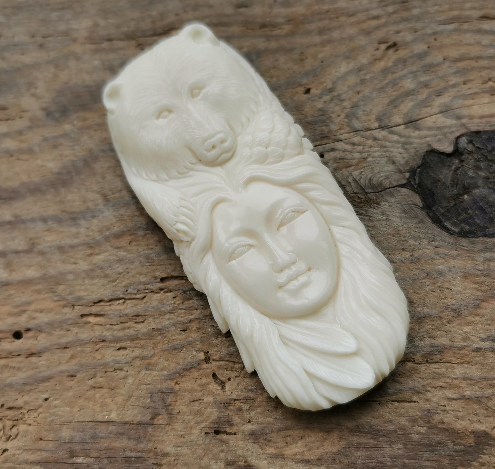 Ref.CR0111 - Pendant with carved woman face and bear.