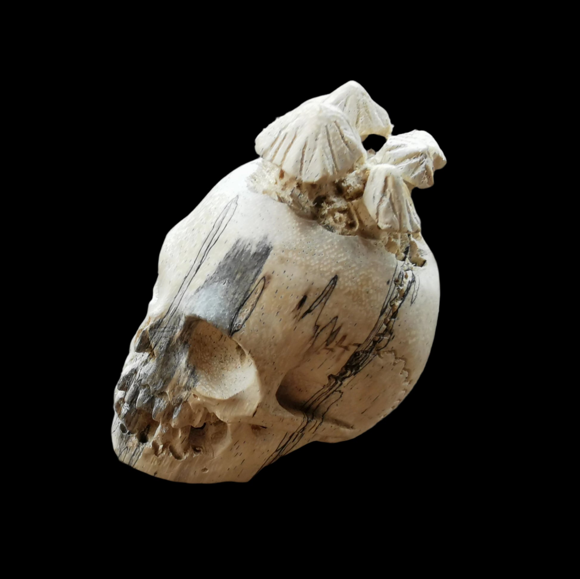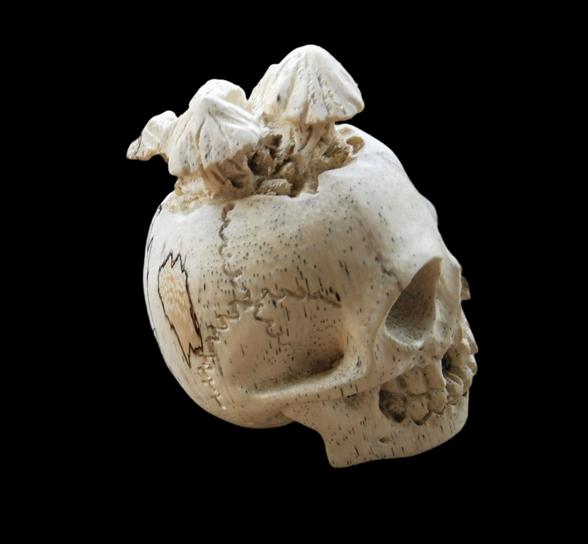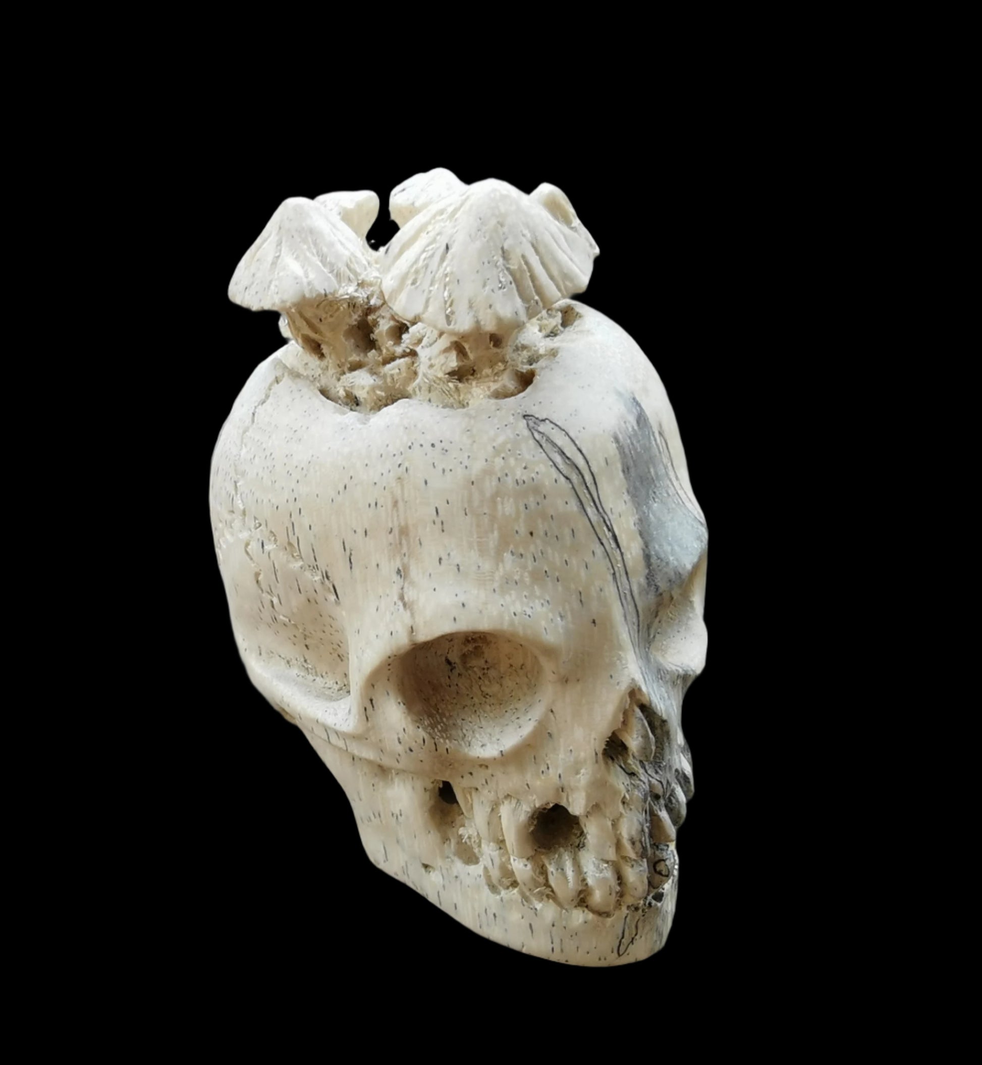 Ref.CR0142 - Spalted tamarind wood carved human skull decorated with mushrooms.