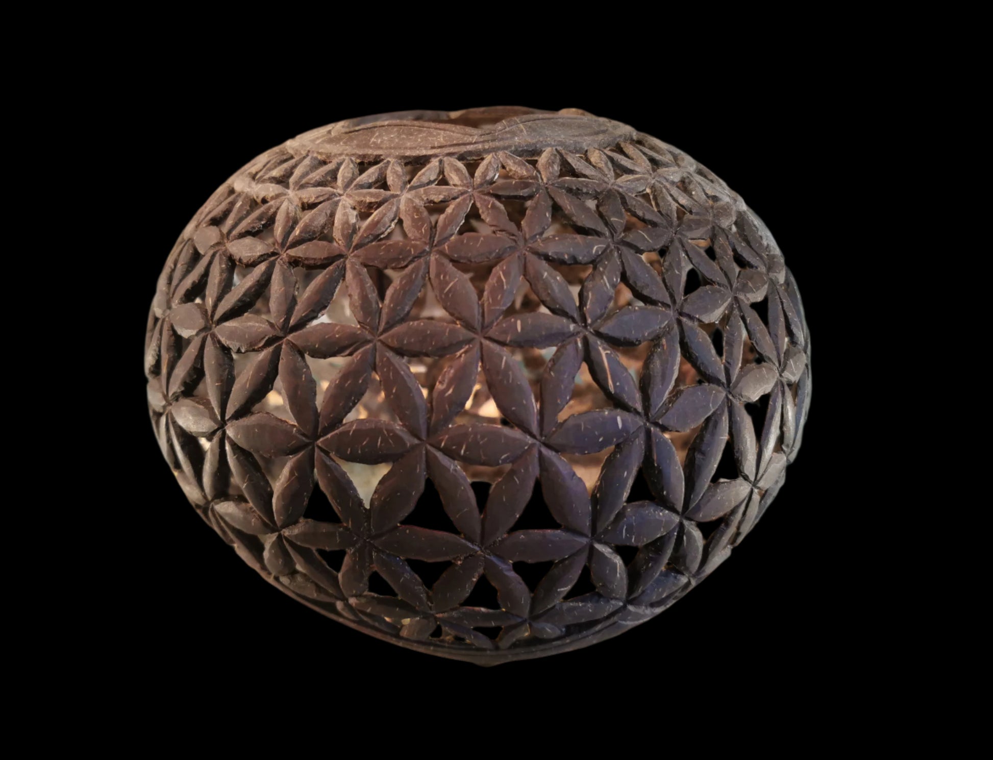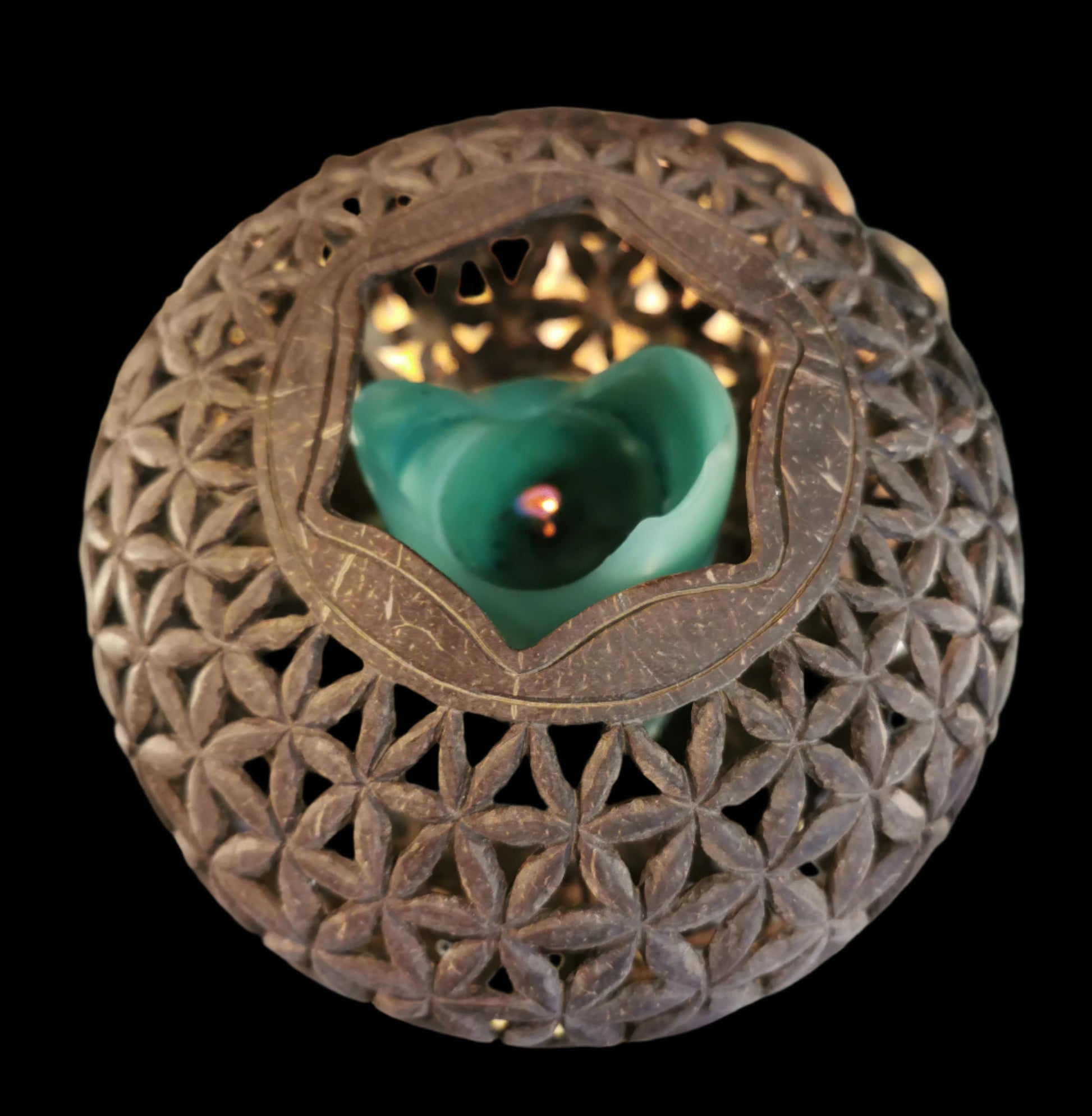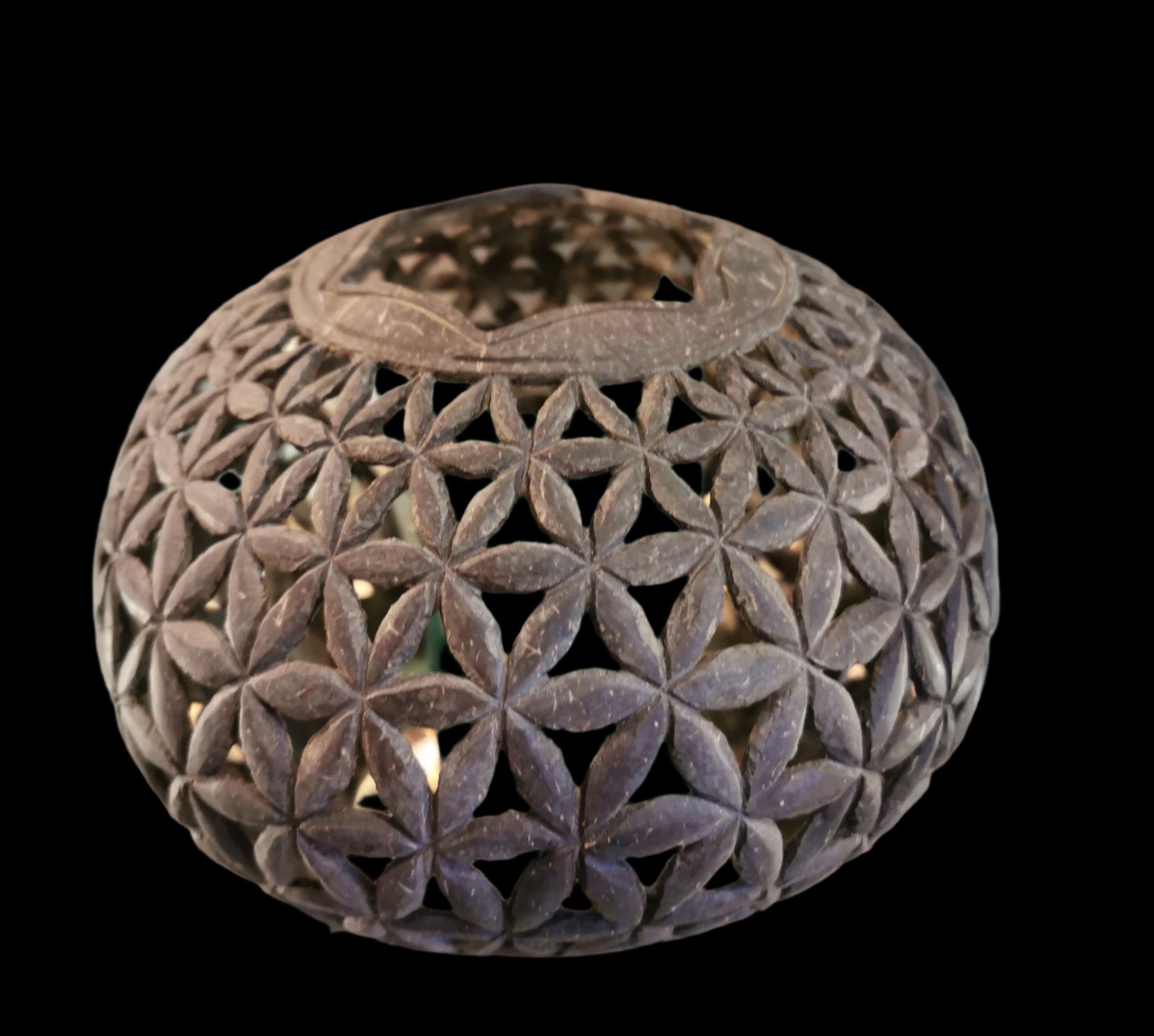 Ref.DV0040 - Candle cover in carved coconut with Flower of Life motif.
