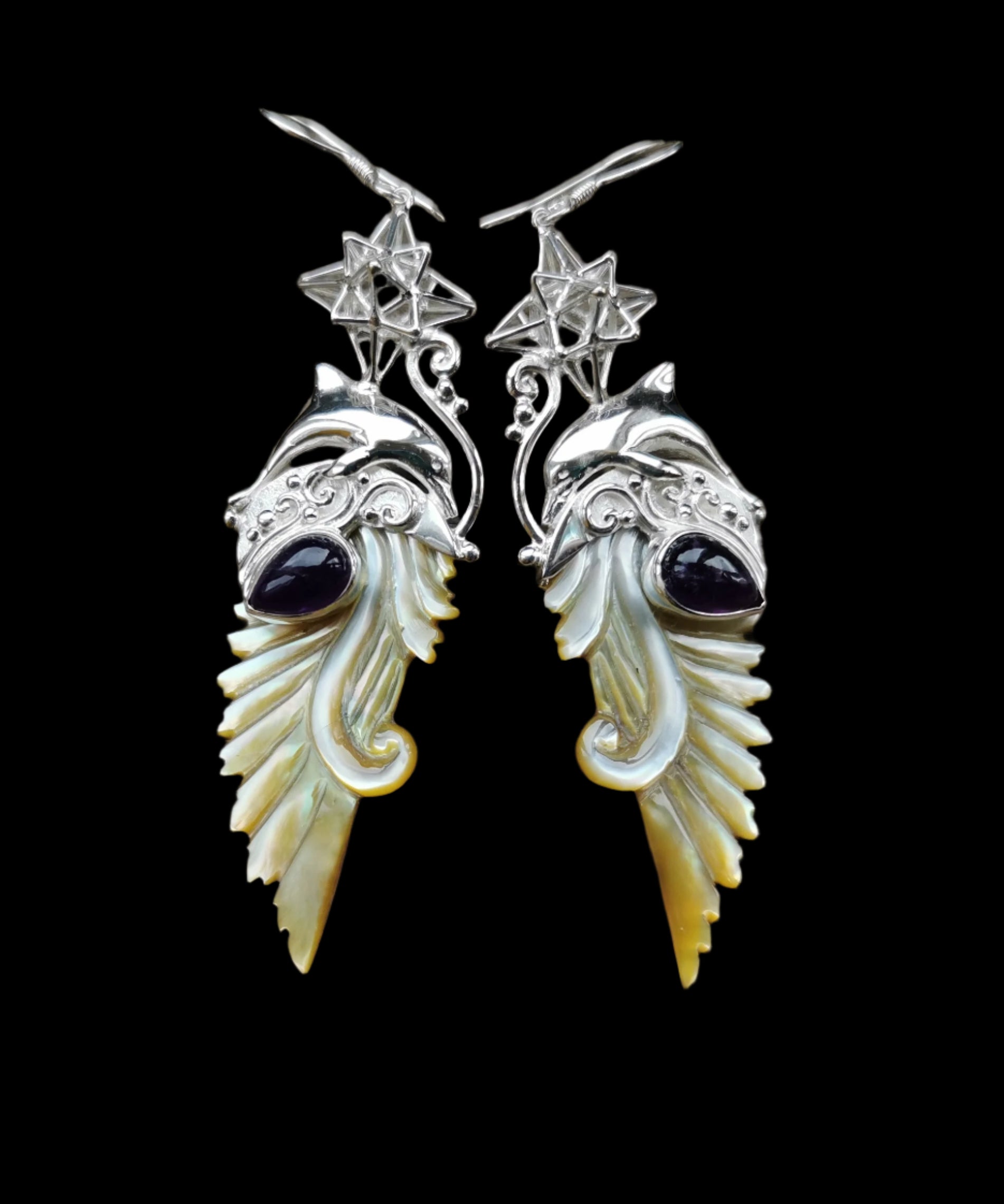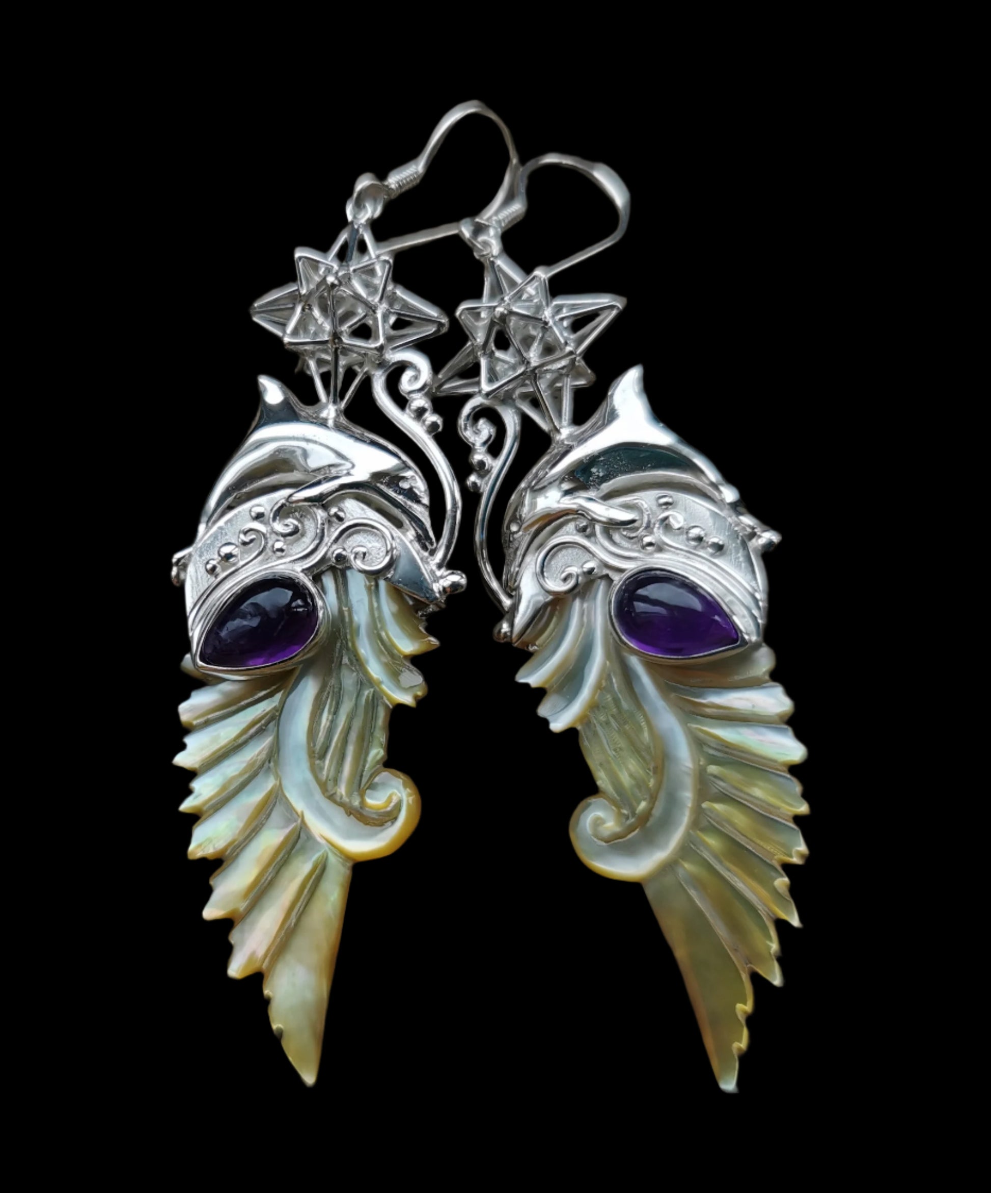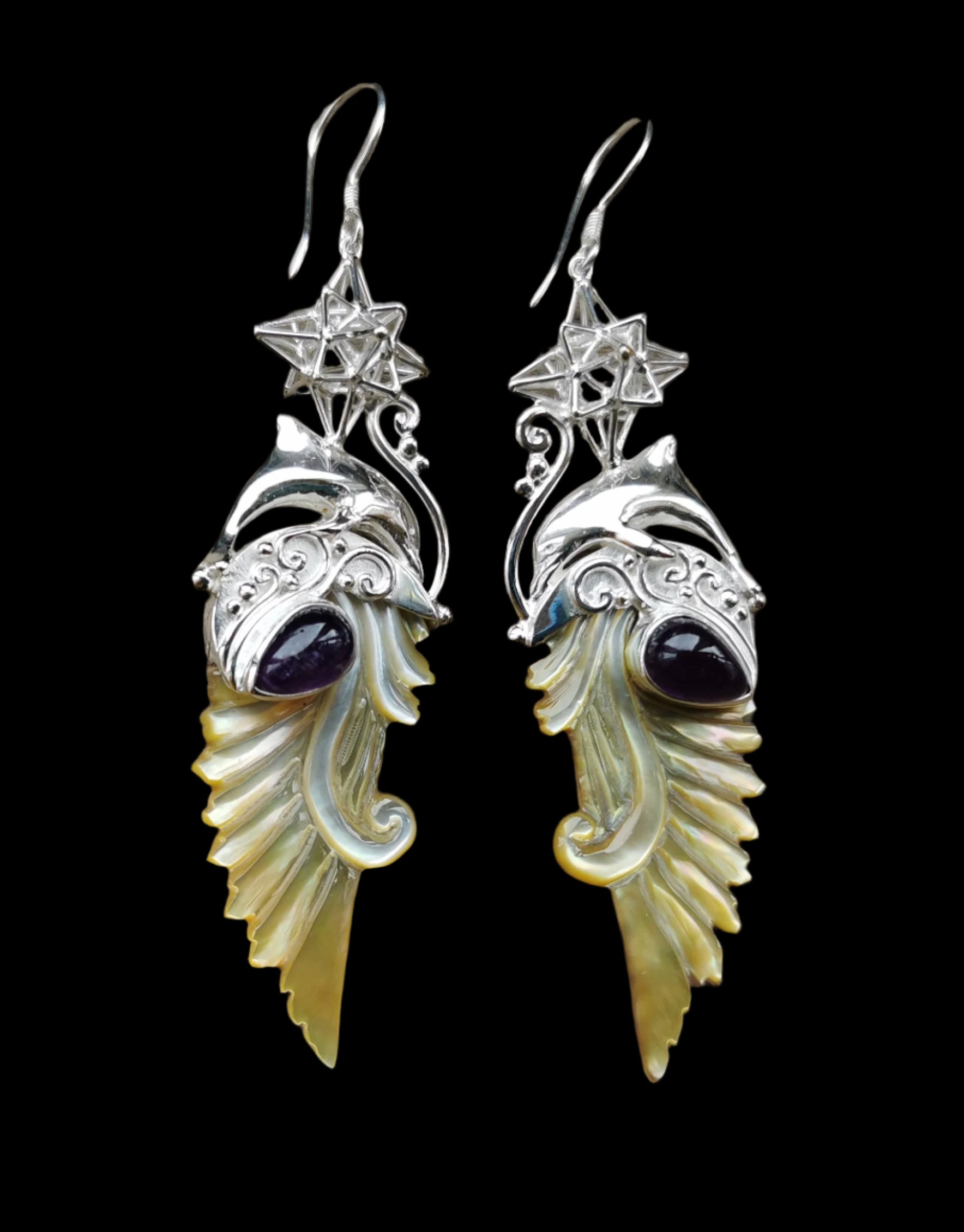 Ref.ER0036 - Silver earrings with Heart Star geometry & dolphins, mother of pearl carved wings, and amethyst gem.