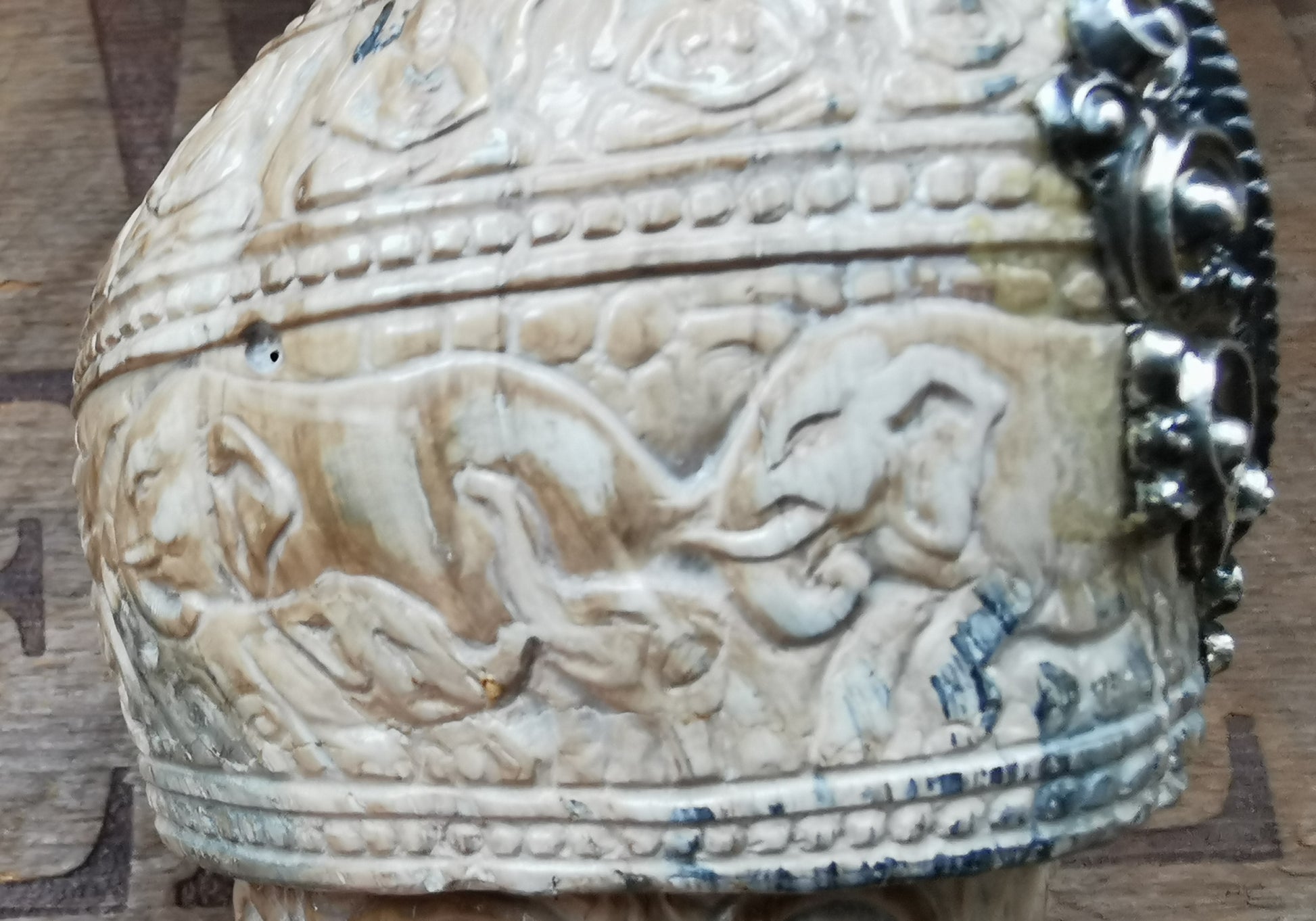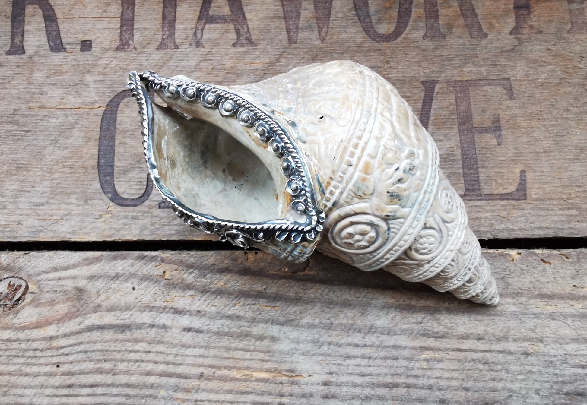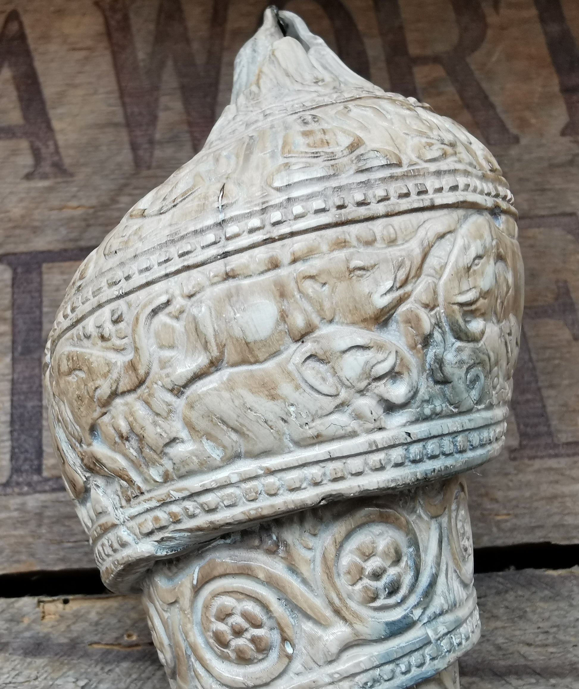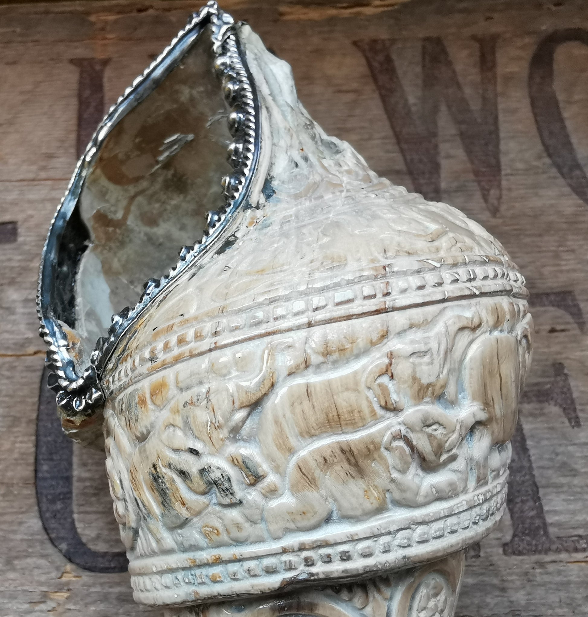 Right handed fossilized conch decorated with silver work and carved elephants.