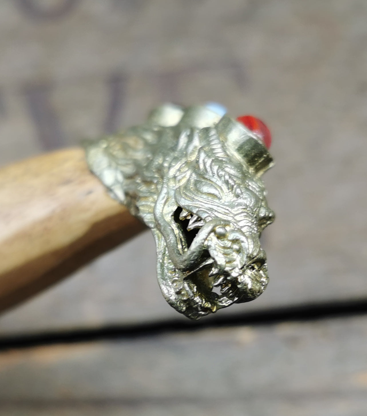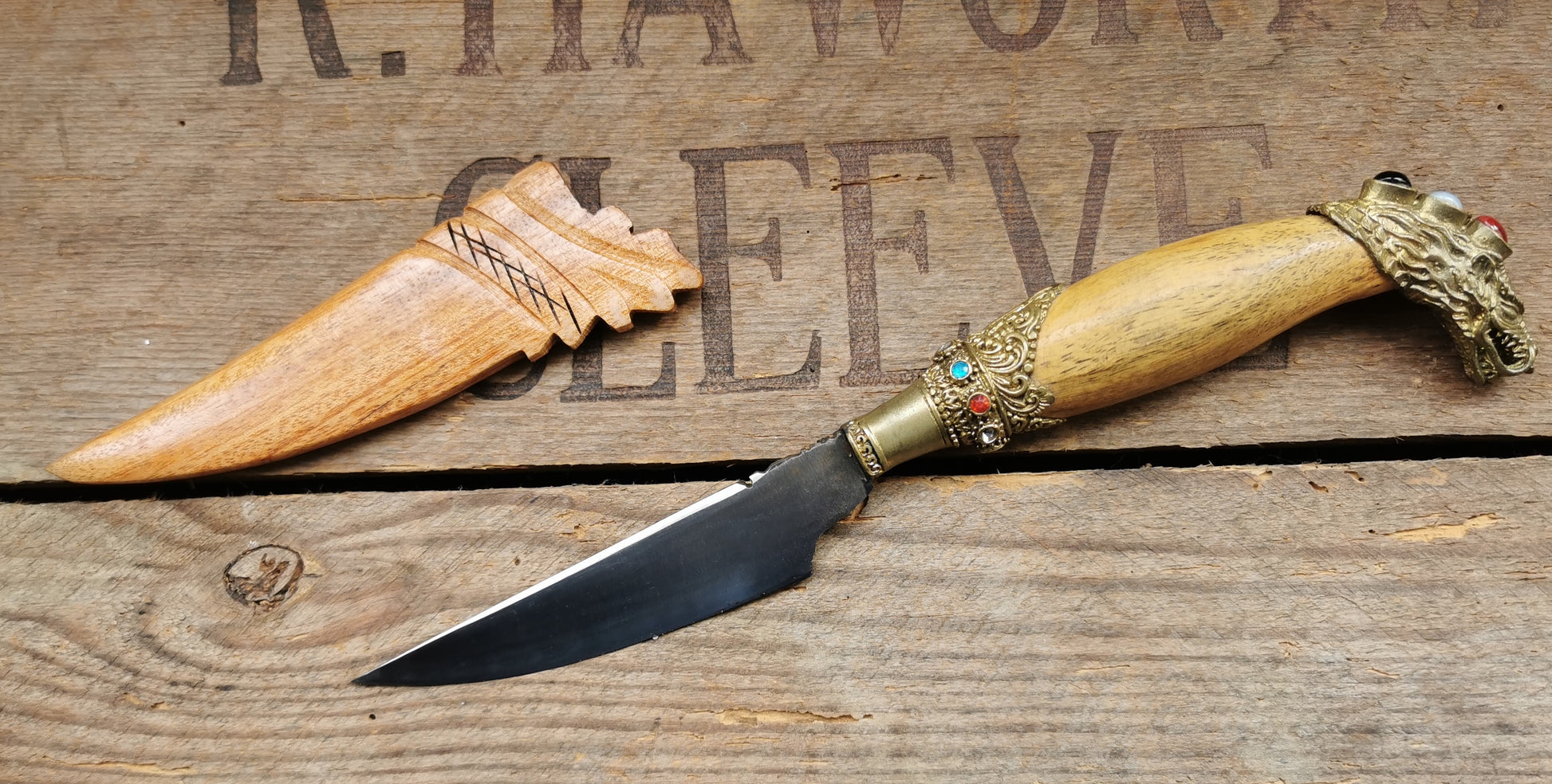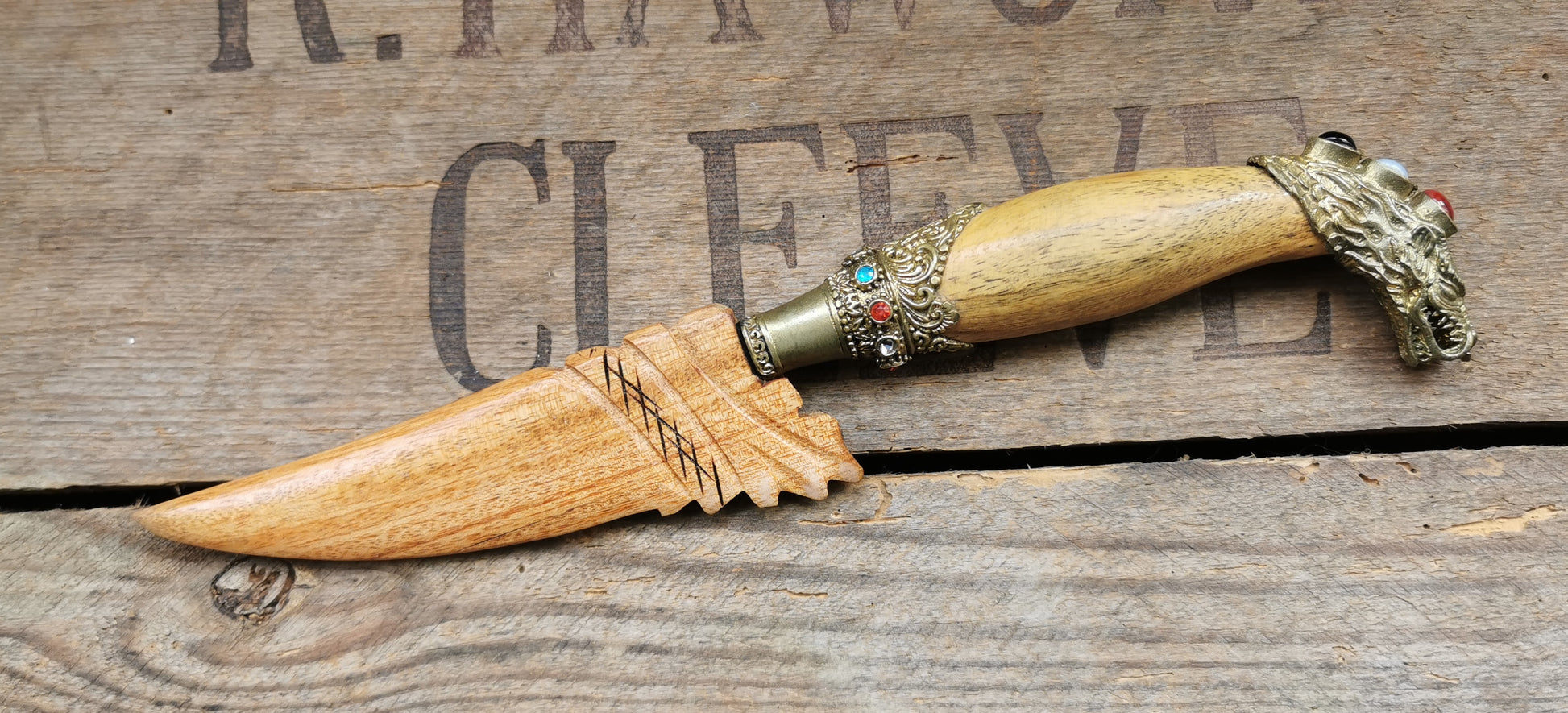 Ref.ET0049 - Balinese steel dagger with bronze settings, crocodile wood handle and sleeve, black onyx, moonstone, and carnelian gemstones; dragon motif; used for offerings in Ceremony.