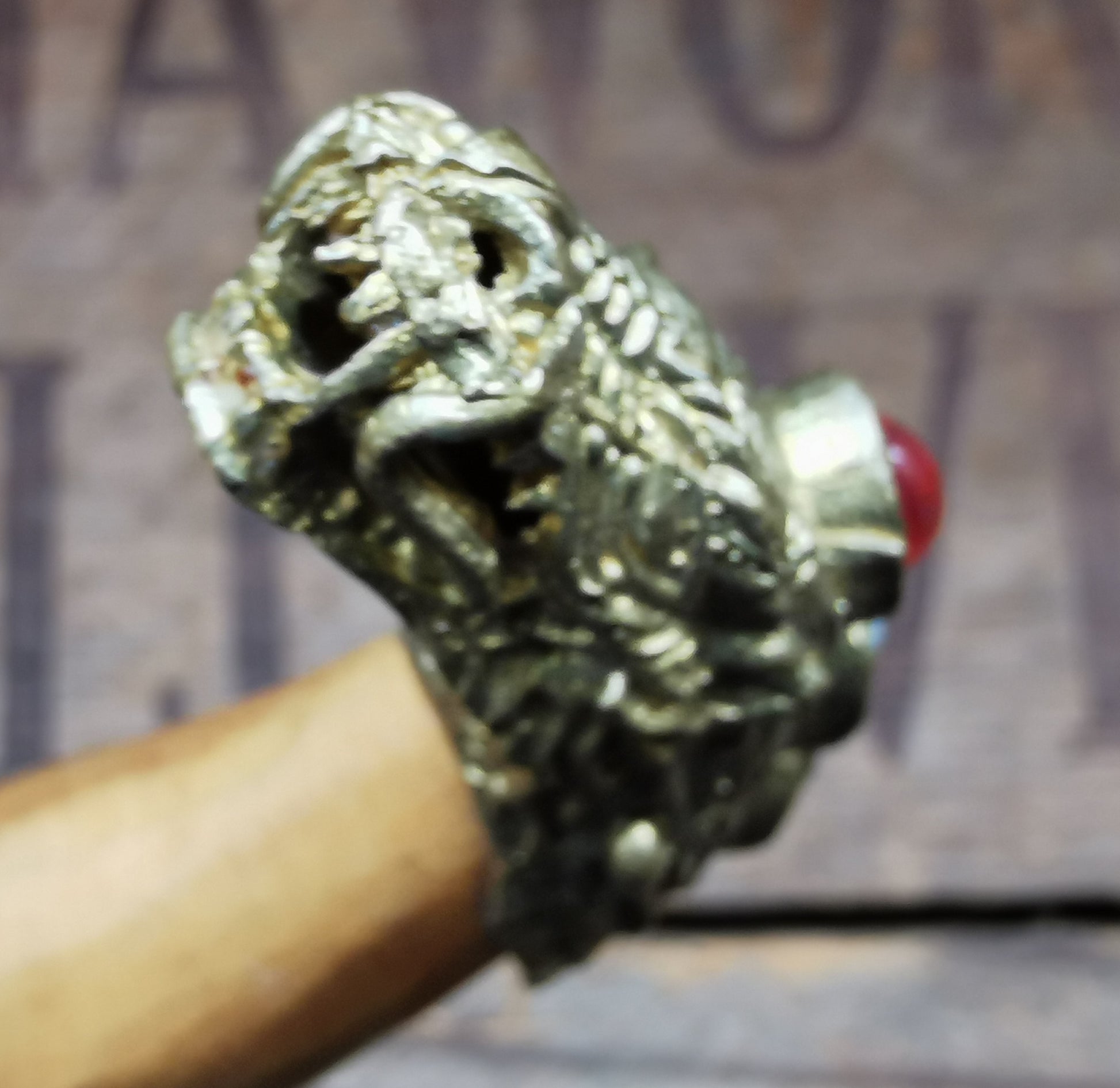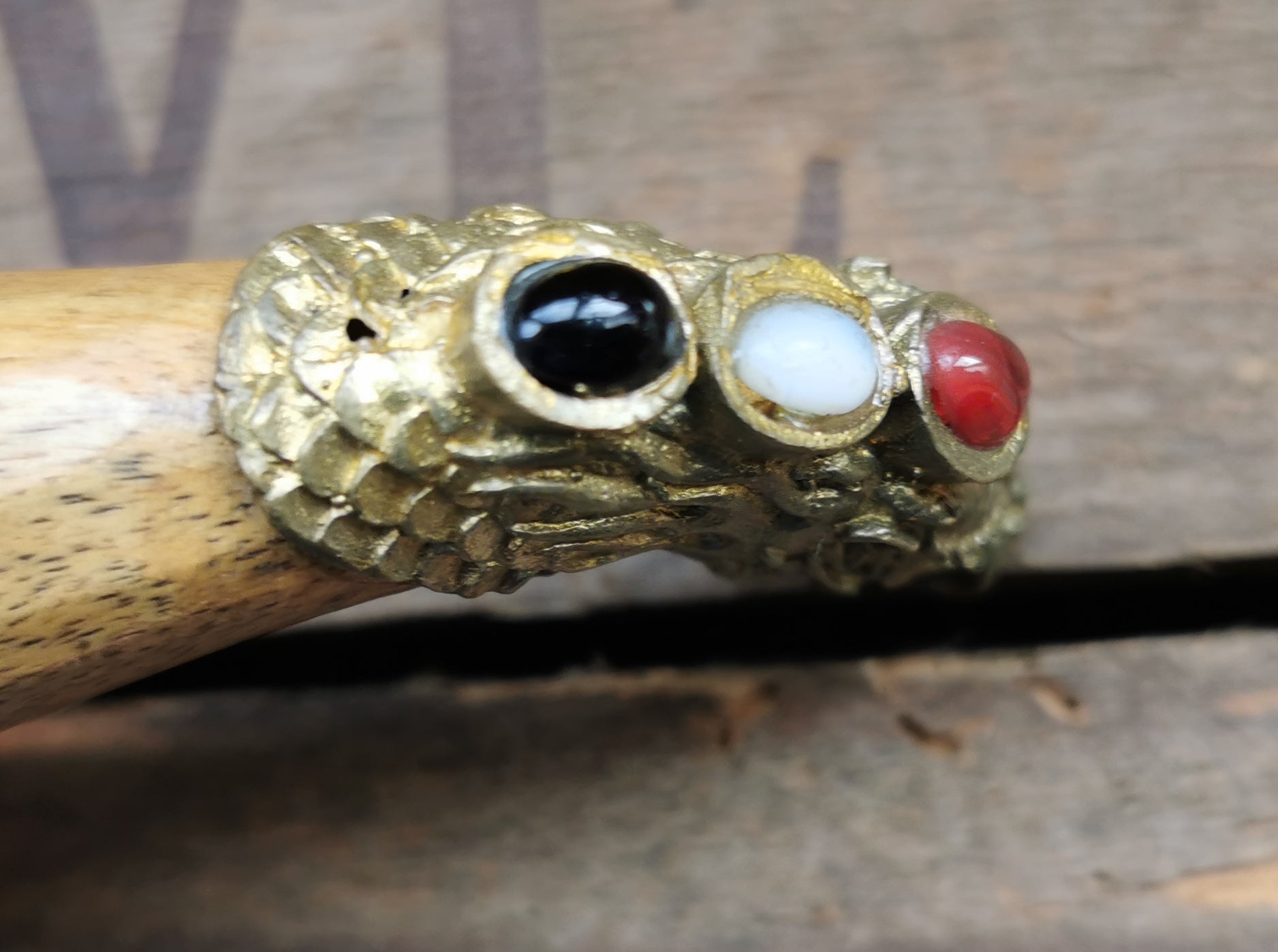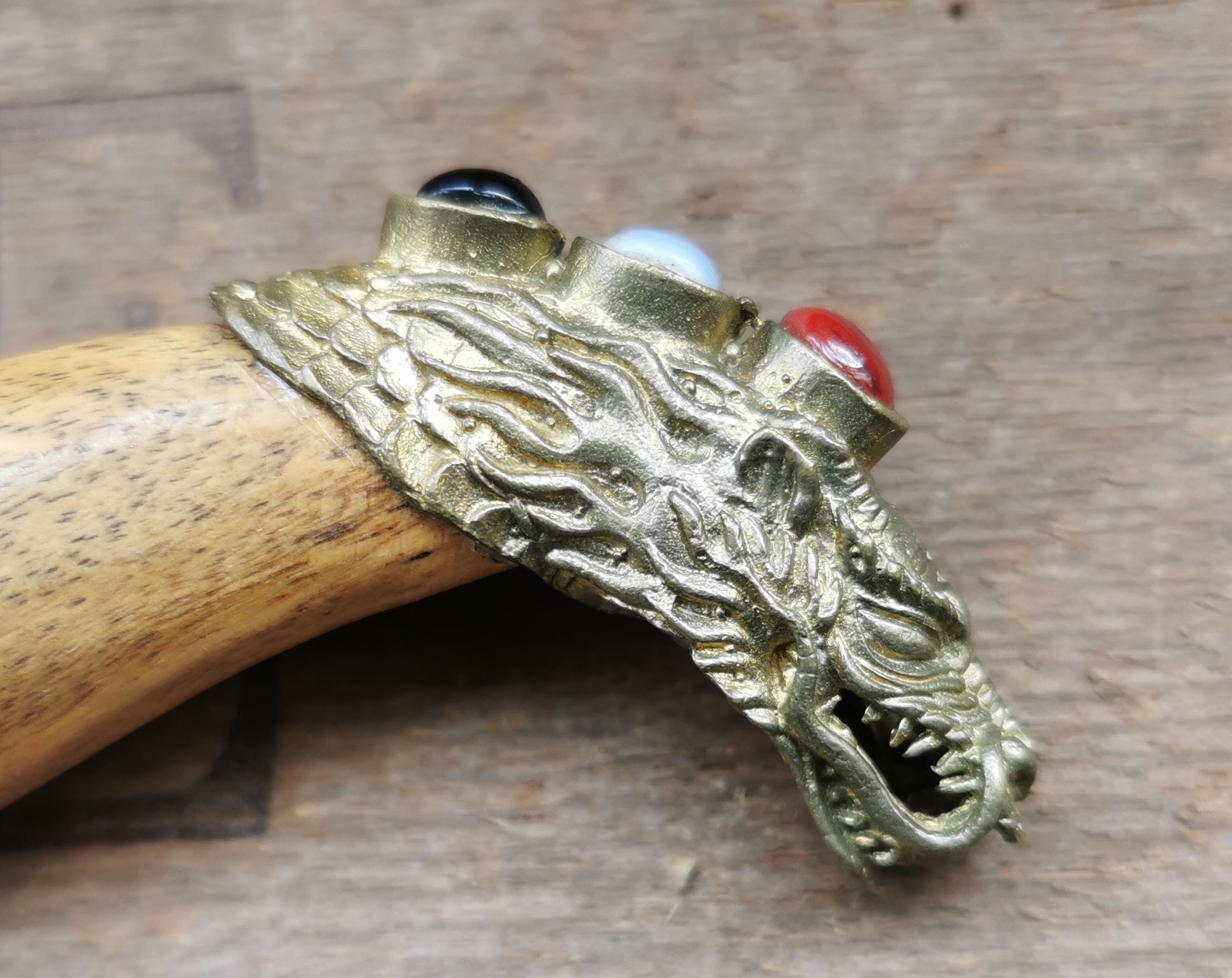Ref.ET0049 - Balinese steel dagger with bronze settings, crocodile wood handle and sleeve, black onyx, moonstone, and carnelian gemstones; dragon motif; used for offerings in Ceremony.