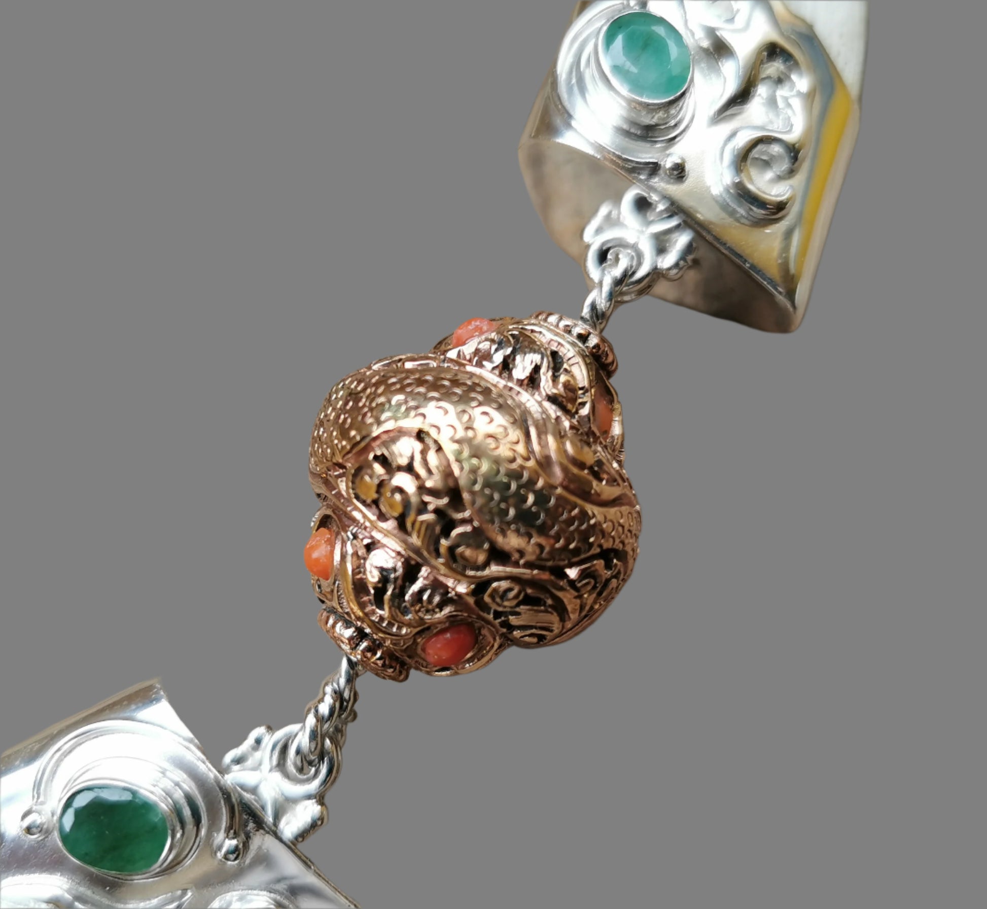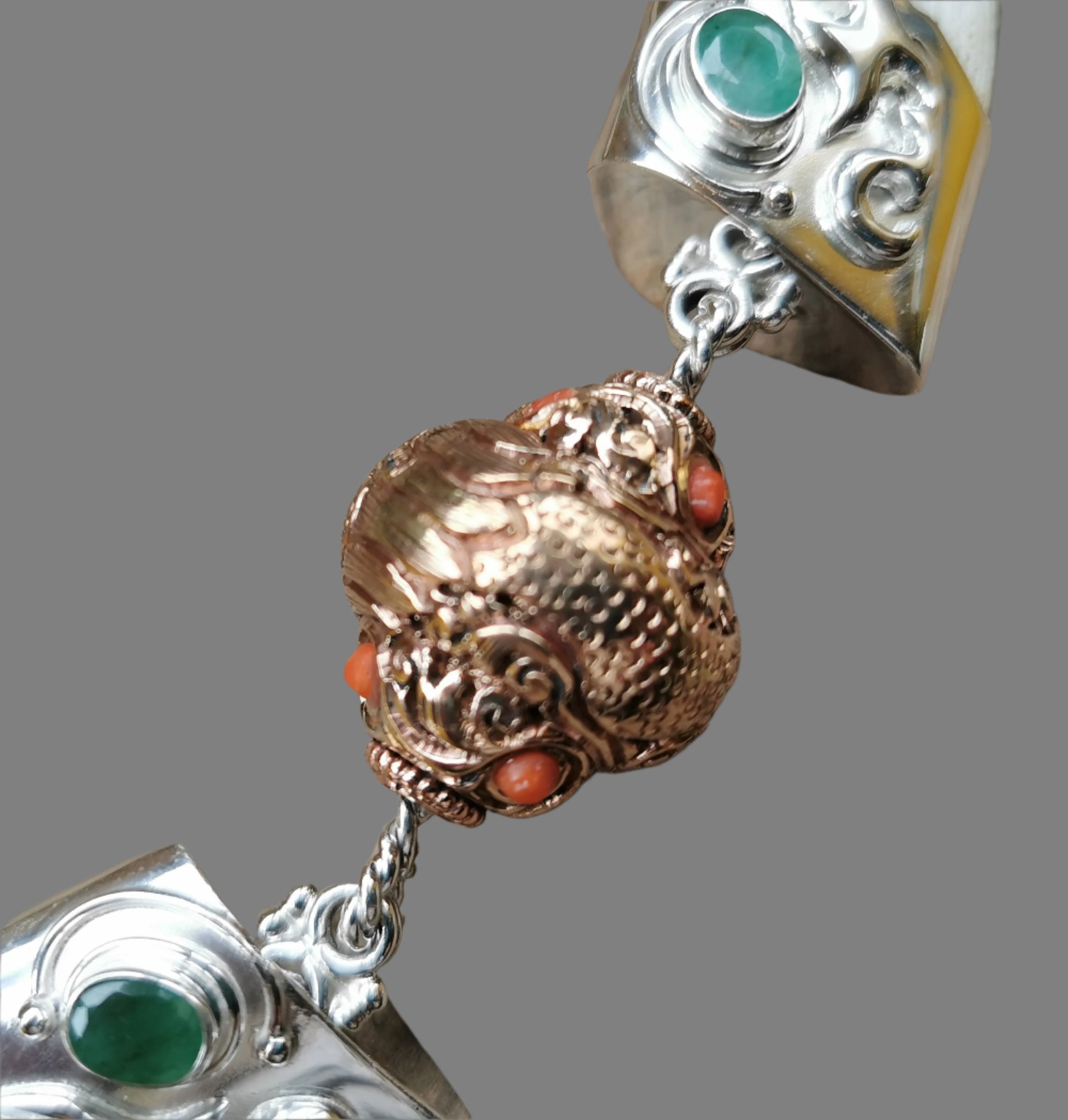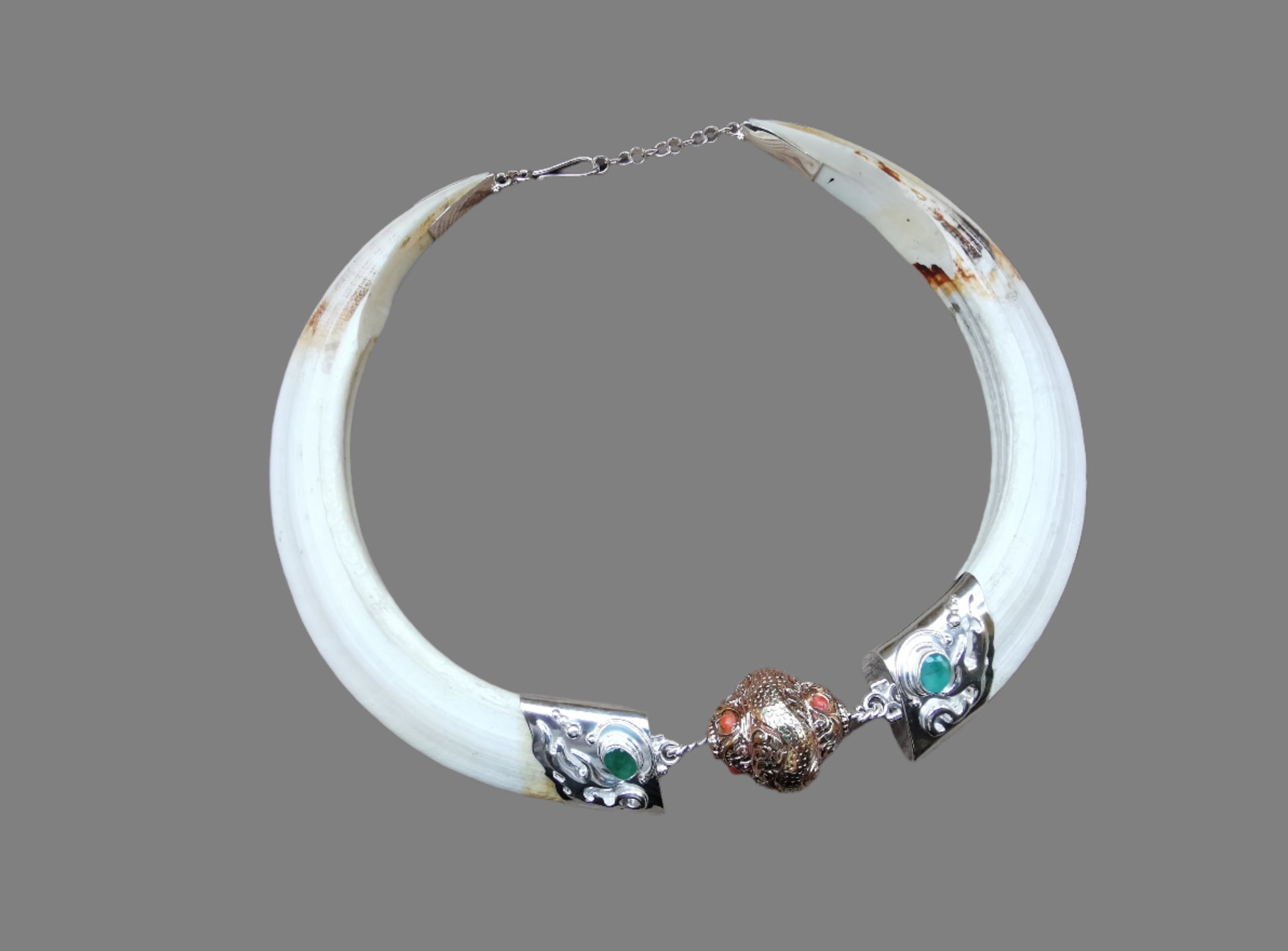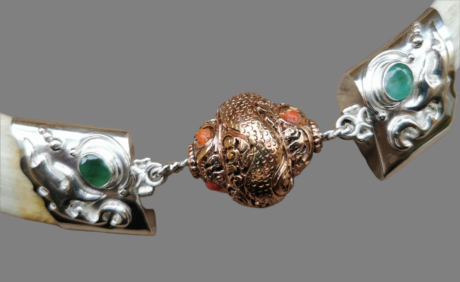 Ref.NC0039 - Ecologically sourced boar tusks necklace with dragon motif in copper, coral, and emerald gemstones.