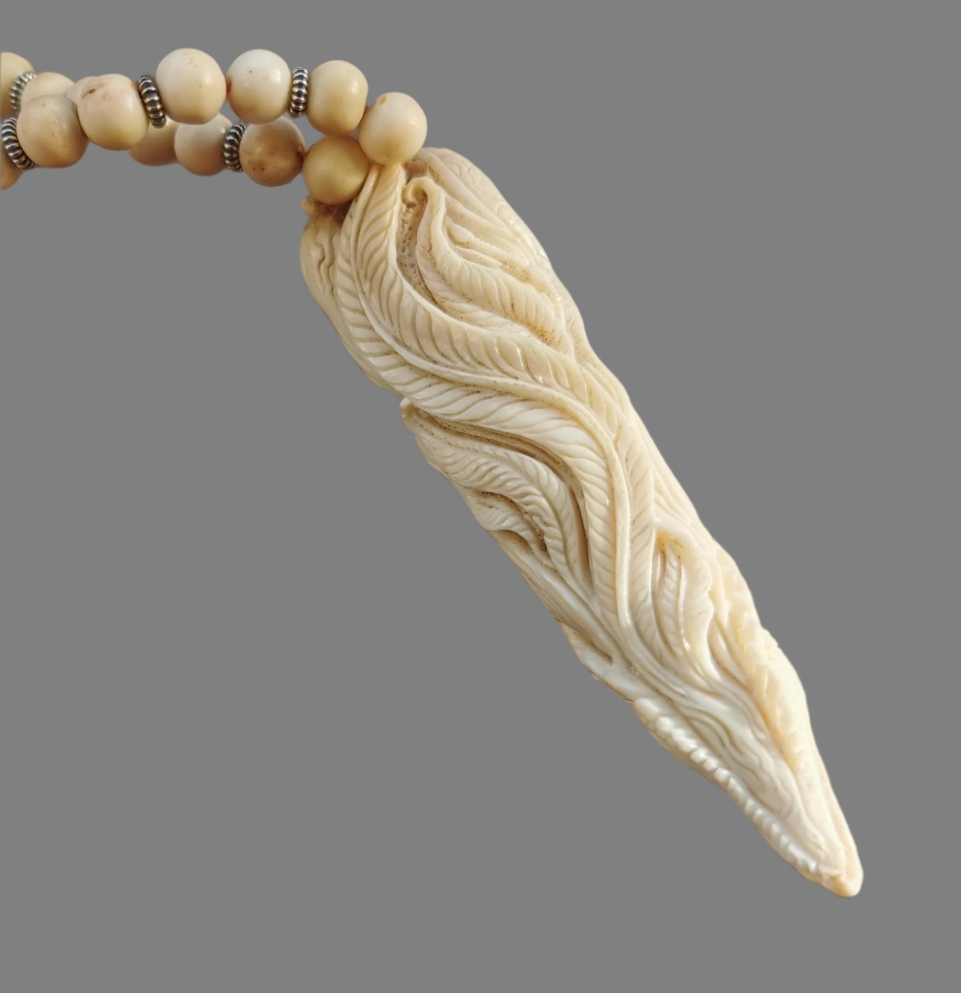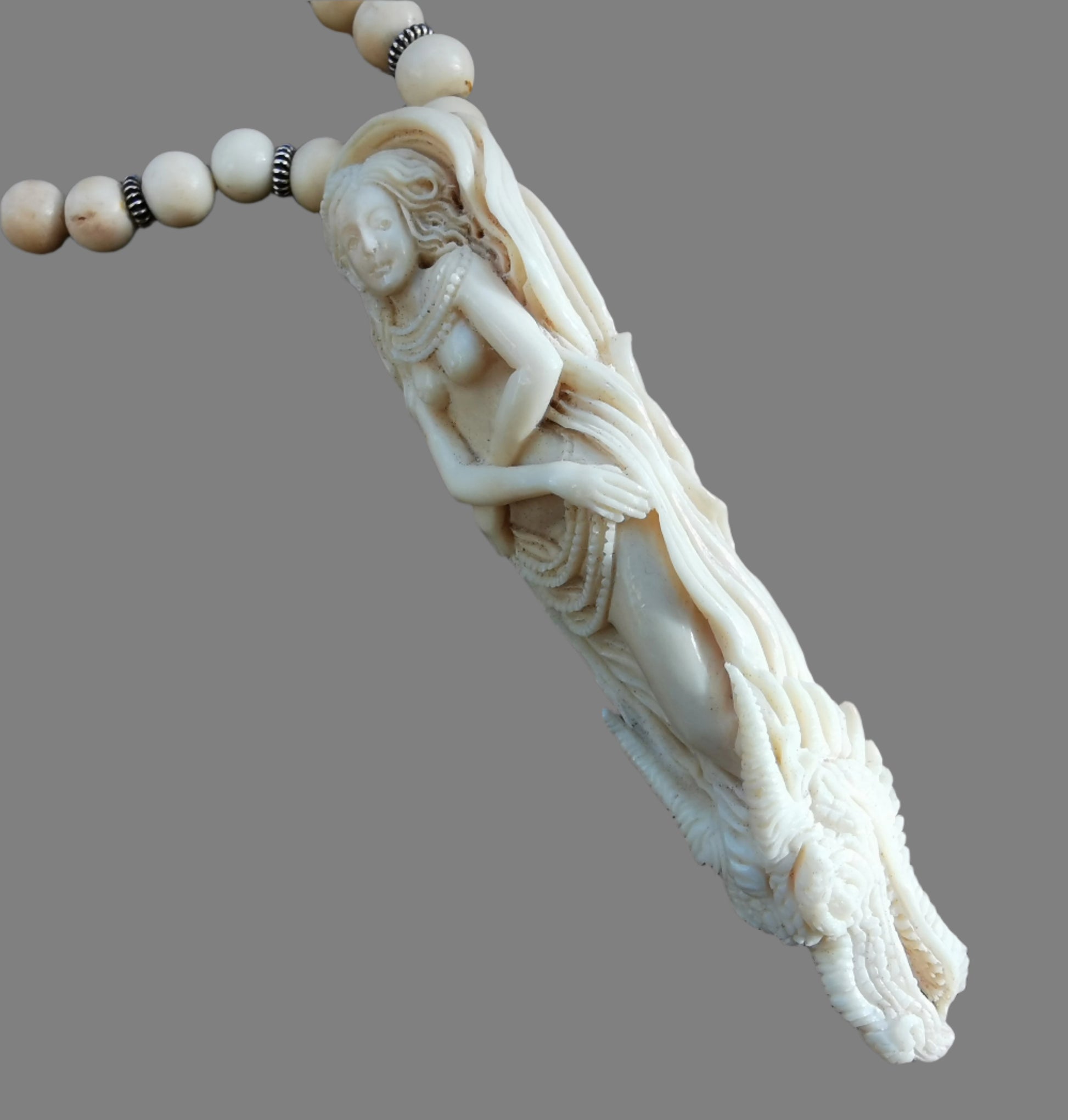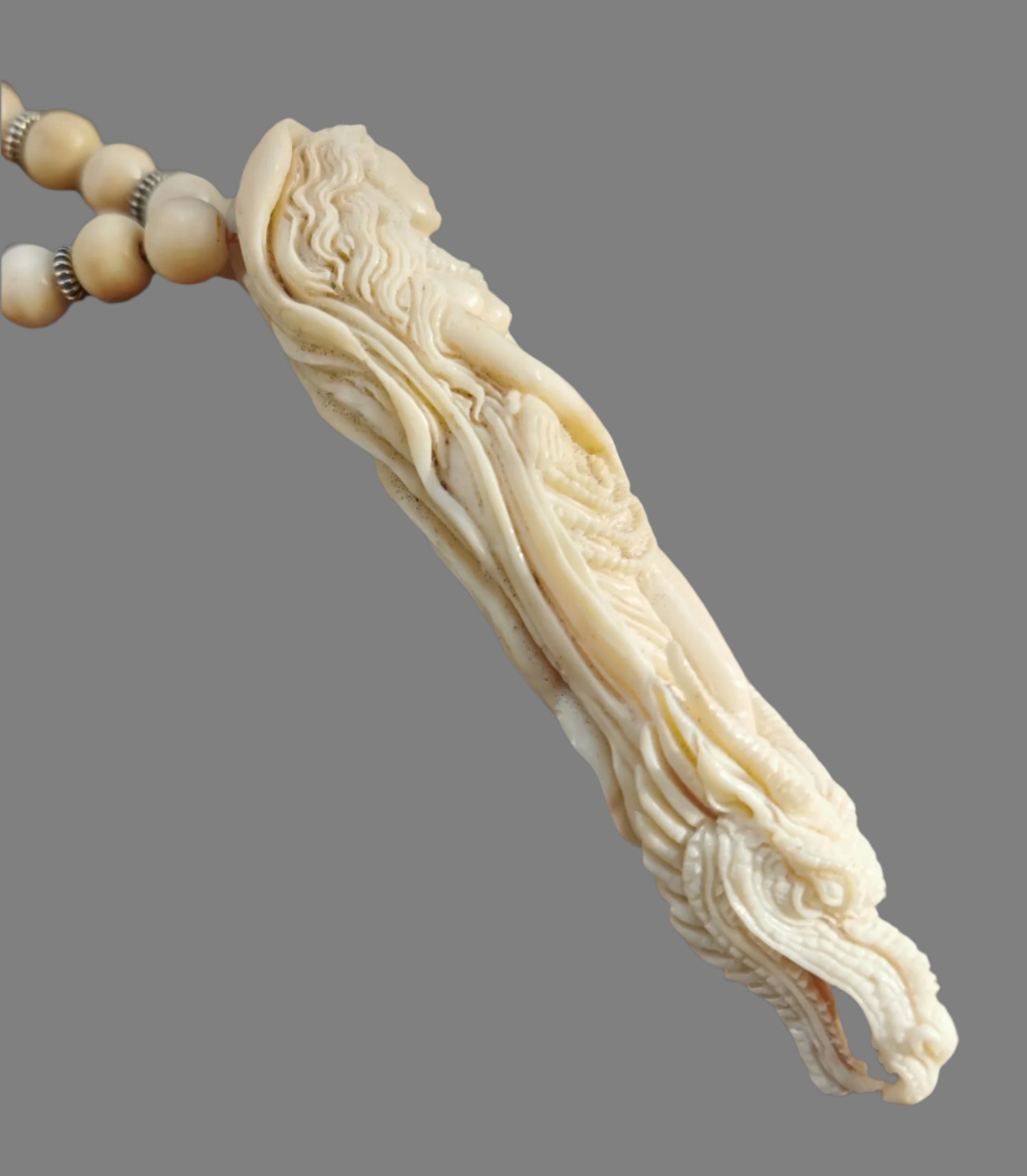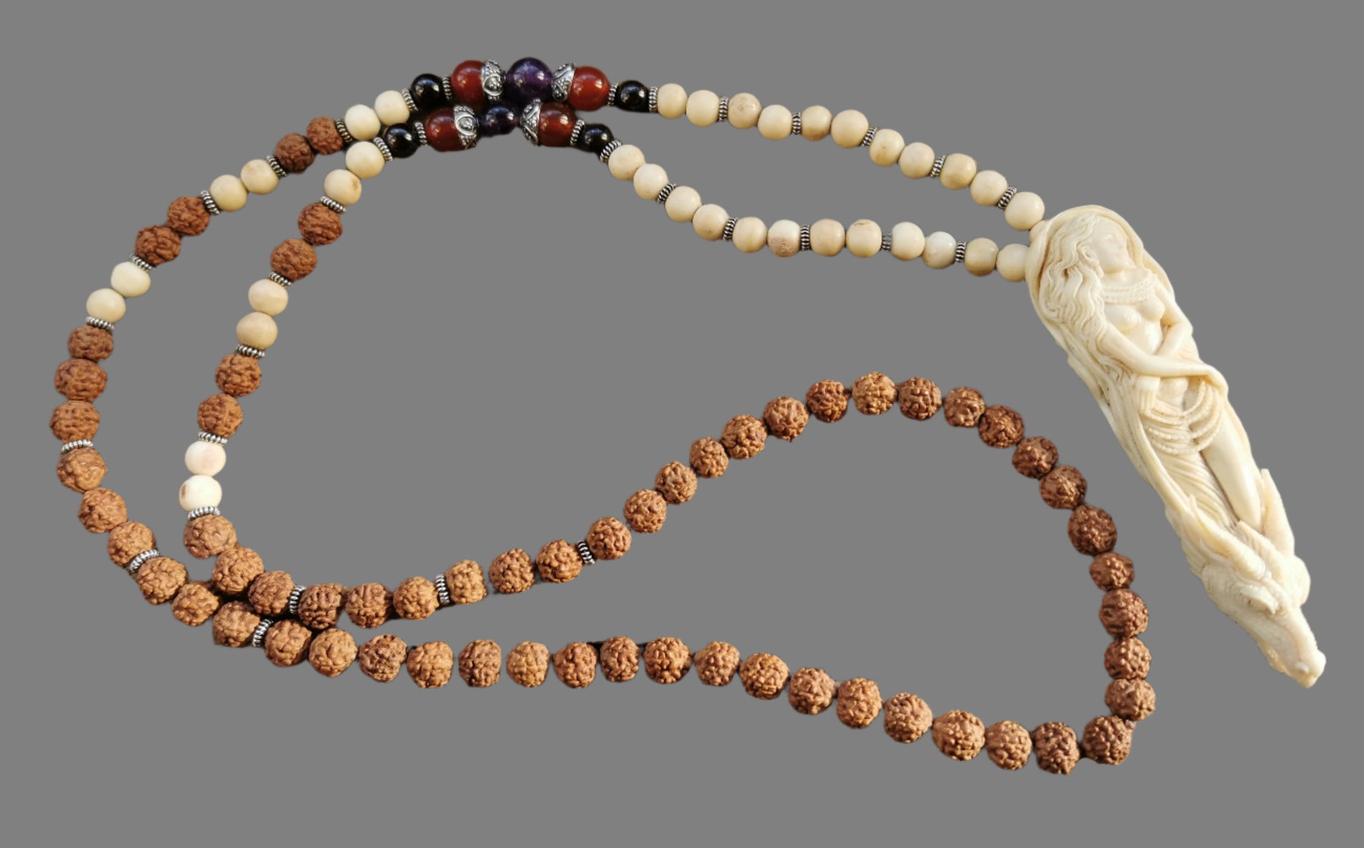 Ref.NC0041 - Necklace with ecologically sourced deer horn carved woman + dragon; beads: rudraksha seeds, ecologically sourced deer horn carved spheres, amethyst gemstones.