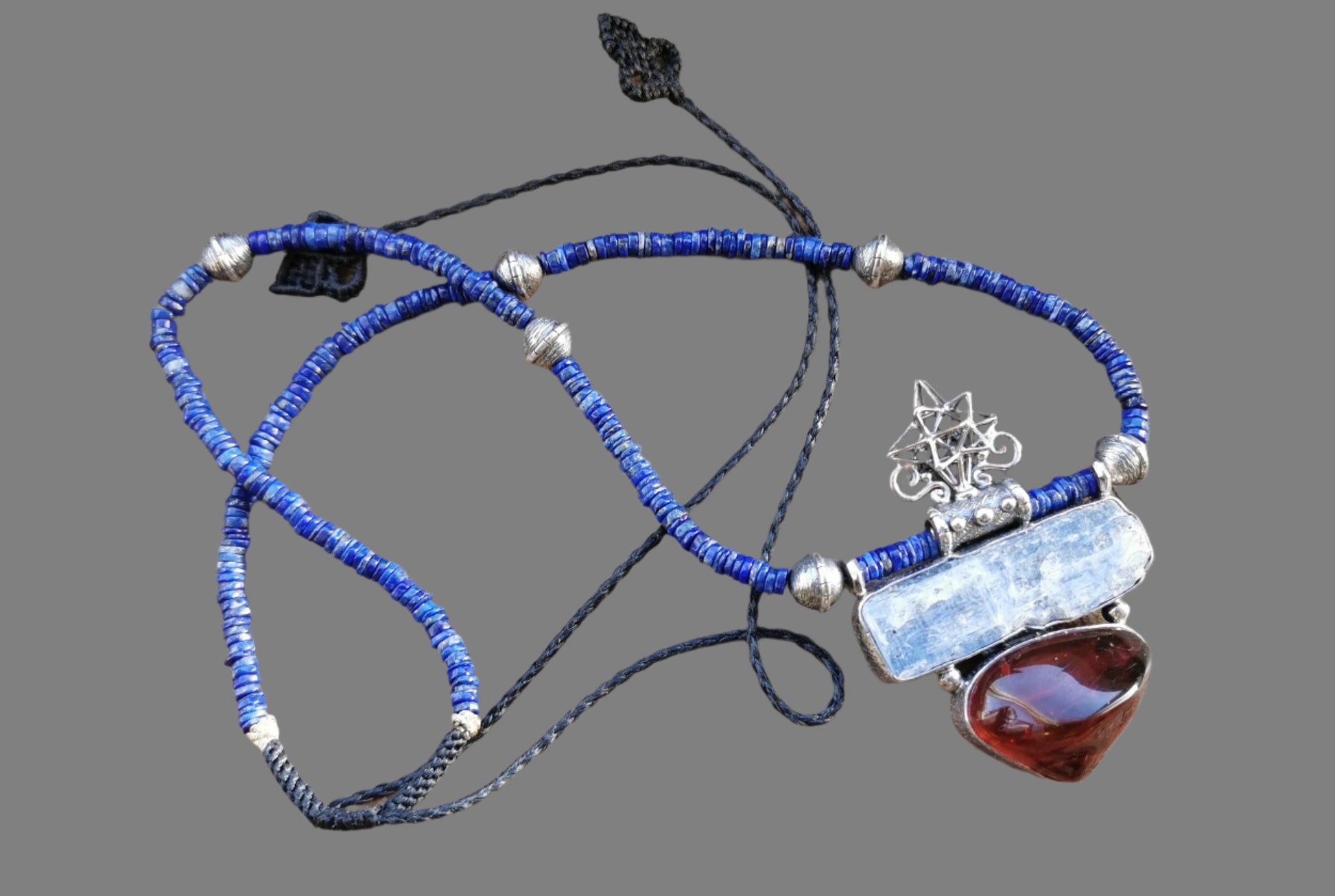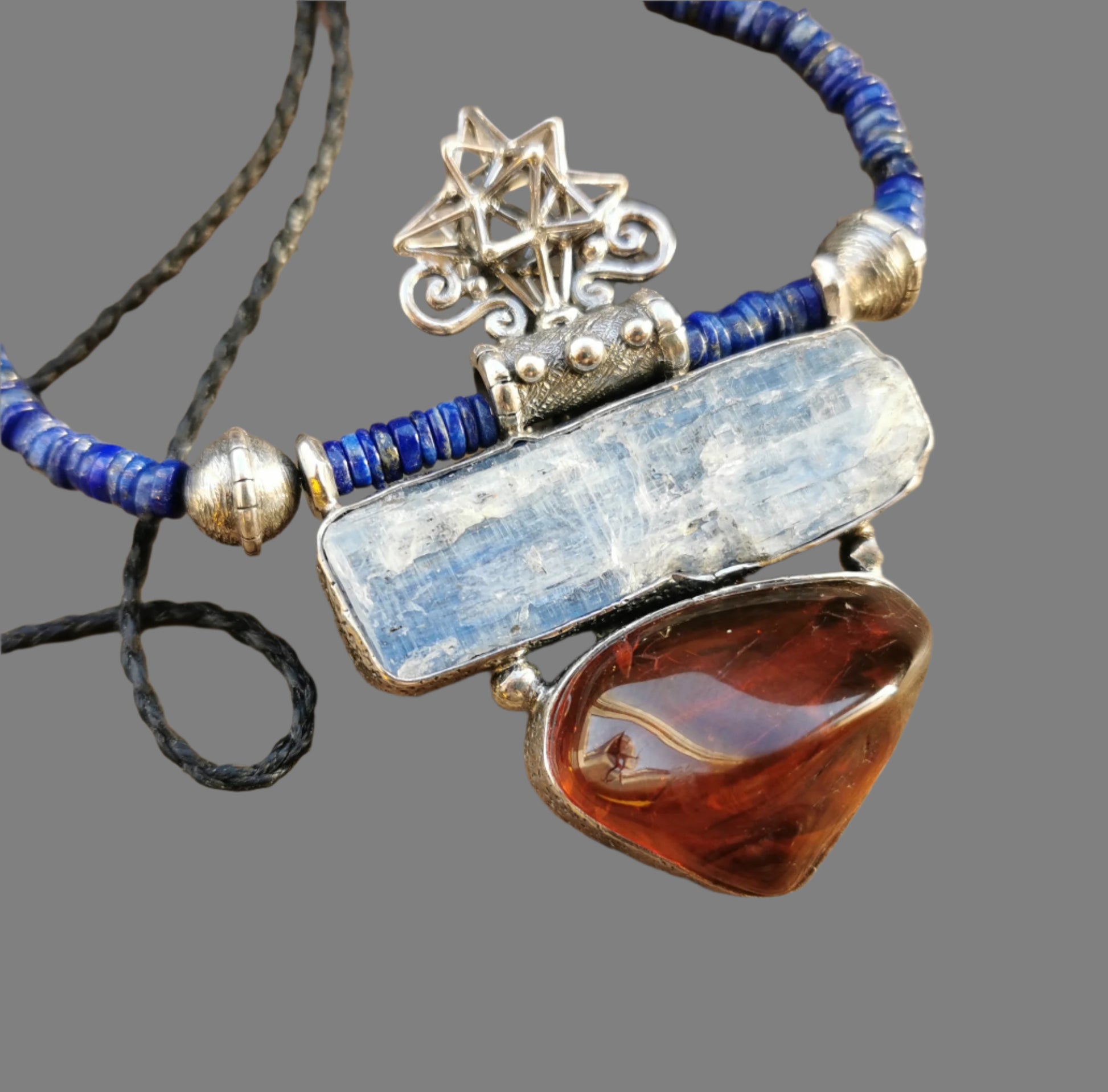 Ref.NC0043 - Necklace with silver Heart Star geometry, amber, kyanite, and lapis lazuli gemstones.
