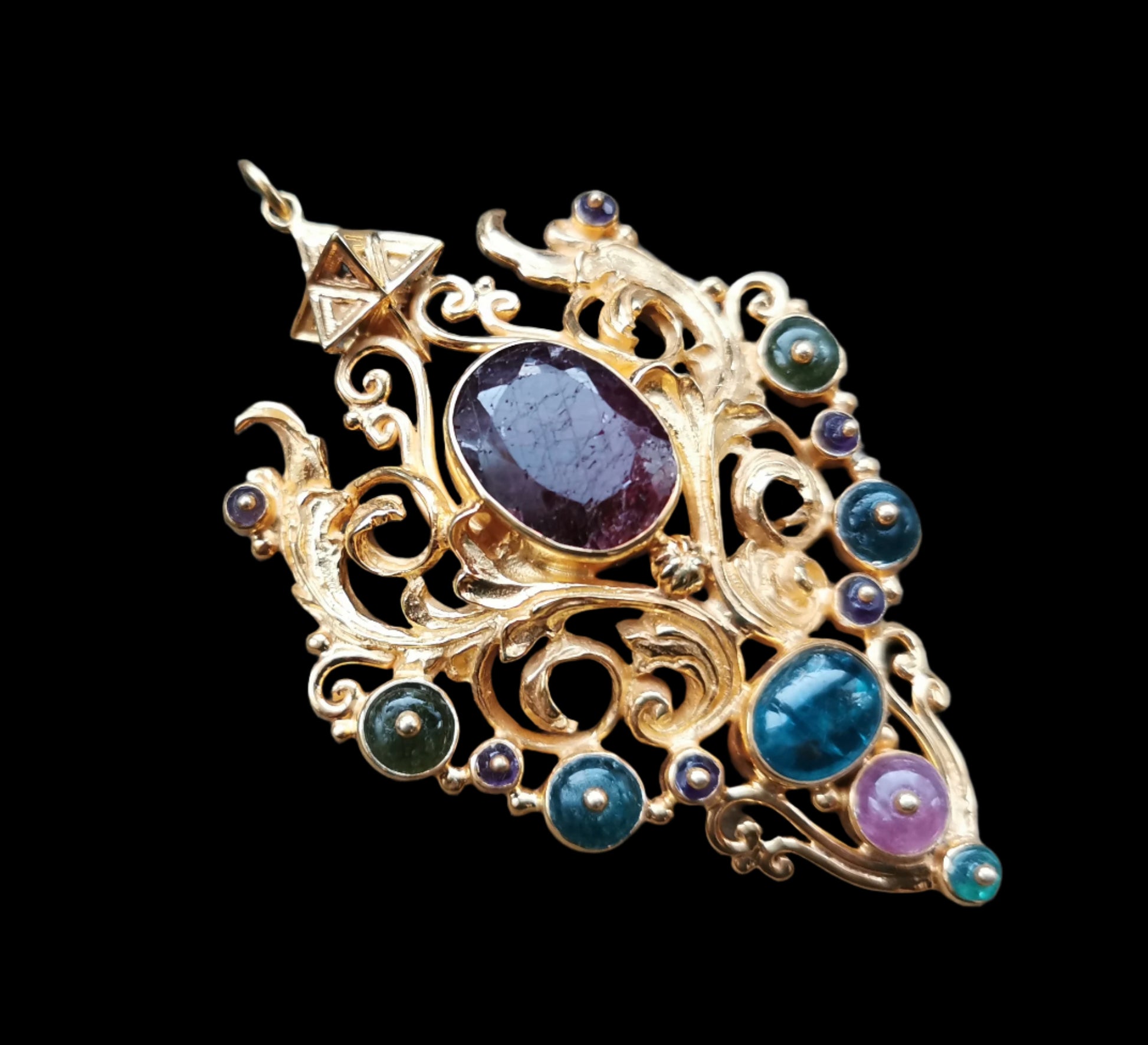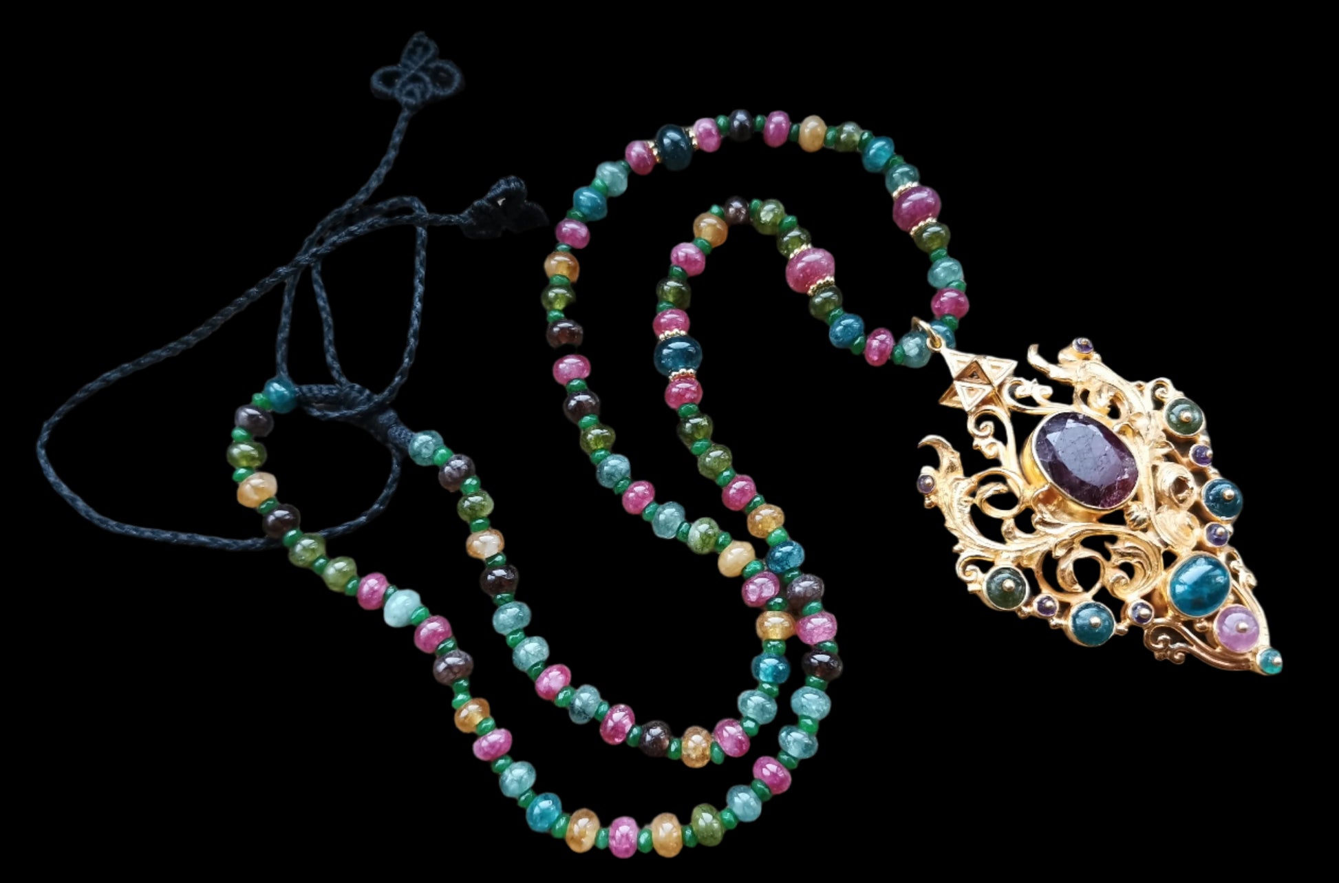 Ref.NC0046 - Necklace with solid gold plated on silver Tantric Star geometry, ruby, tourmaline, and sapphire gemstones; tourmaline beads.