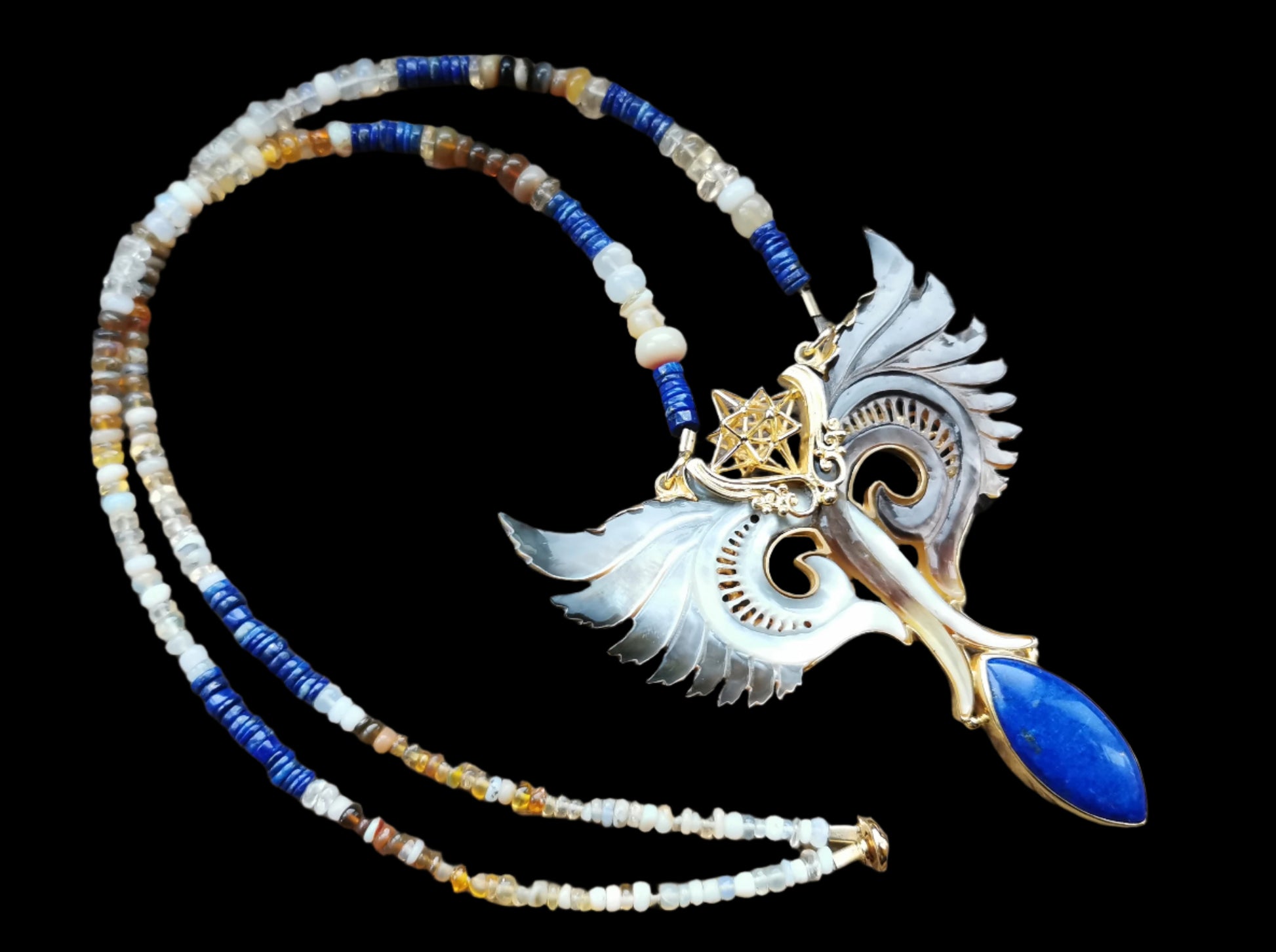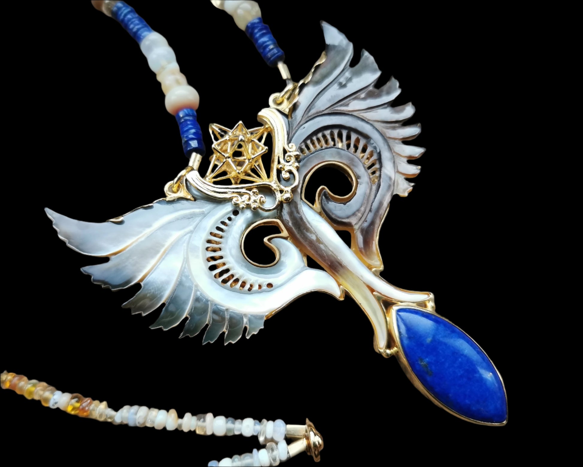 Ref.NC0048 - Necklace with gold plated on silver Heart Star geometry, mother of pearl carved wings, and lapis lazuli gemstone; opals, and lapis lazuli beads.