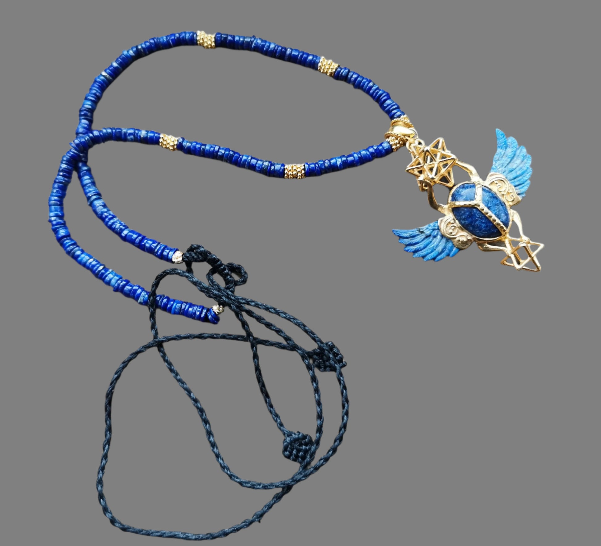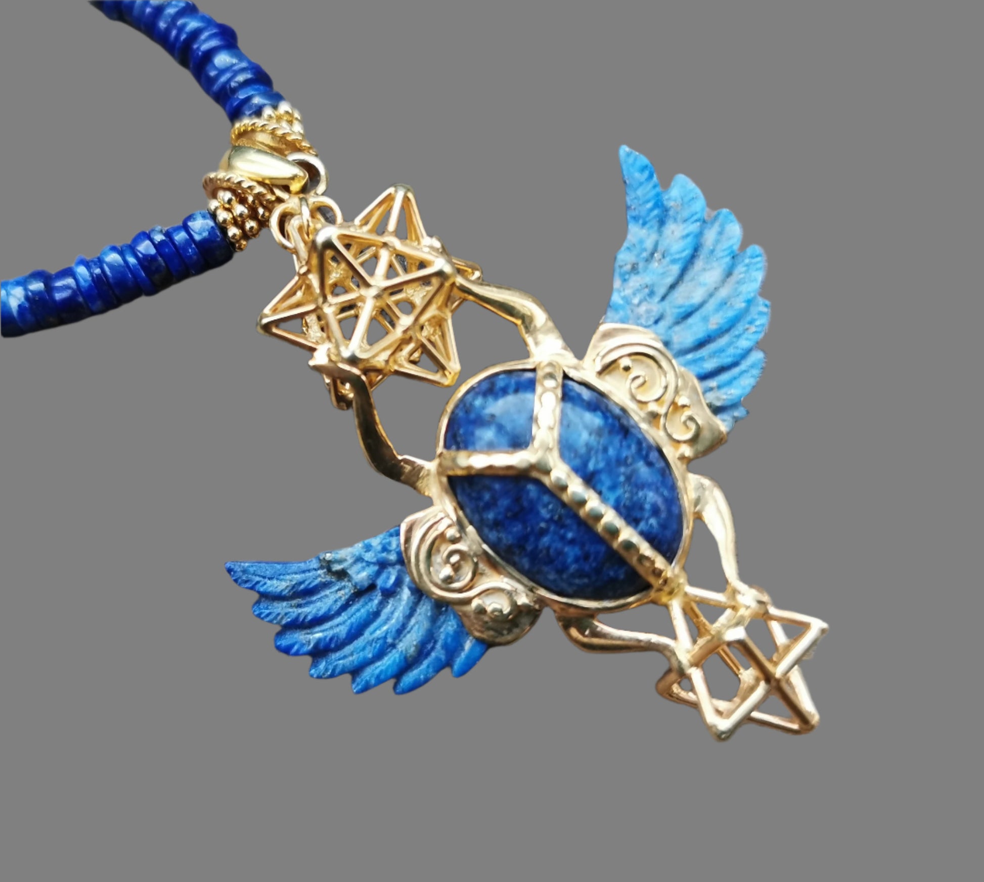 Ref.NC0050 - Necklace with gold plated on silver Solar Star & Star Tetrahedron geometries; scarab, wings, and beads made of lapis lazuli gemstones.