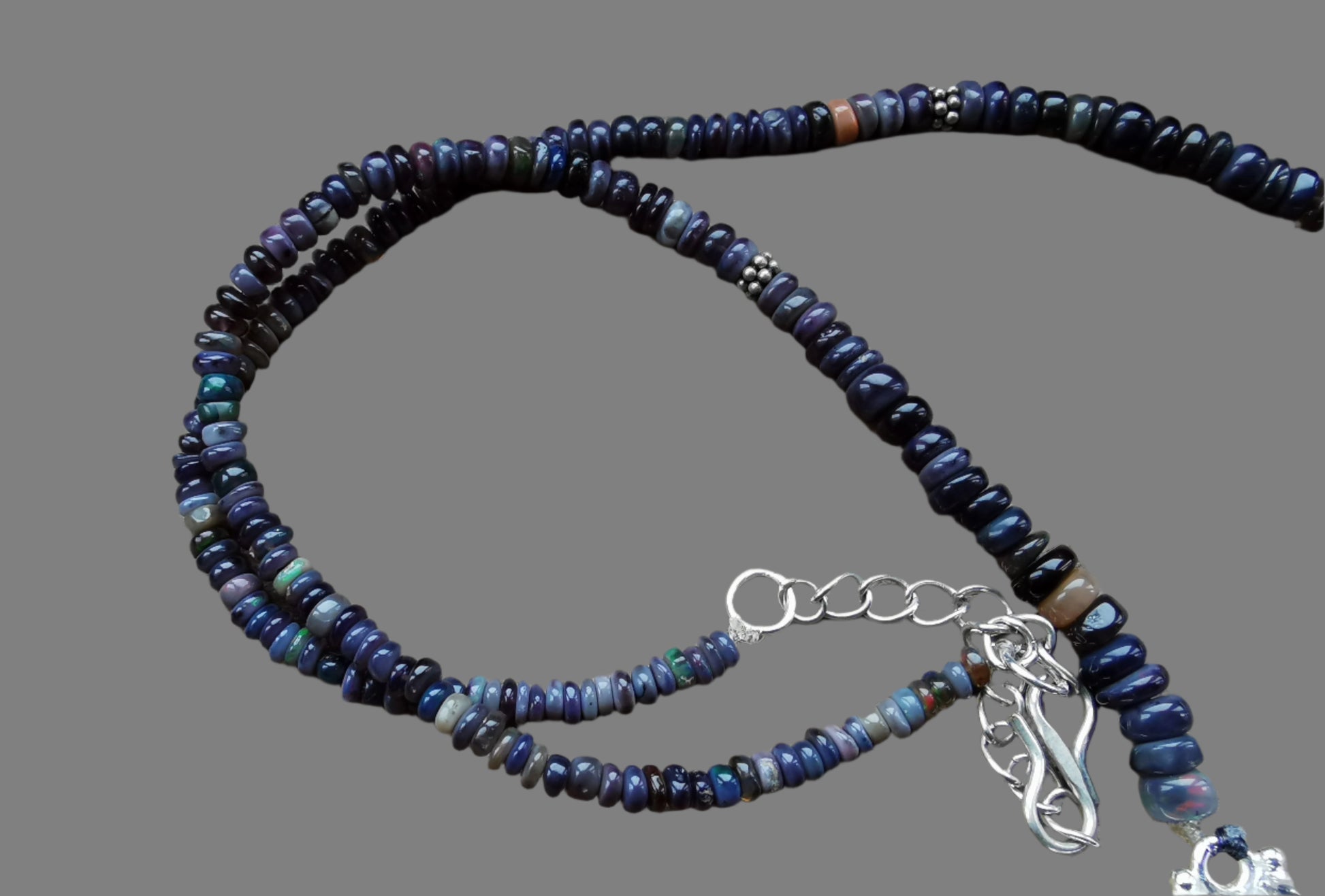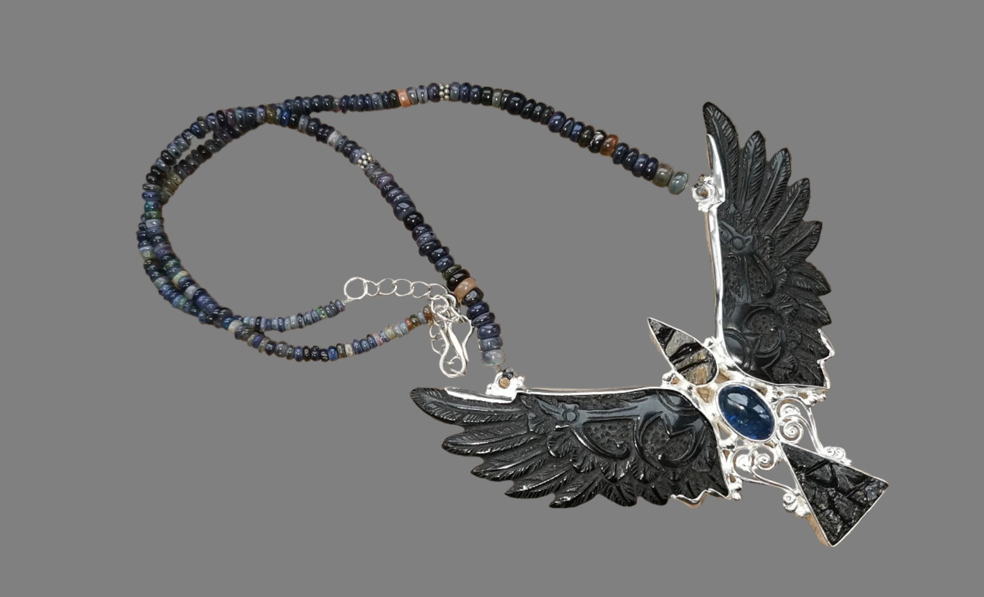 Ref.NC0053 - Silver necklace with eagle motif, Arang carved wings, and kyanite+light obsidian gemstones body; beads: black opal gems.