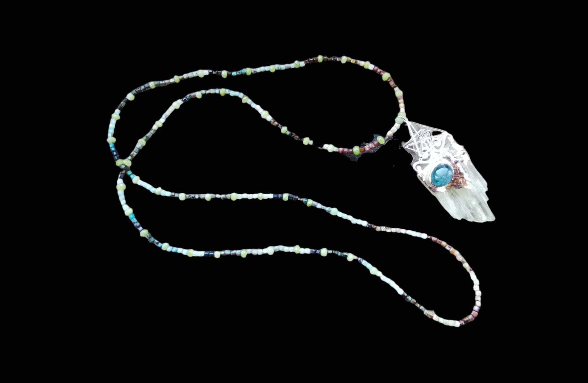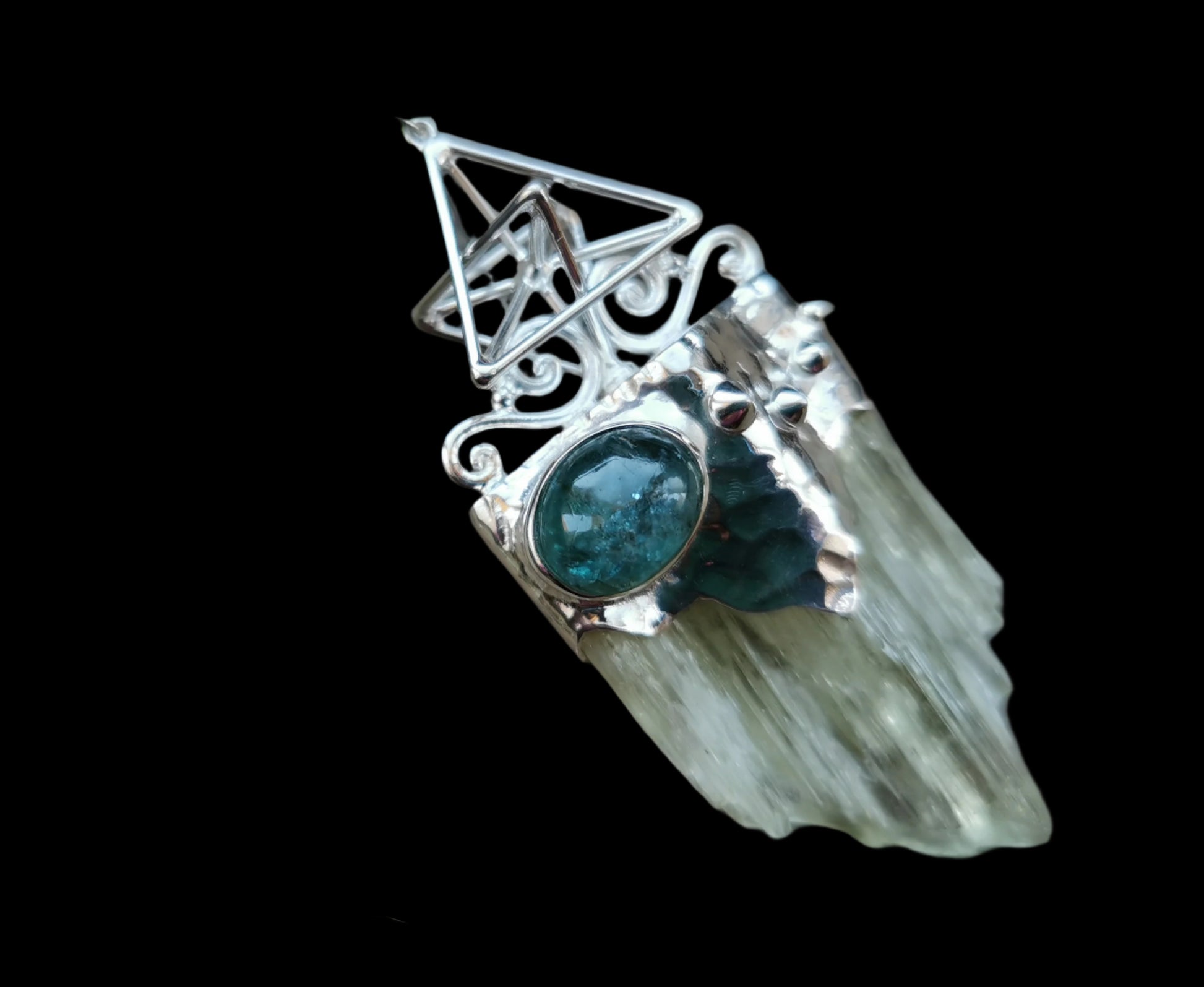 Ref.NC0055 - Silver necklace with Hyper Tetrahedron geometry, kunzite, and kyanite gemstones; aquamarine, turquoise, and jasper beads.