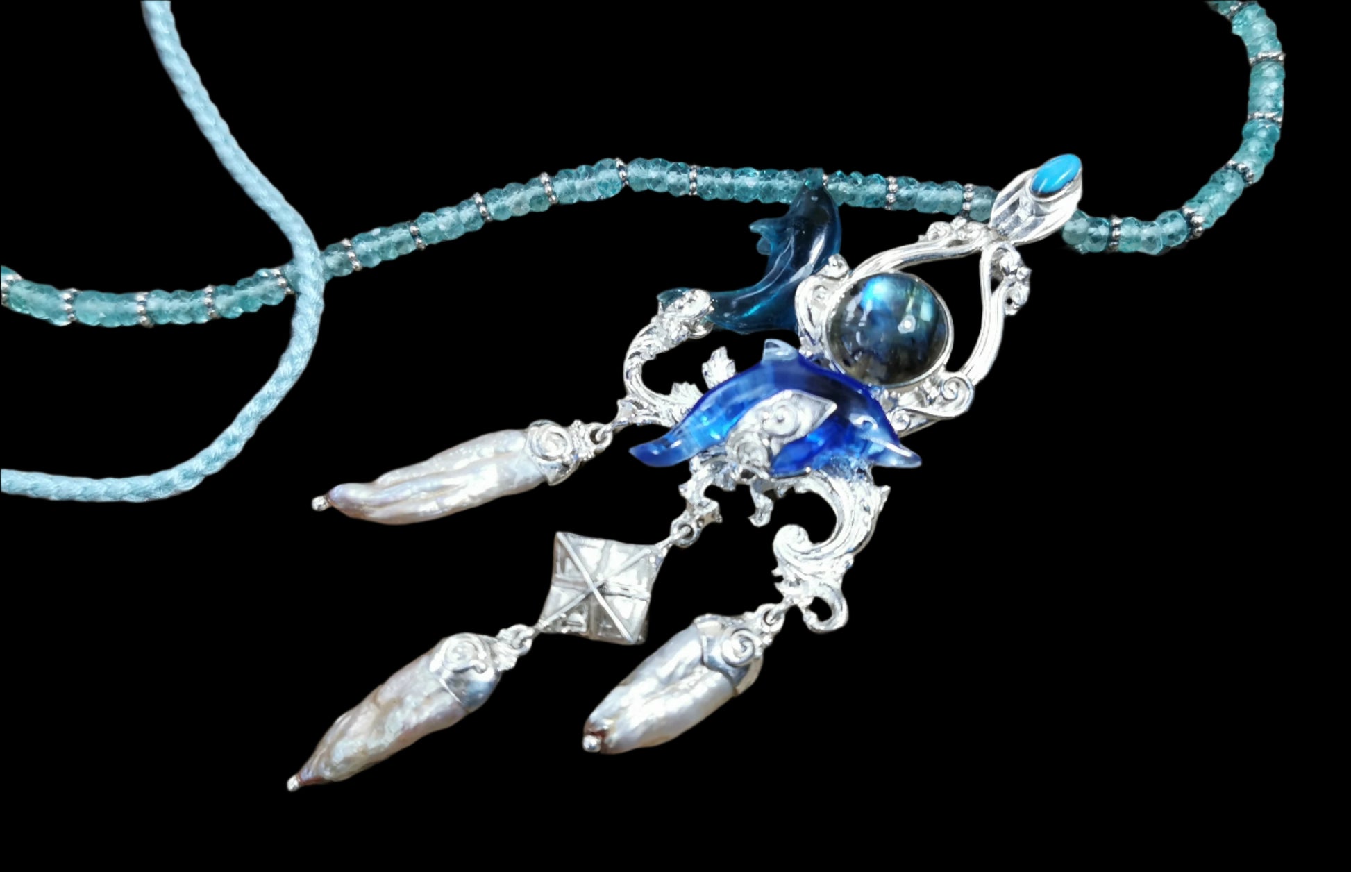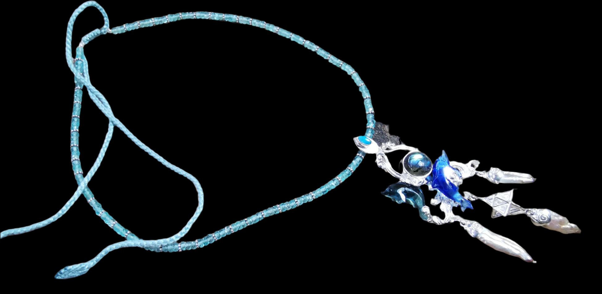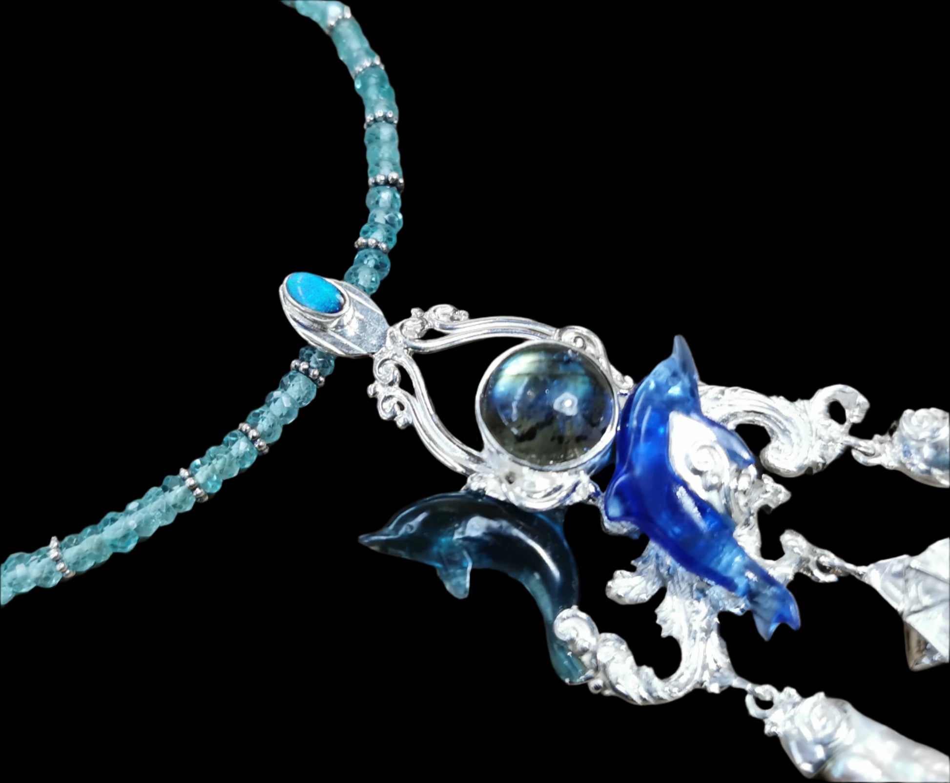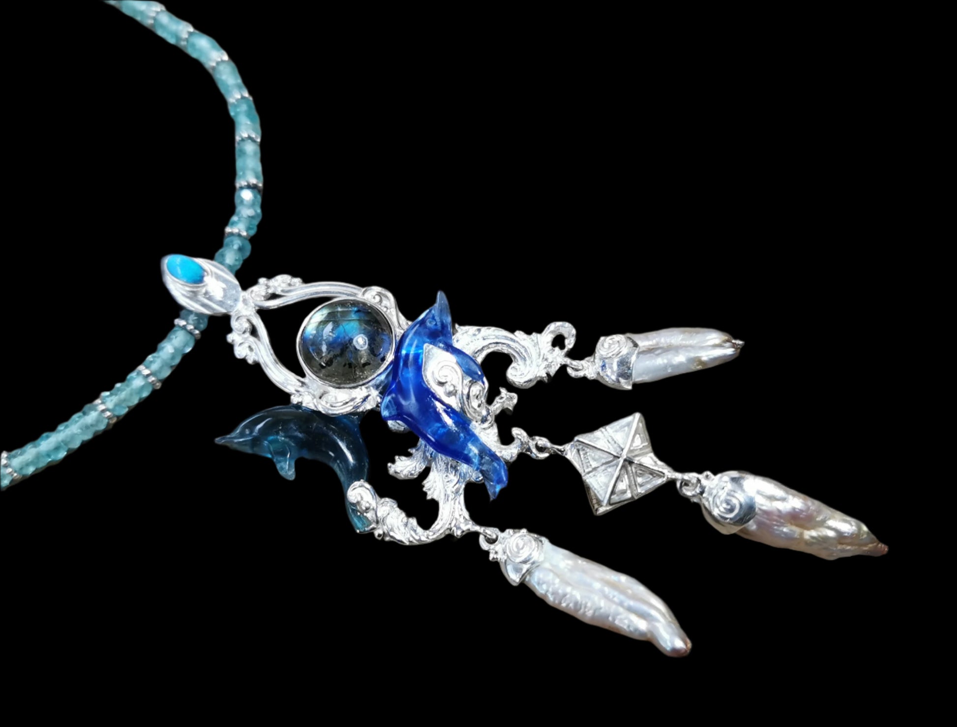 Ref.NC0056 - Necklace with solid silver Tantric Star geometry, blue dolphins, fresh water pearls, labradorite, and opal gemstones; beads: aquamarine gems.