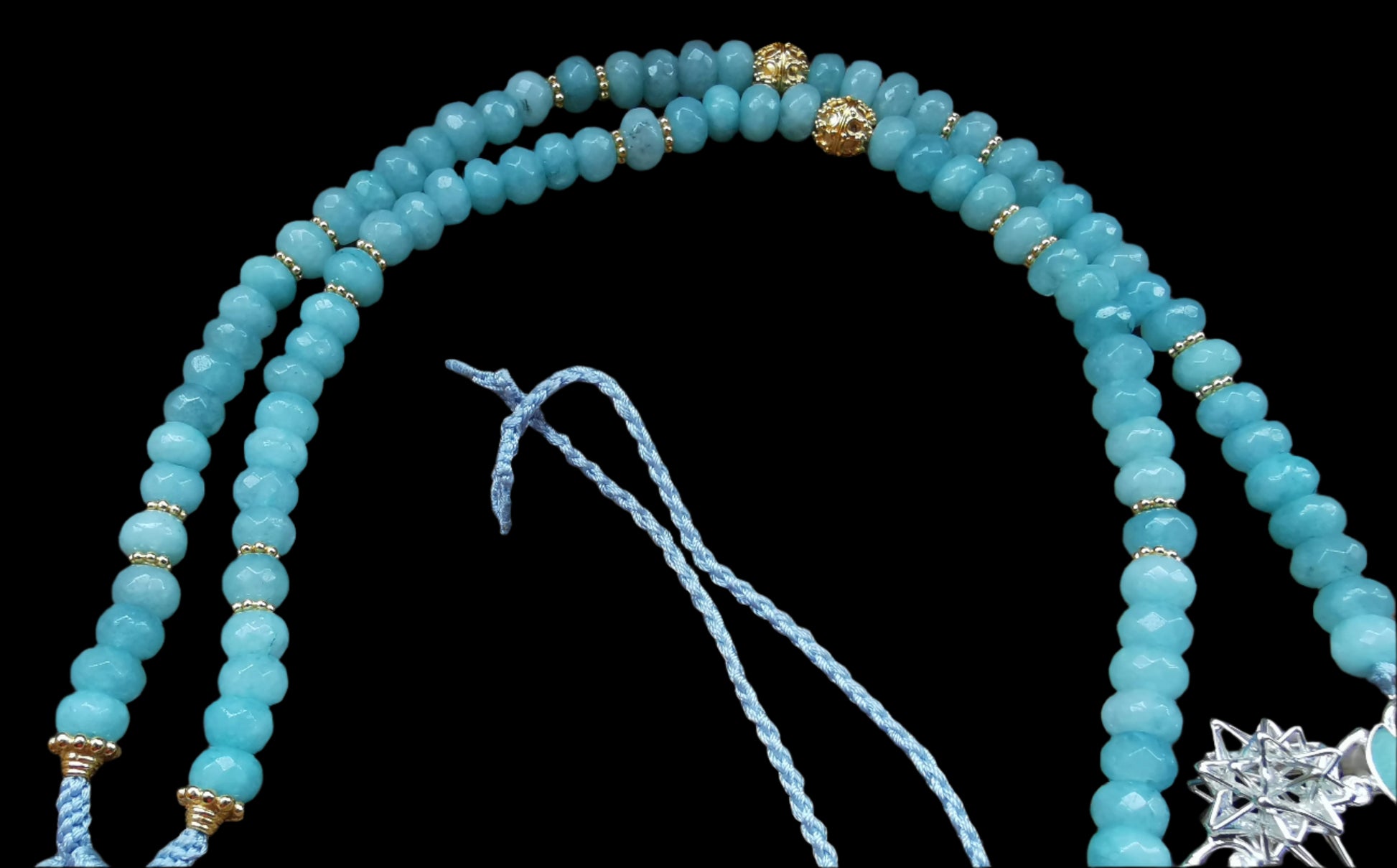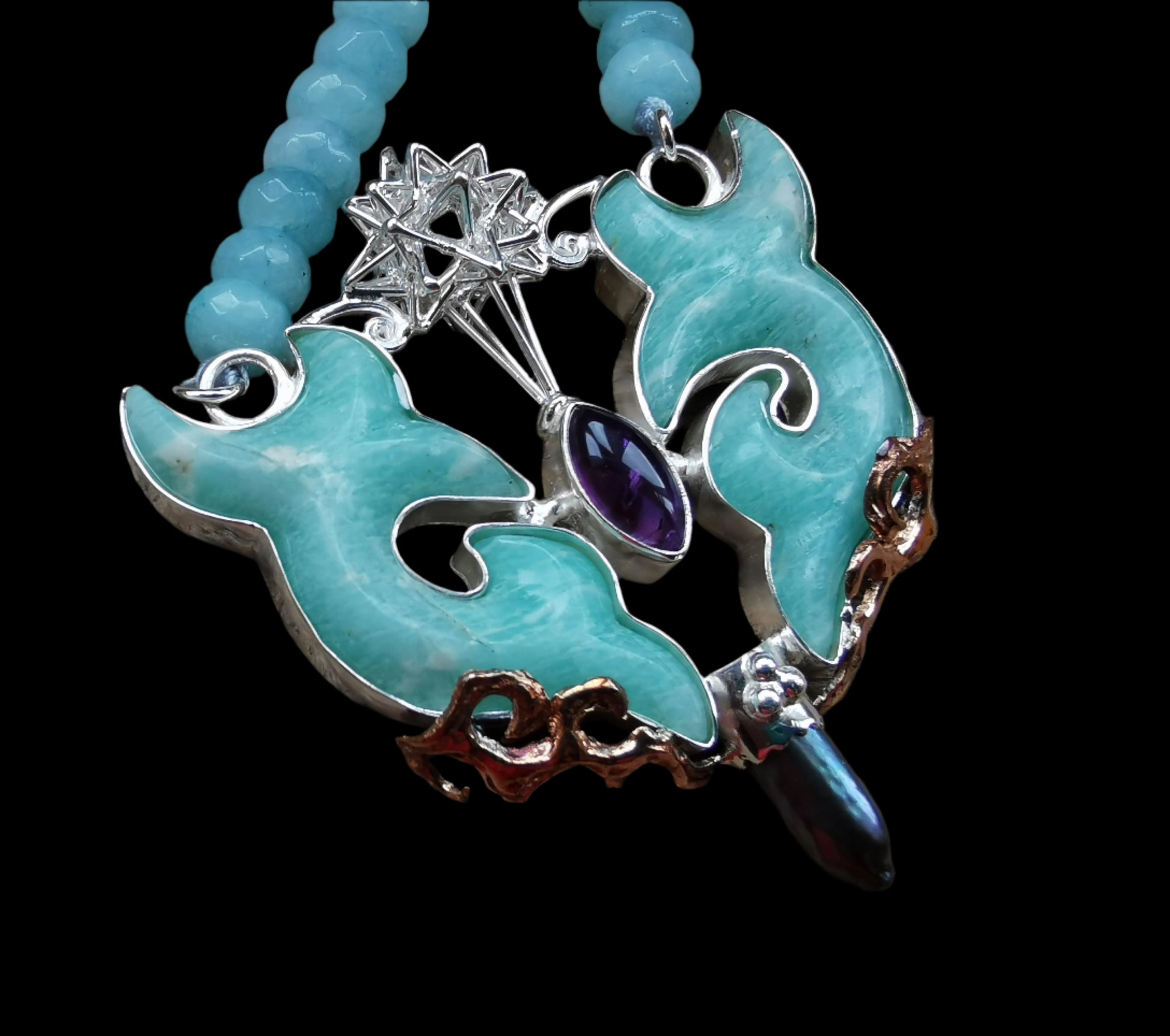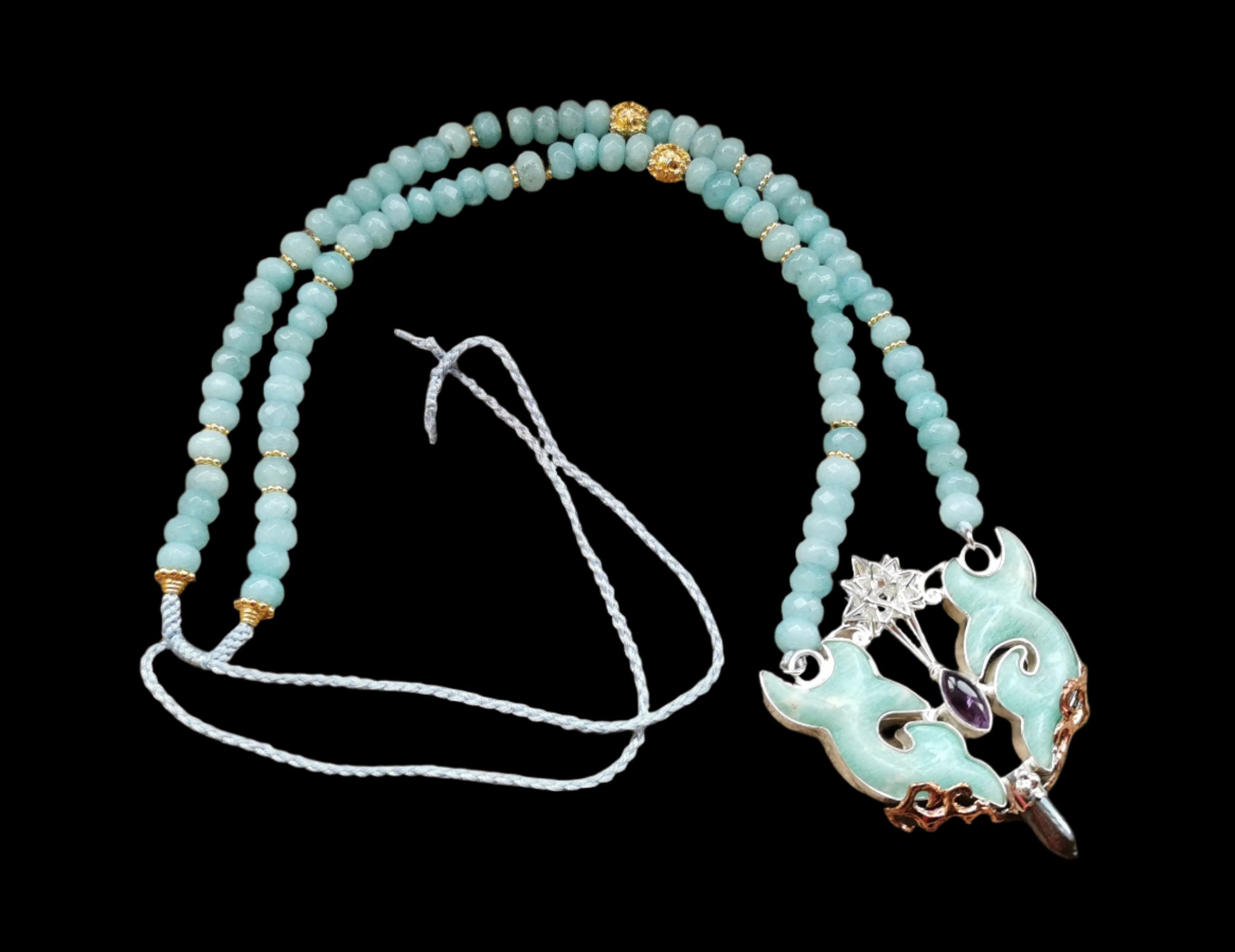 Ref.NC0060 - Necklace with silver Star Light geometry, copper setting, sweet water black pearl, aquamarine, and amethyst gemstones; aquamarine beads with gold plated on silver spacers & spheres.