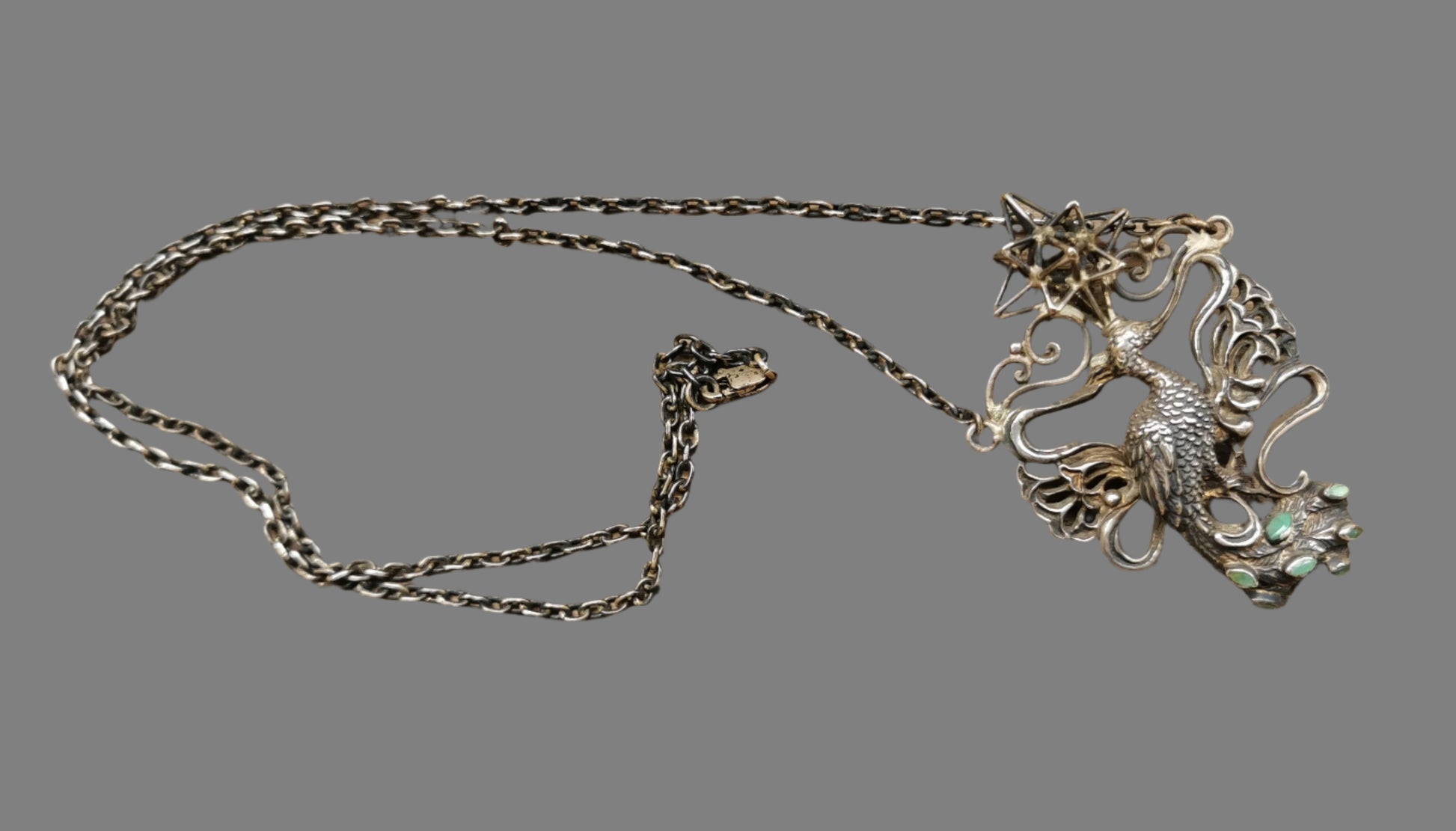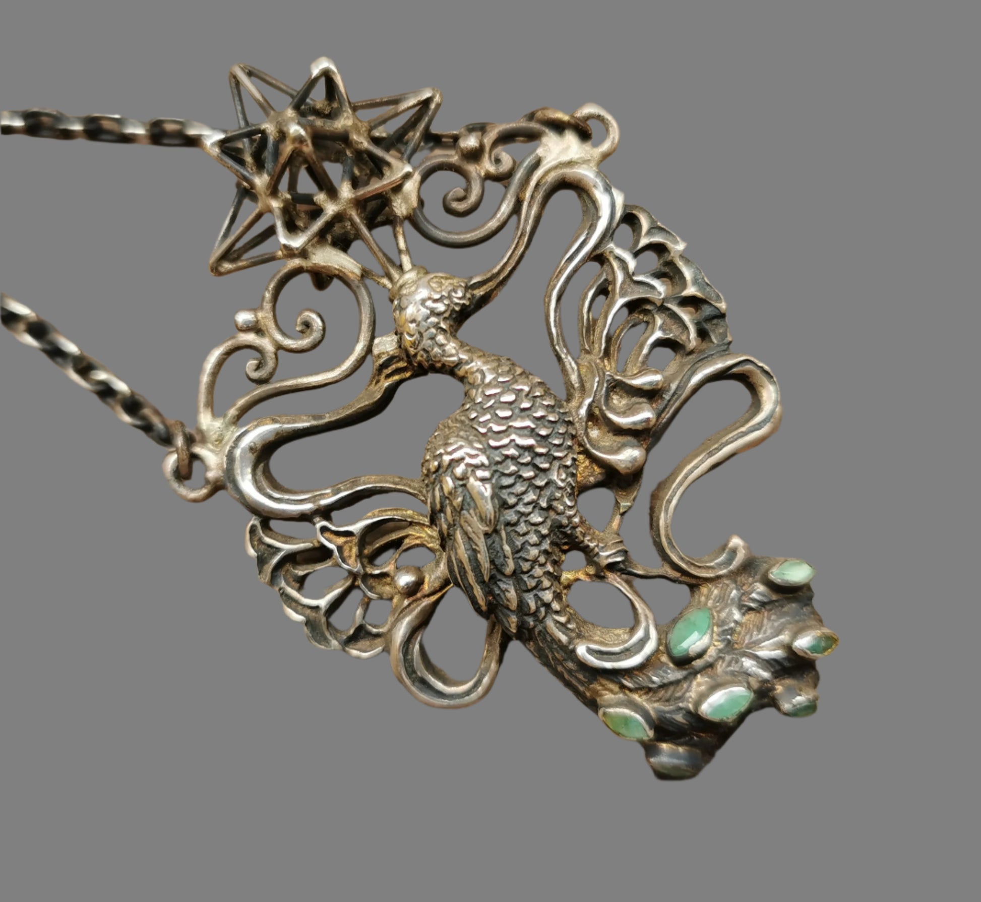Ref.NC0063 - Silver necklace with Heart Star geometry, peacock motif, and emerald gems.