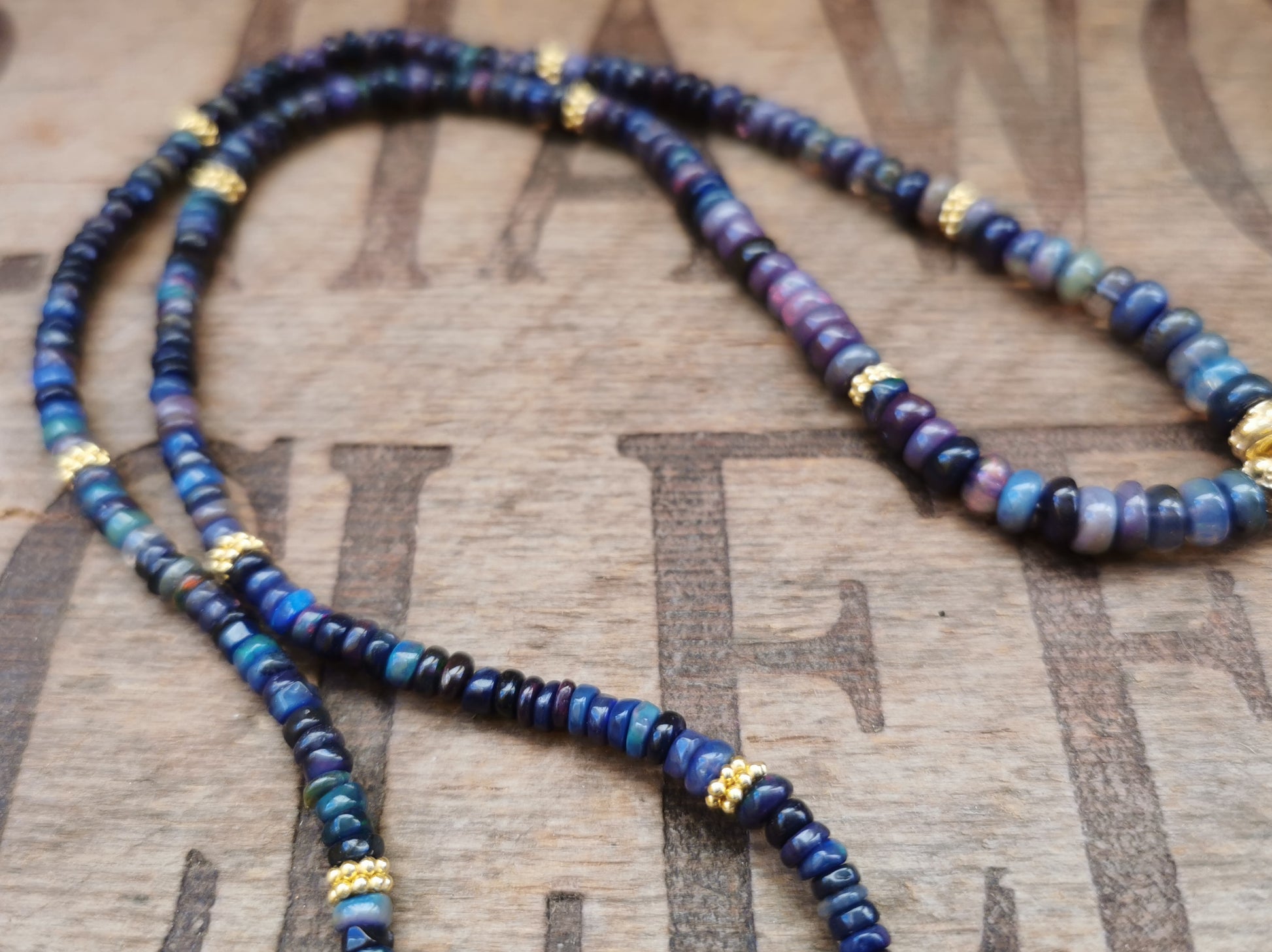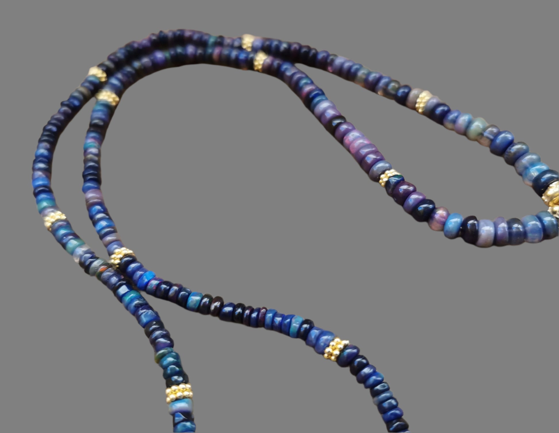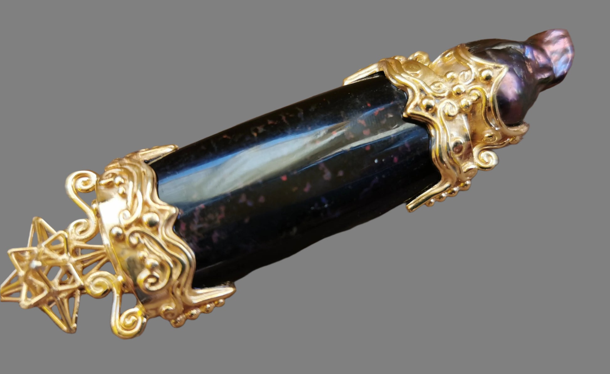 Ref.NC0065 - Necklace with gold plated on silver Heart Star geometry, Javanese fossil wood opal gem, and sweet water black pearls; beads: black Ethiopian opals.