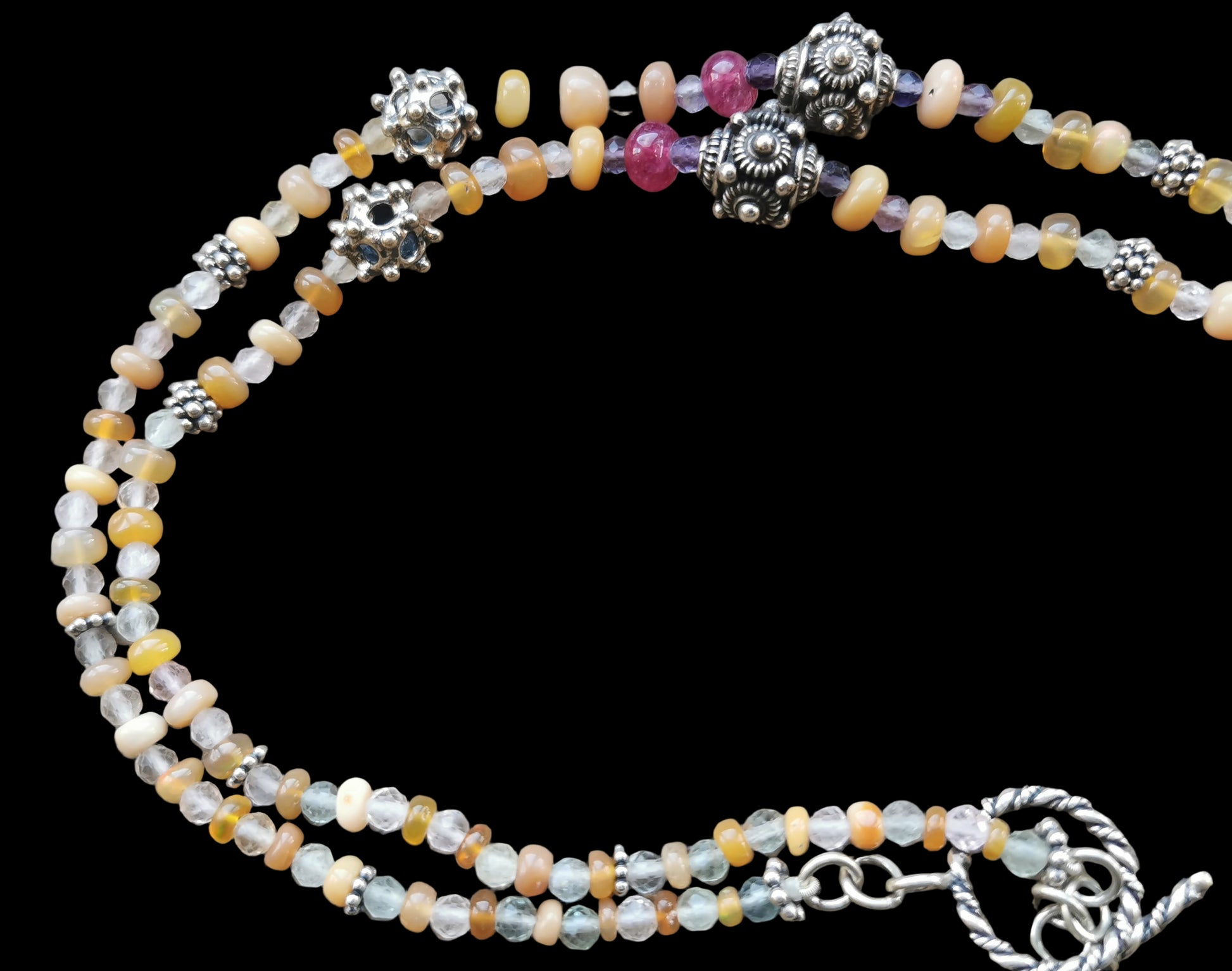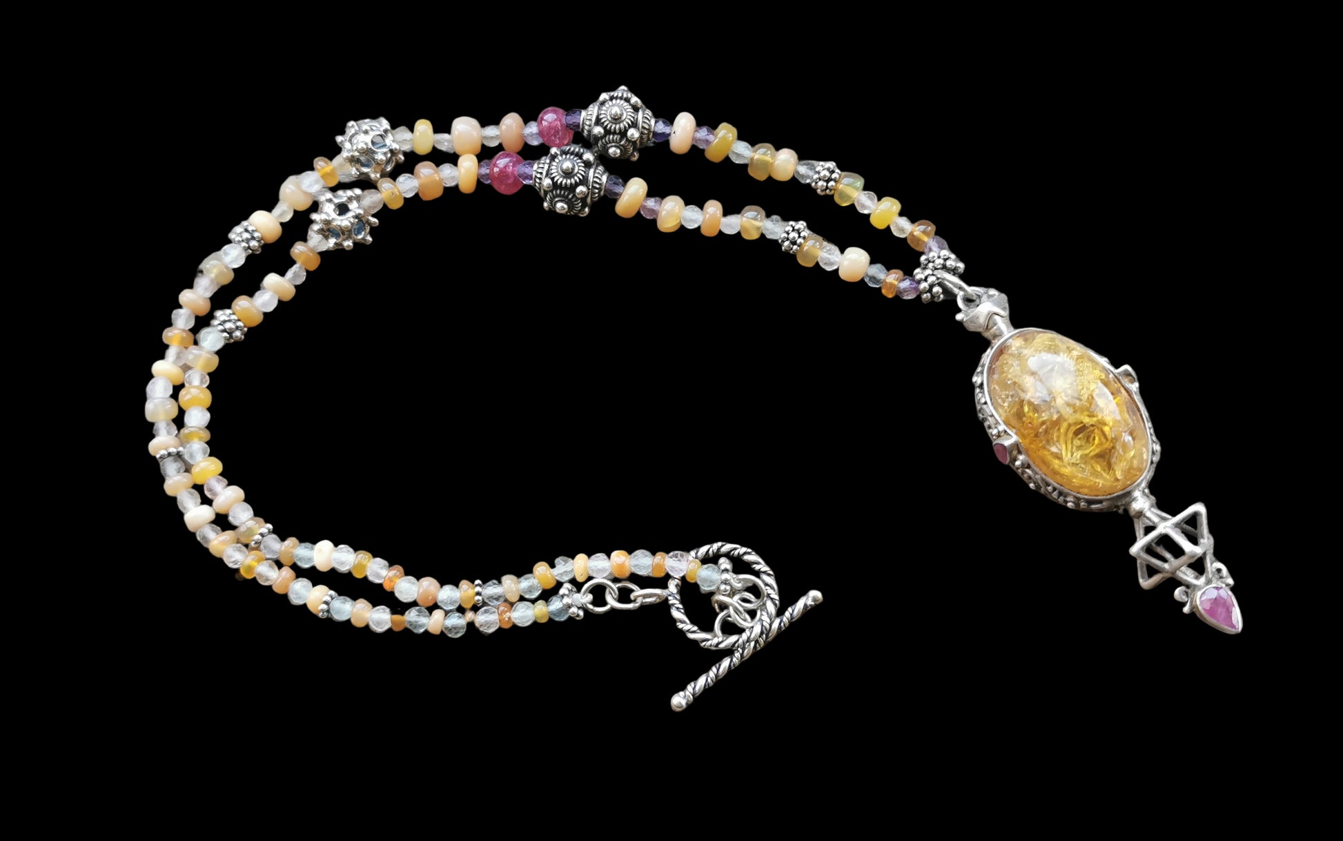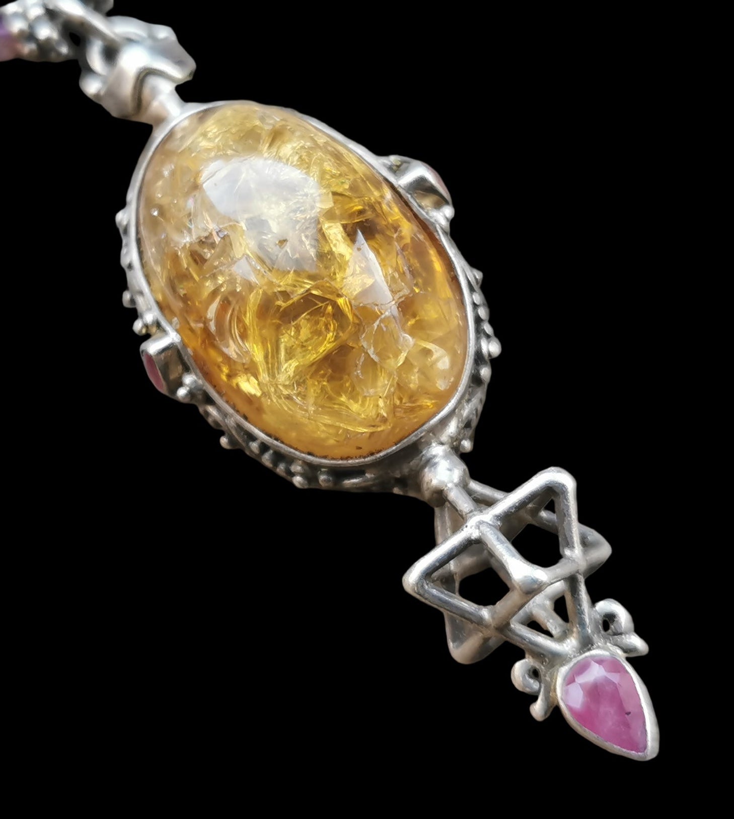 Ref.NC0073 - Necklace with silver Star Tetrahedron geometry, opals & ruby gems.