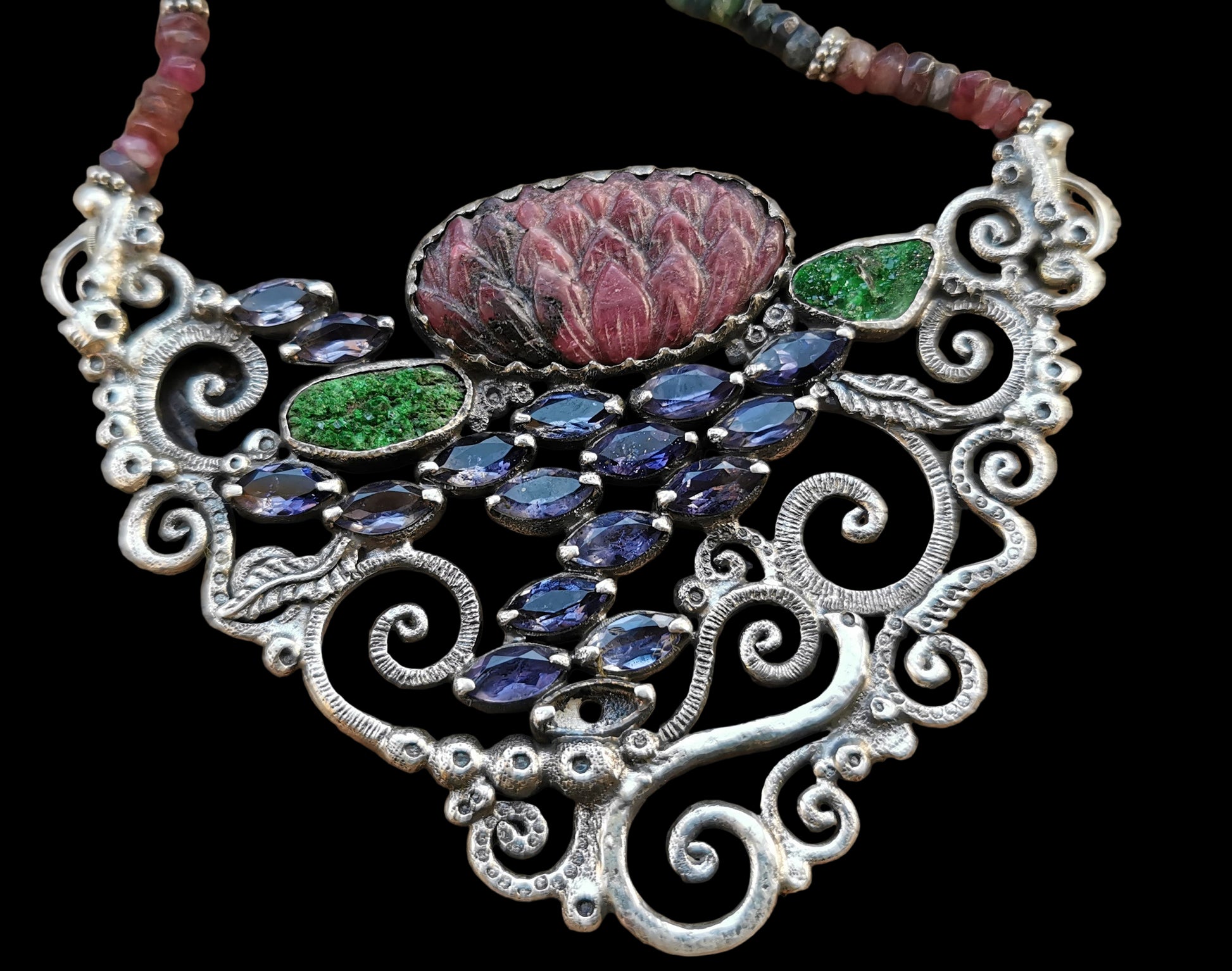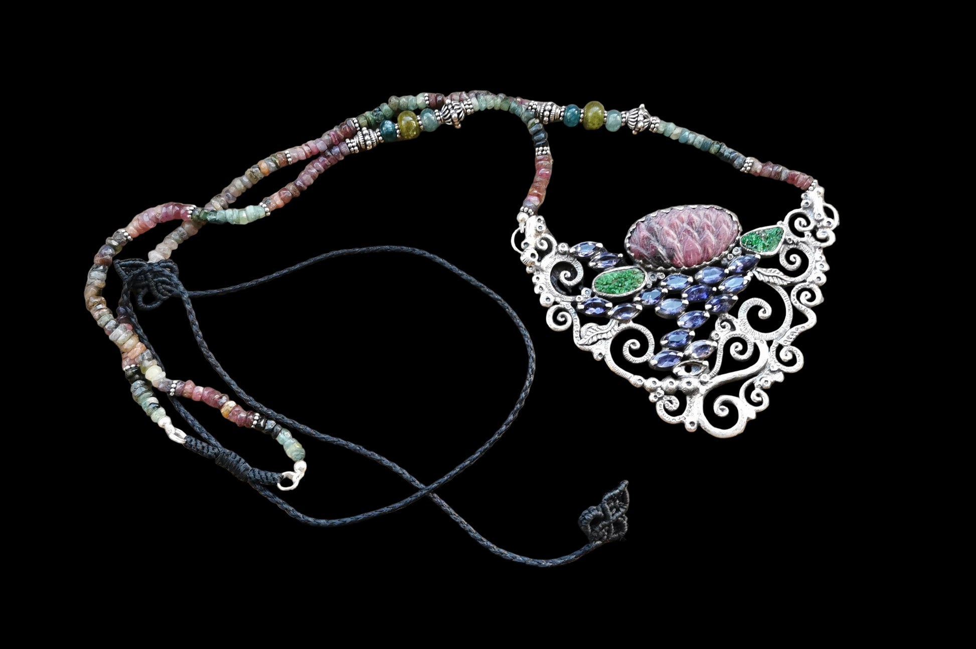 Ref.NC0074 - Necklace with ruby carved lotus flower, dioptase, and sapphire; beads: ruby, and tourmaline.