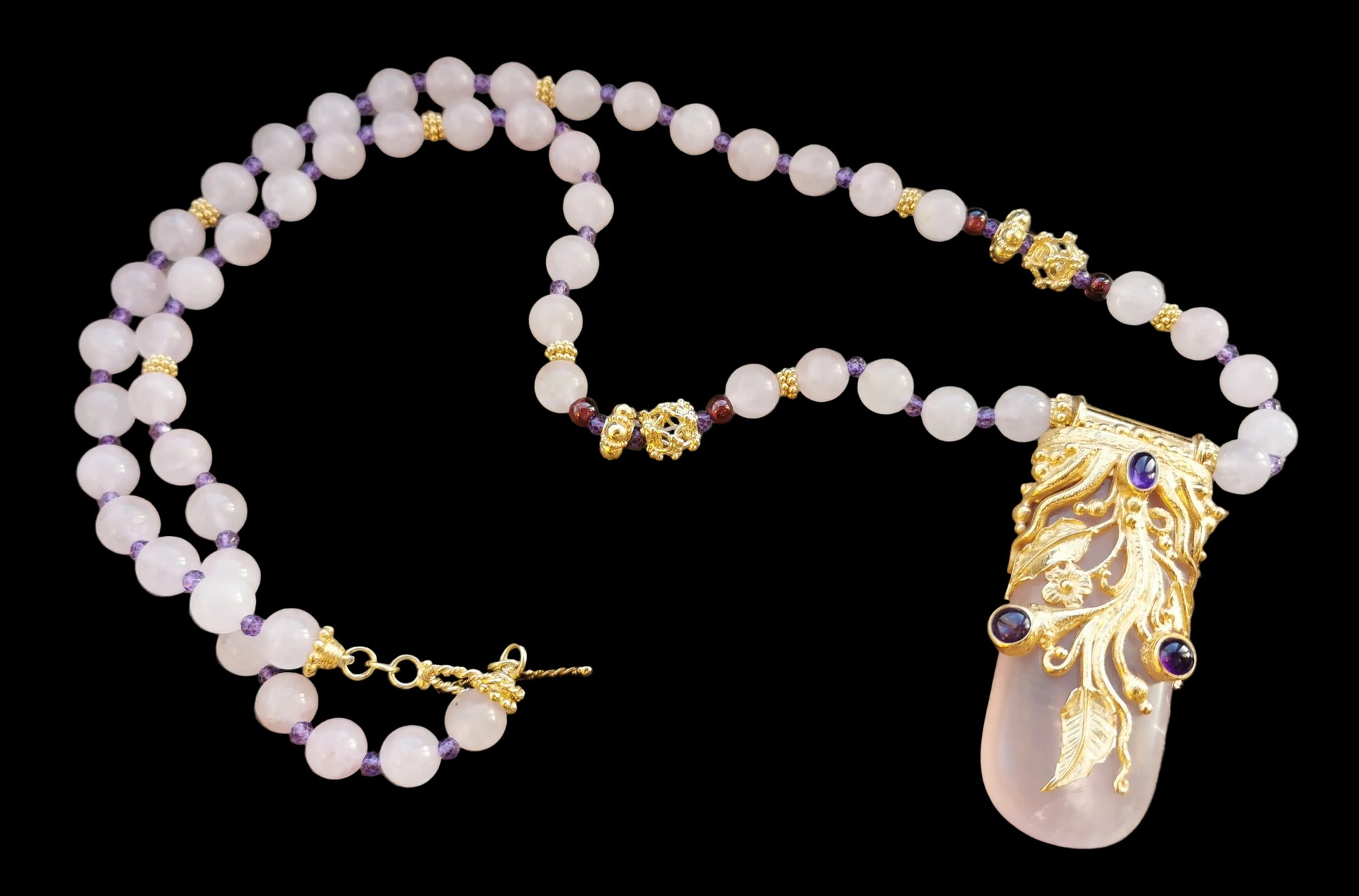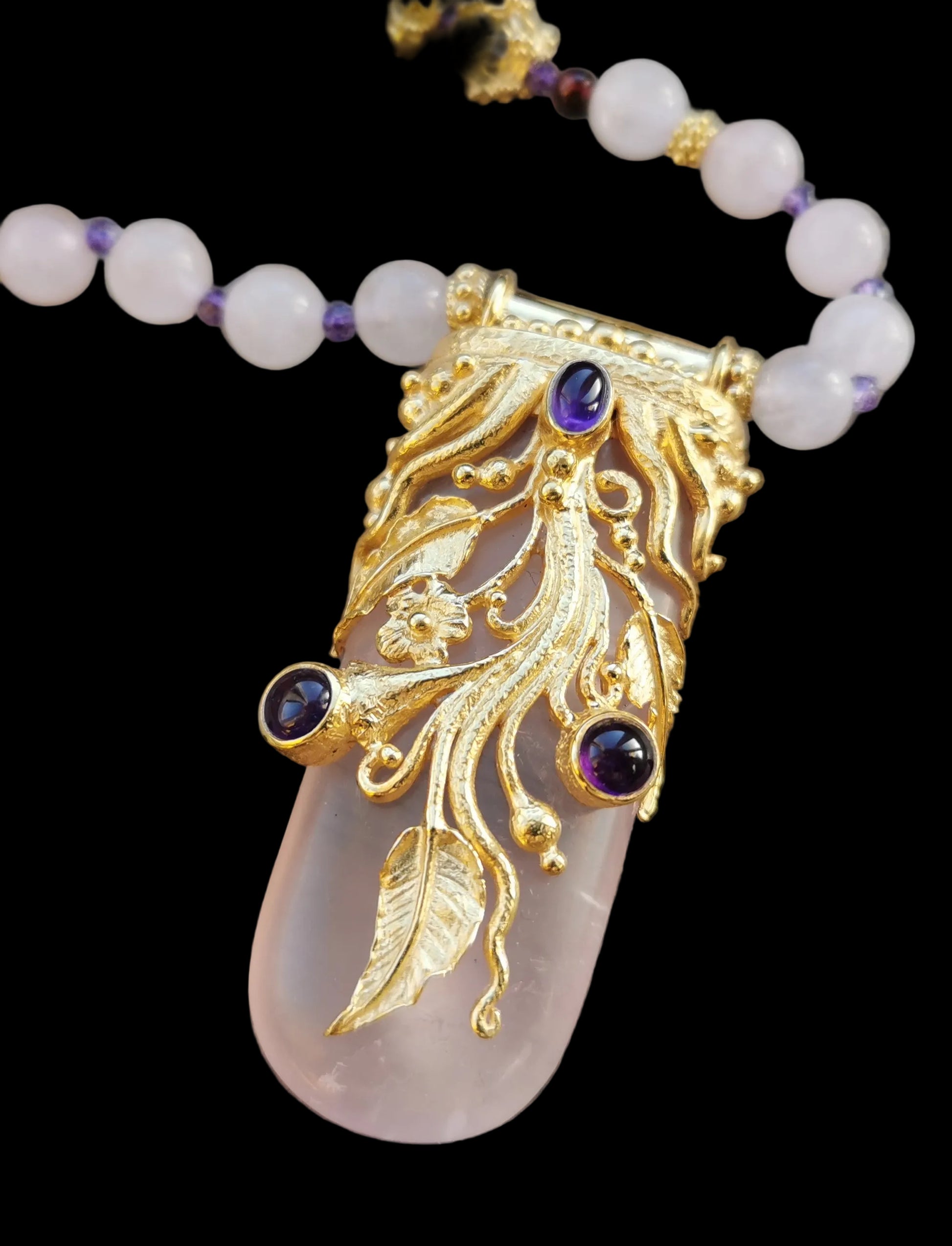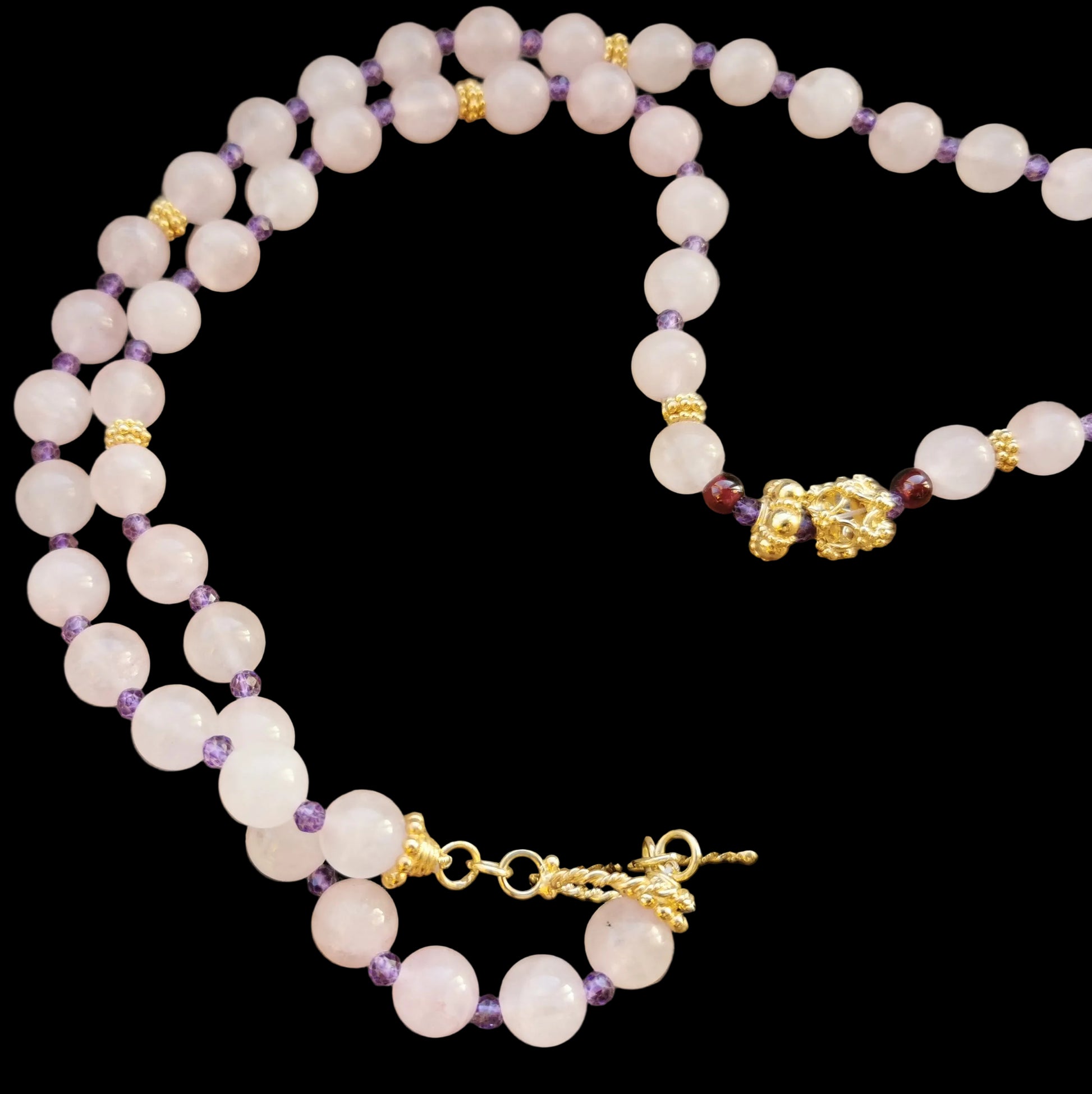 Ref.NC0075 - Gold plated on silver necklace with rose quartz, and amethyst gems; beads: rose quartz.