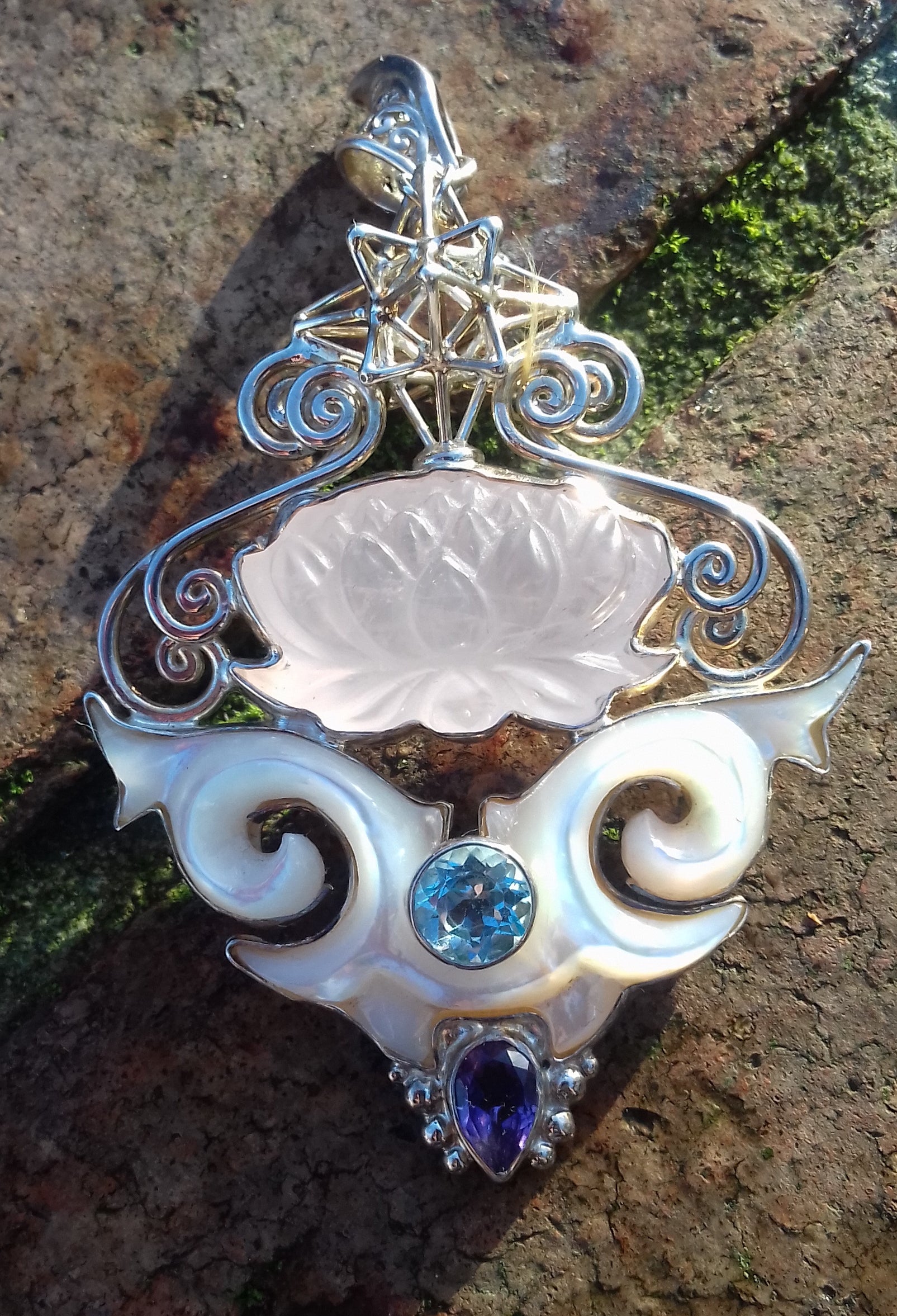Silver pendant with Heart Star geometry, rose quartz carved lotus flower, mother of pearl carved leaves, sky blue topaz & amethyst gems.