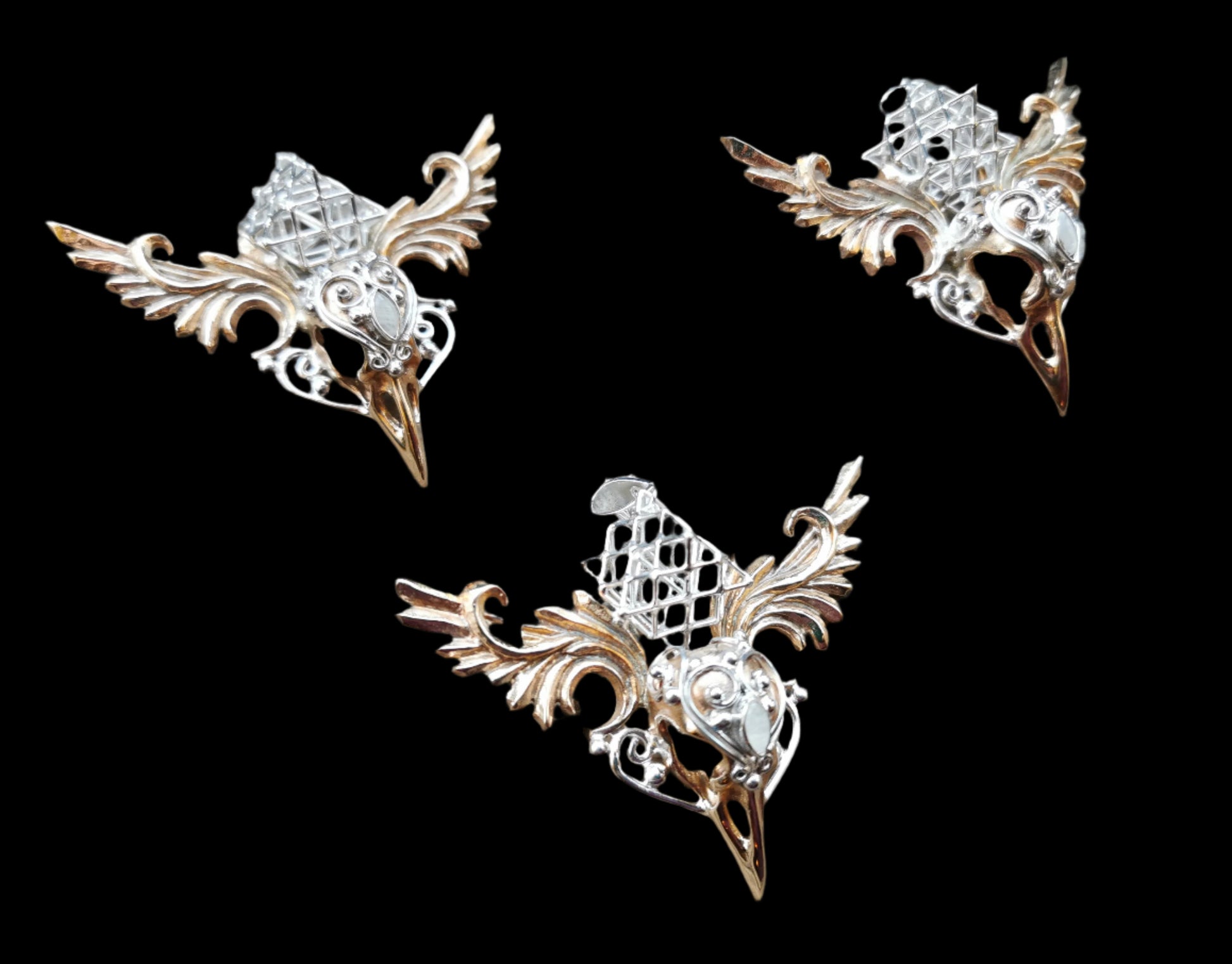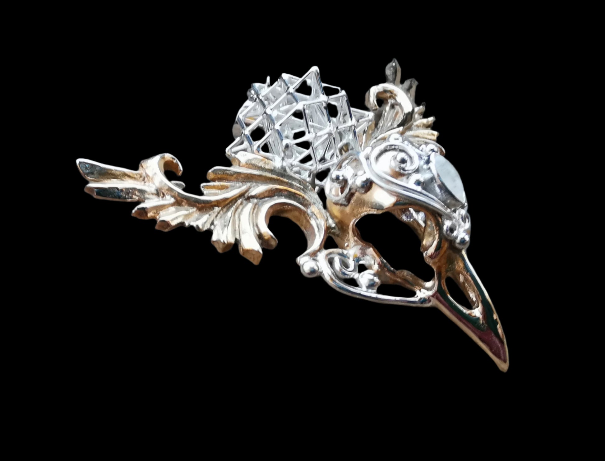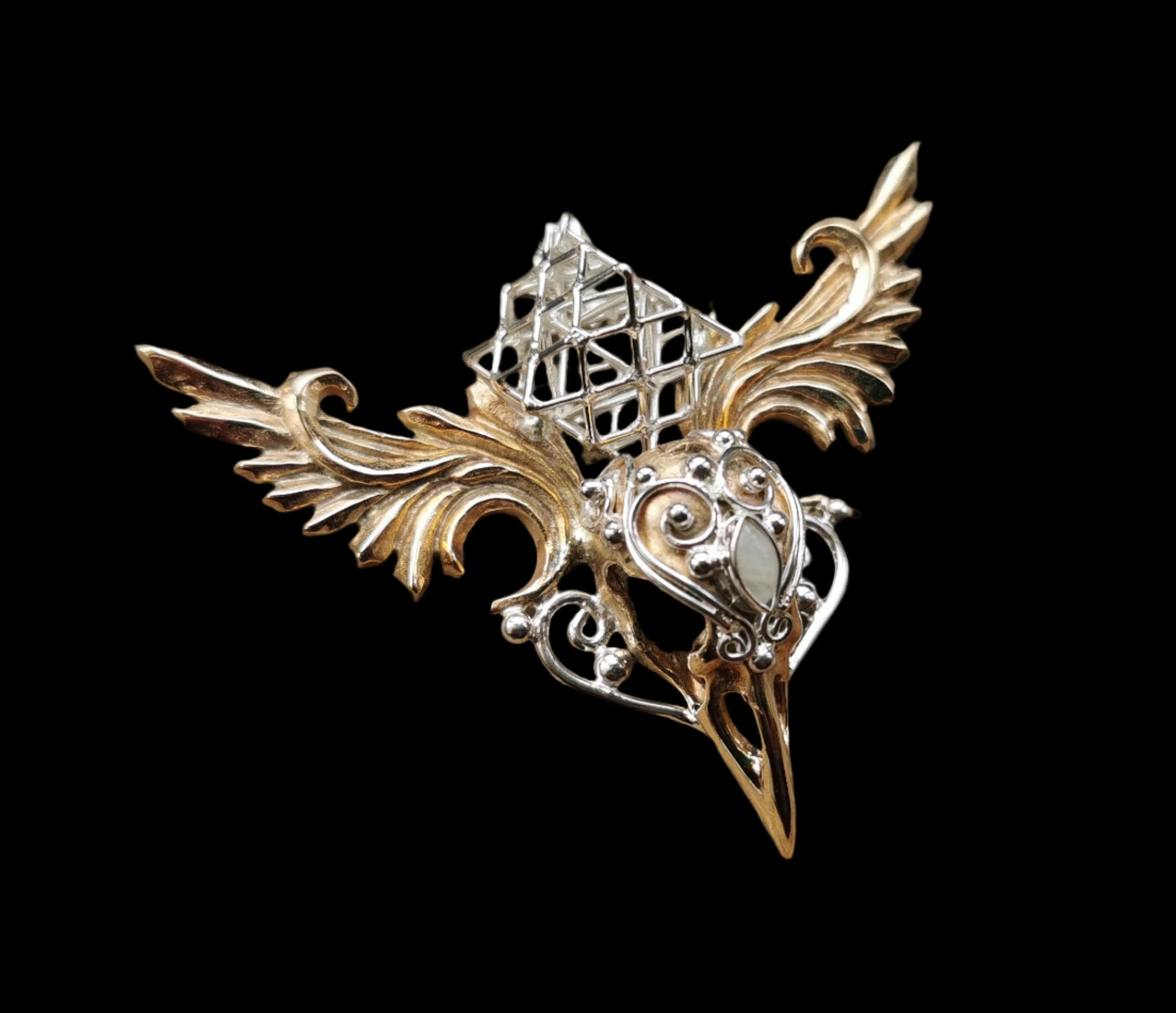 Ref.PD0178 - Brass/silver raven skull pendant with silver Tantric Terra Prana geometry, and white opal gemstone.