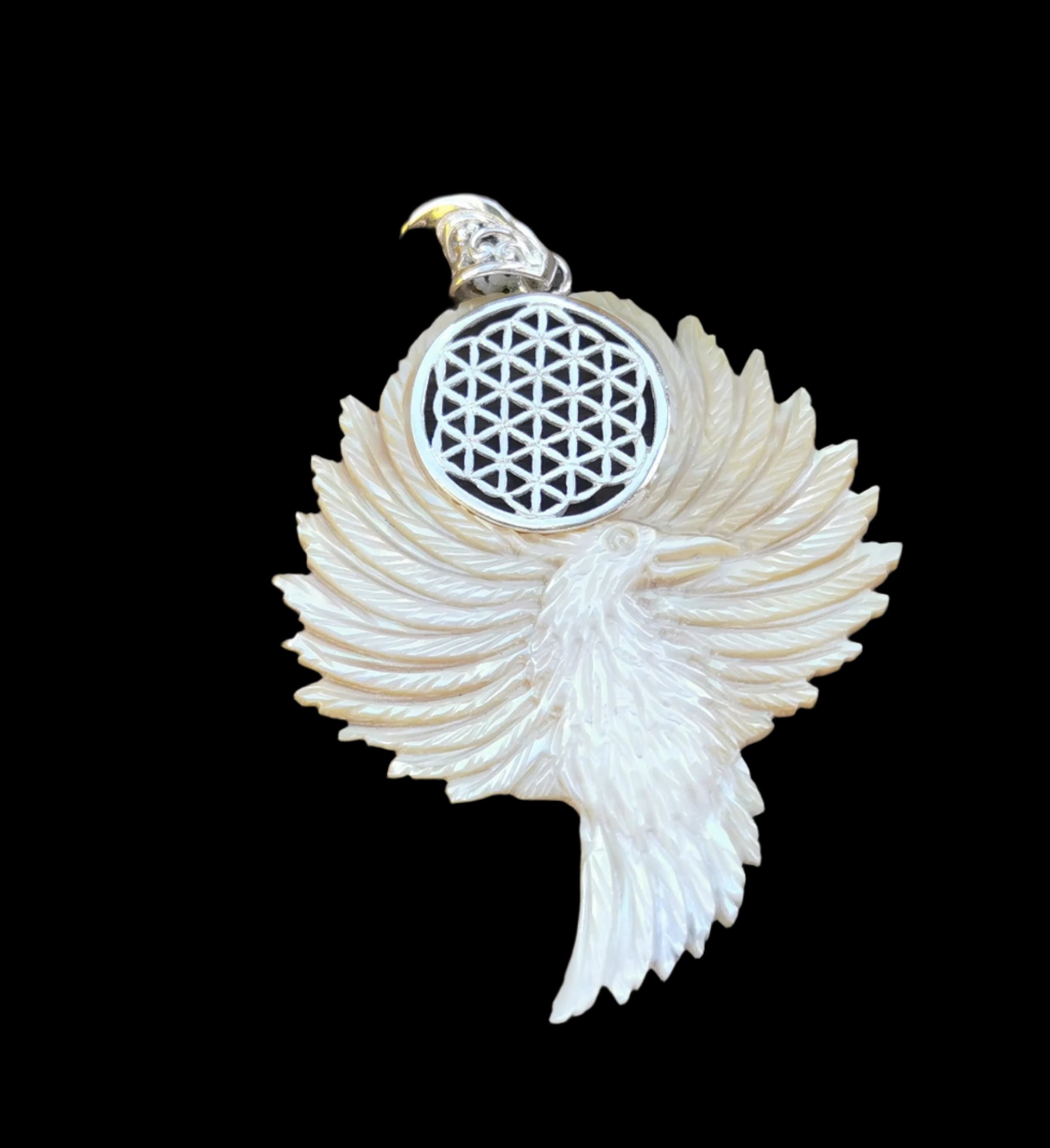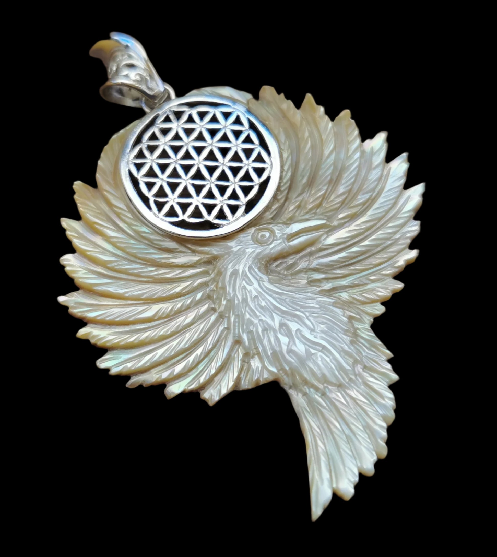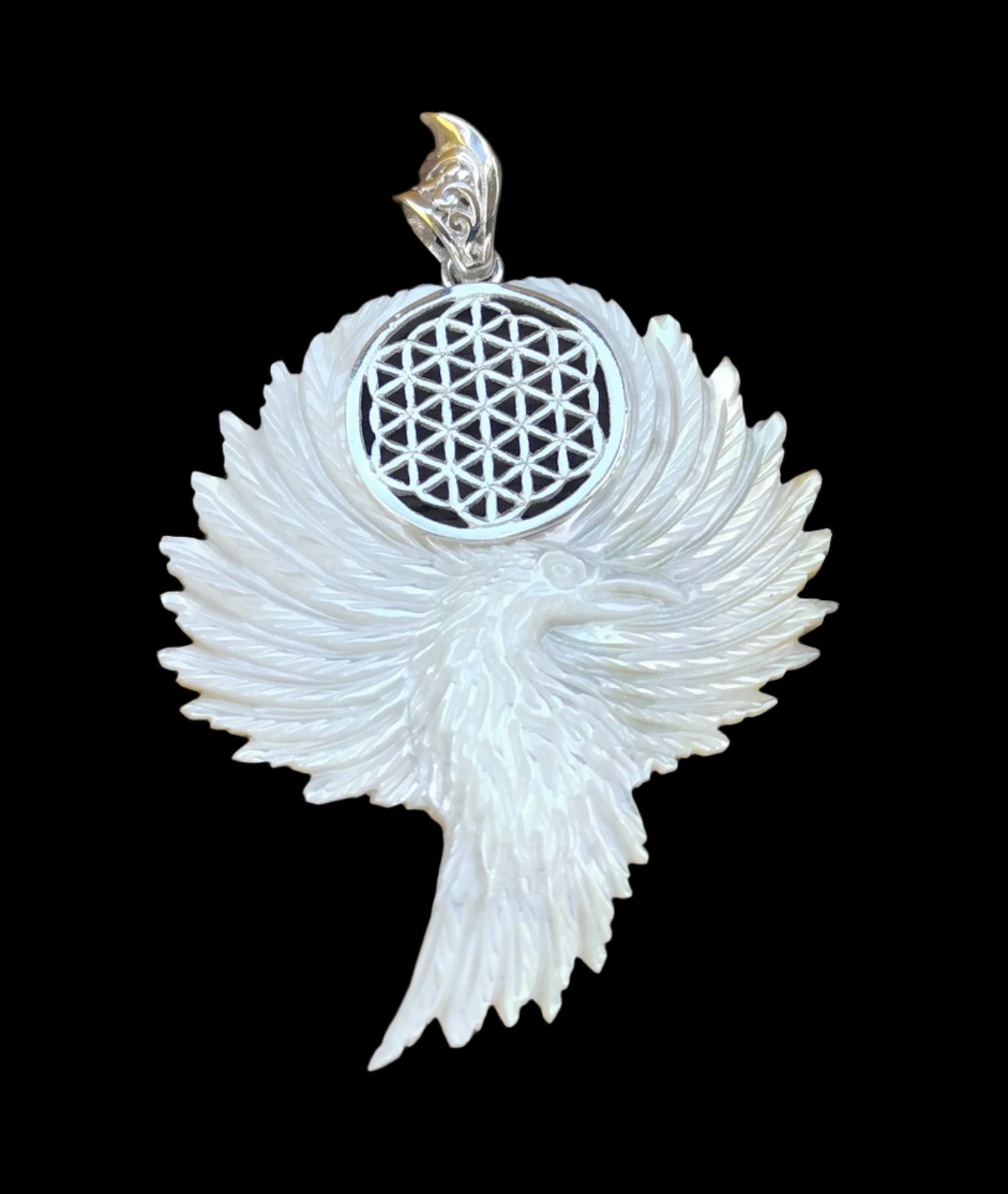 Ref.PD0213 - Mother of pearl carved phoenix pendant with Creation Mandala, aka Flower of Life, geometry in silver.