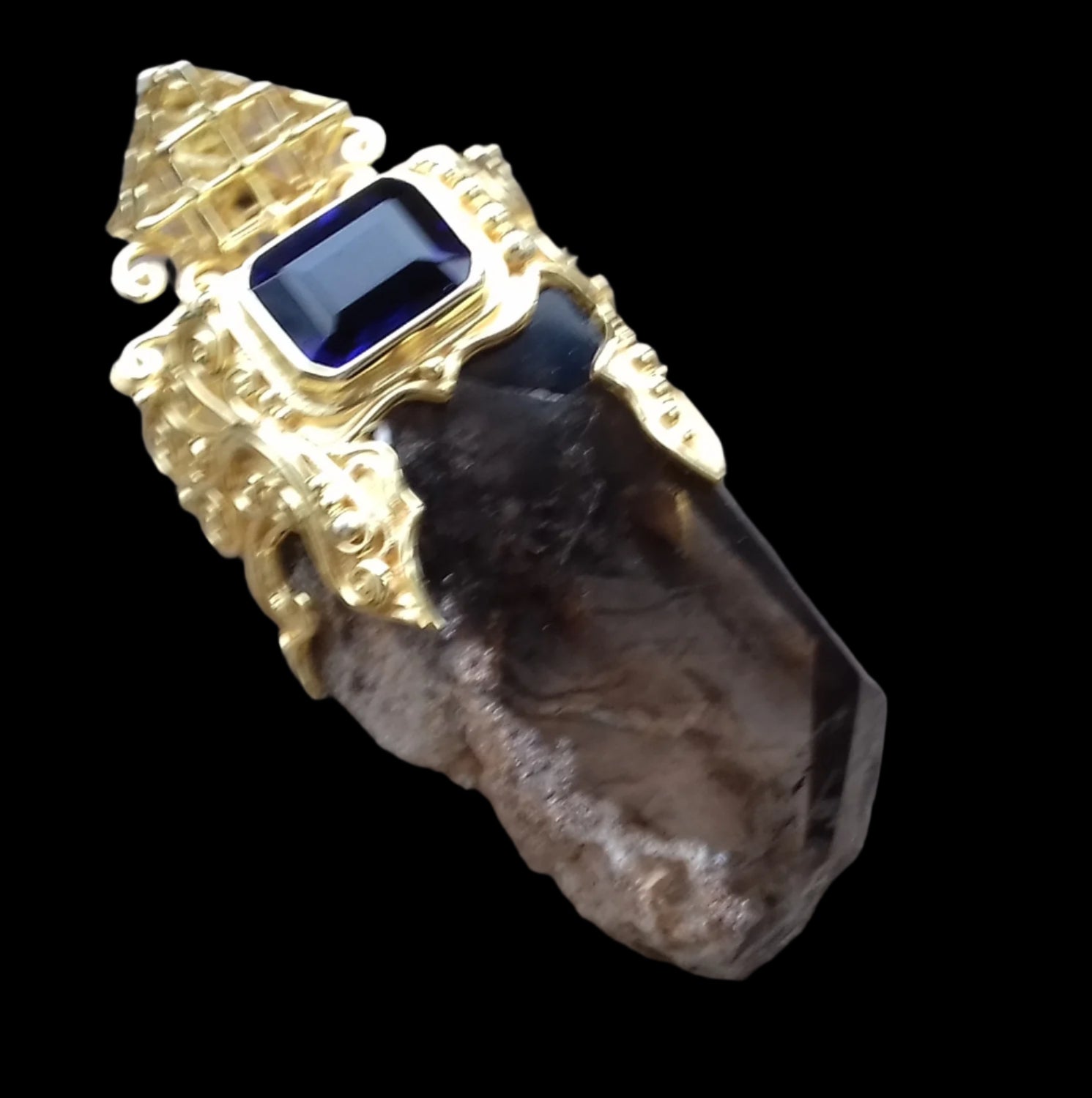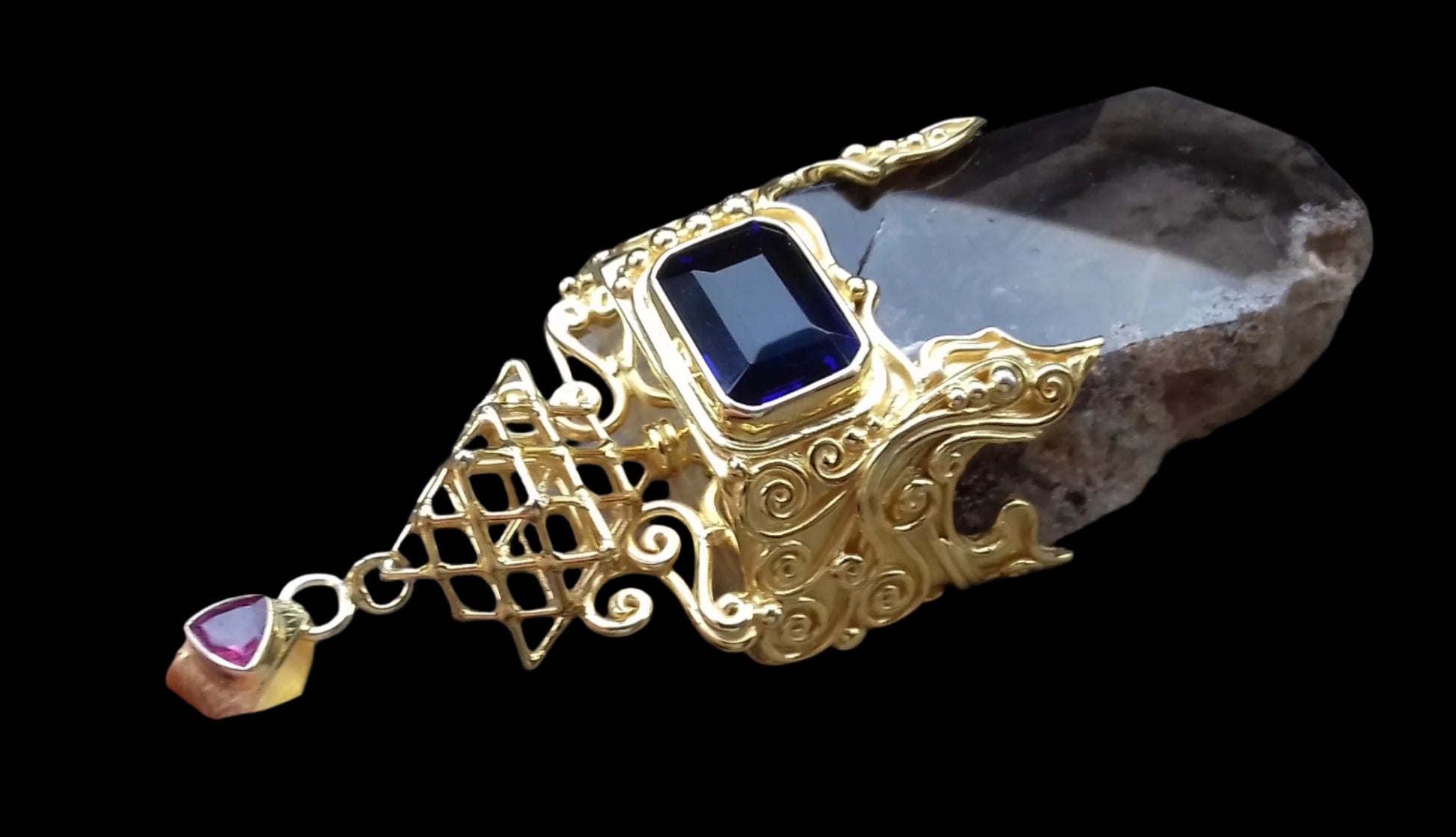 Ref.PD0219 - Gold plated on silver pendant with Tantric Terra Prana geometry, matrix quartz, blue sapphire, and pink tourmaline (bale) gems.