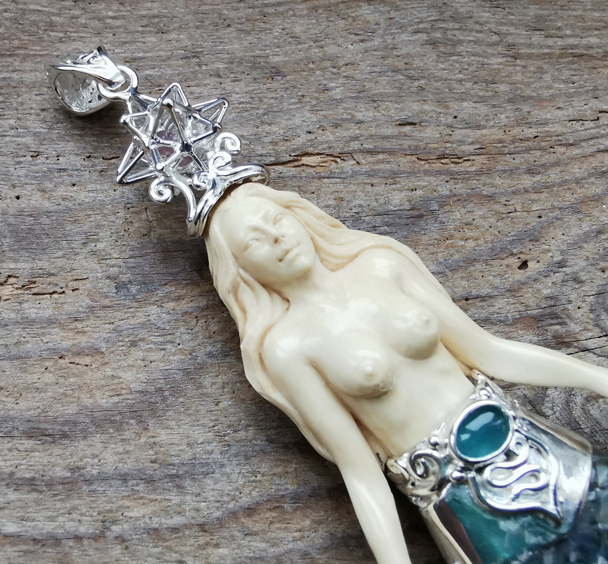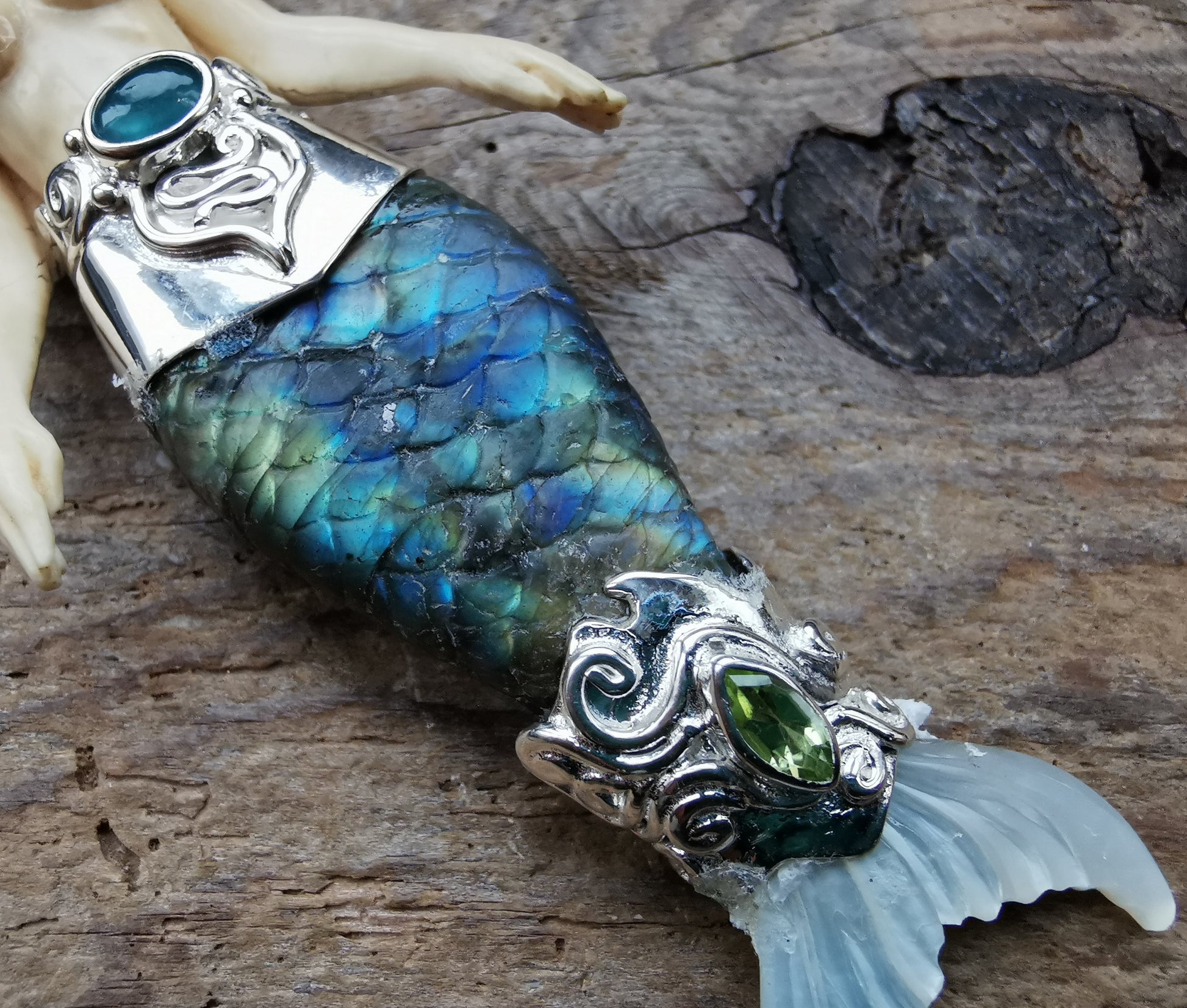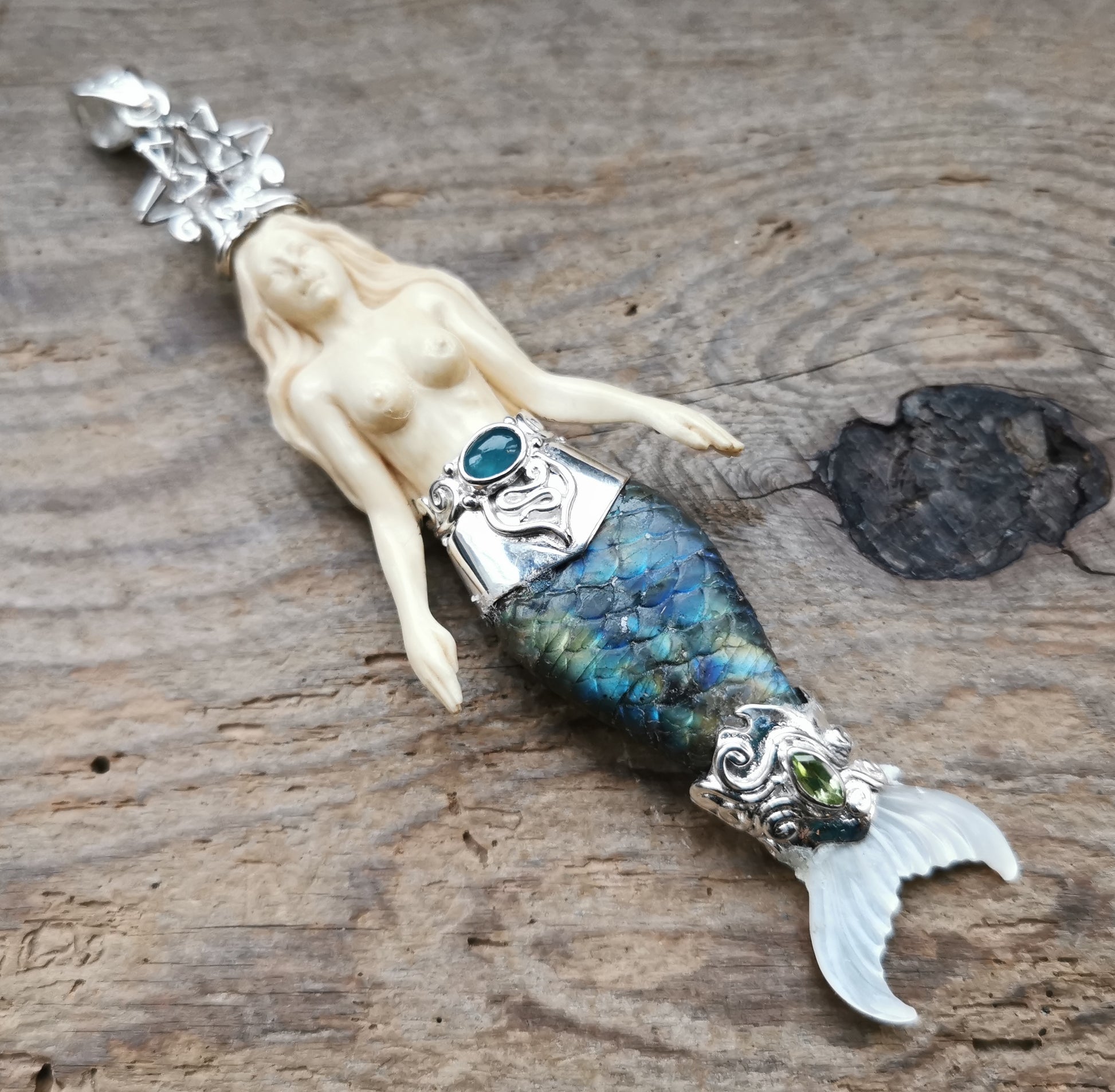 Ref.PD0241 - Silver pendant with Heart Star geometry, mammoth carved mermaid, mother of pearl carved fin, herkimer, blue onyx, peridot, and labradorite gemstones.