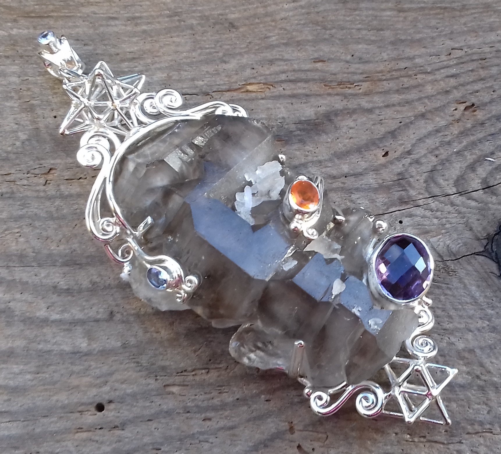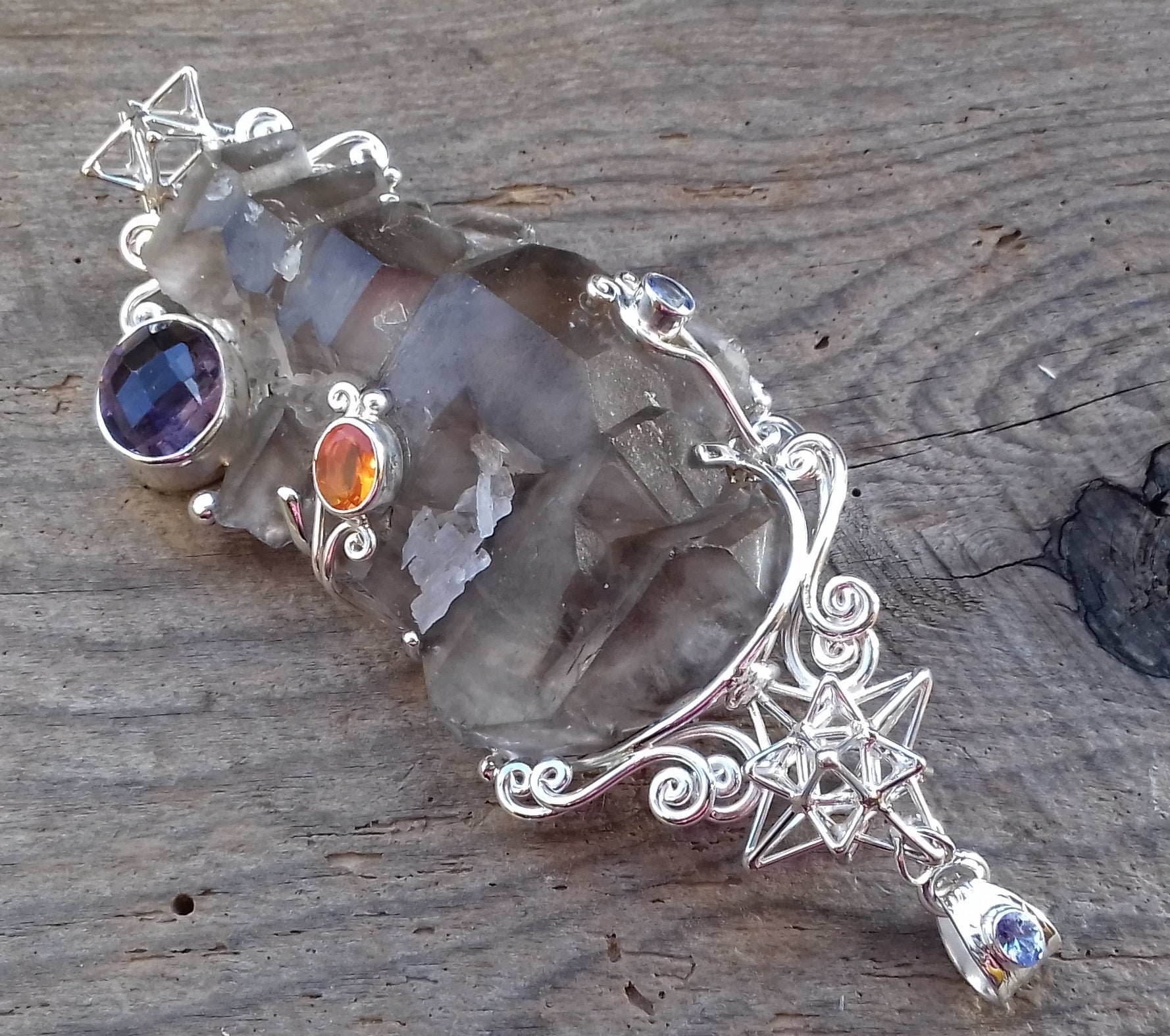 Silver pendant with Heart Star & Tantric Star geometry, mexican opal, amethyst, sky blue topaz gemstones, and elestial quartz crystal.