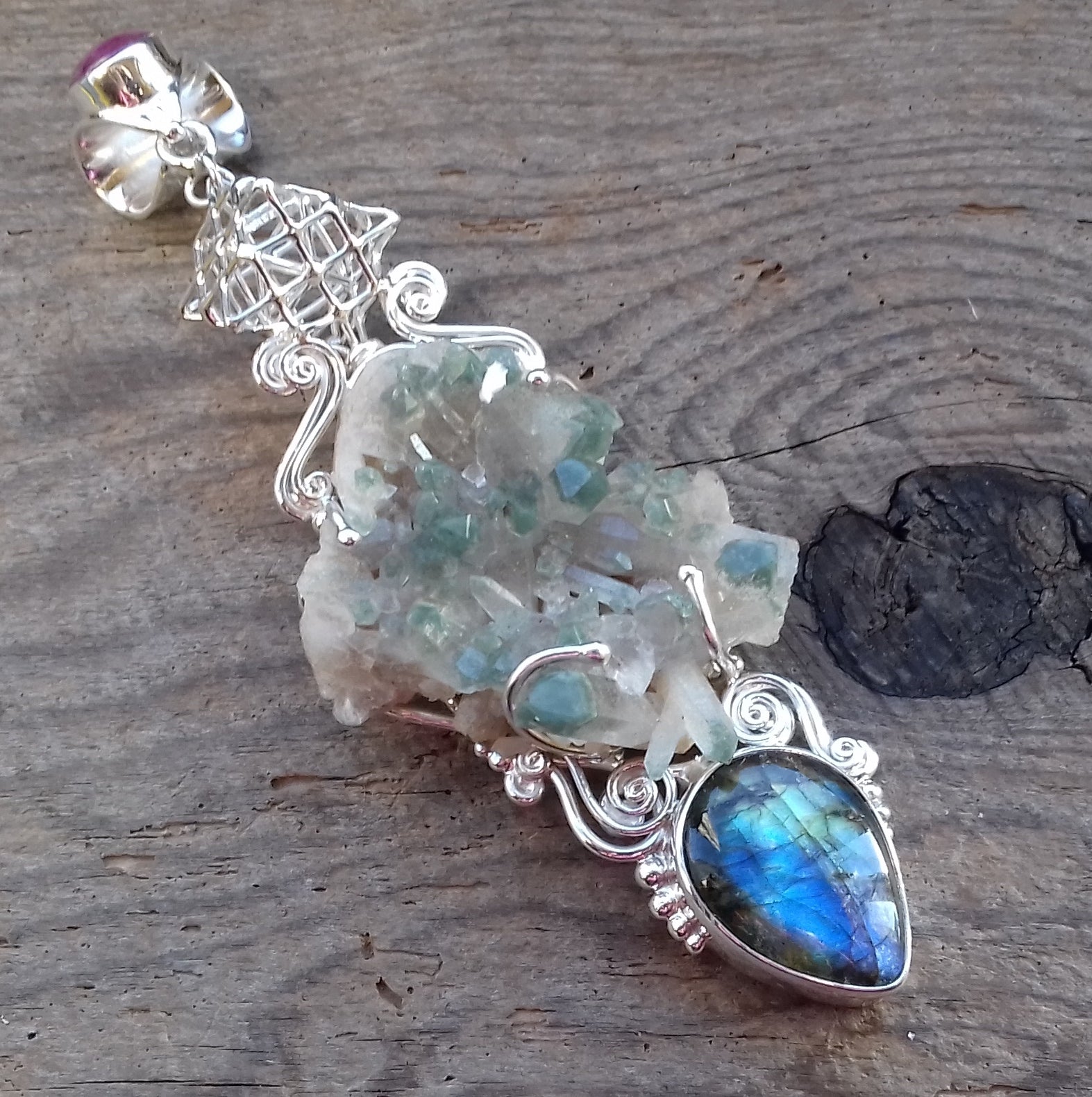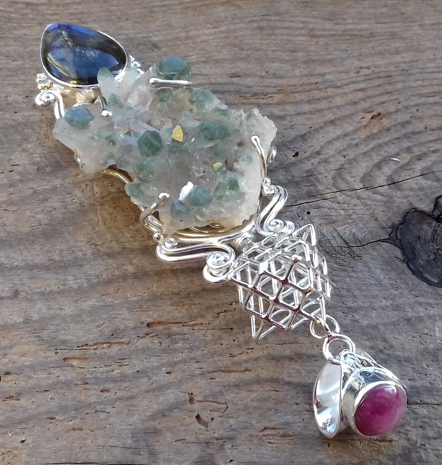 Ref.PD0266 - Silver pendant with Tantric Terra Prana geometry, star ruby & labradorite gems, and chlorite quartz crystal.