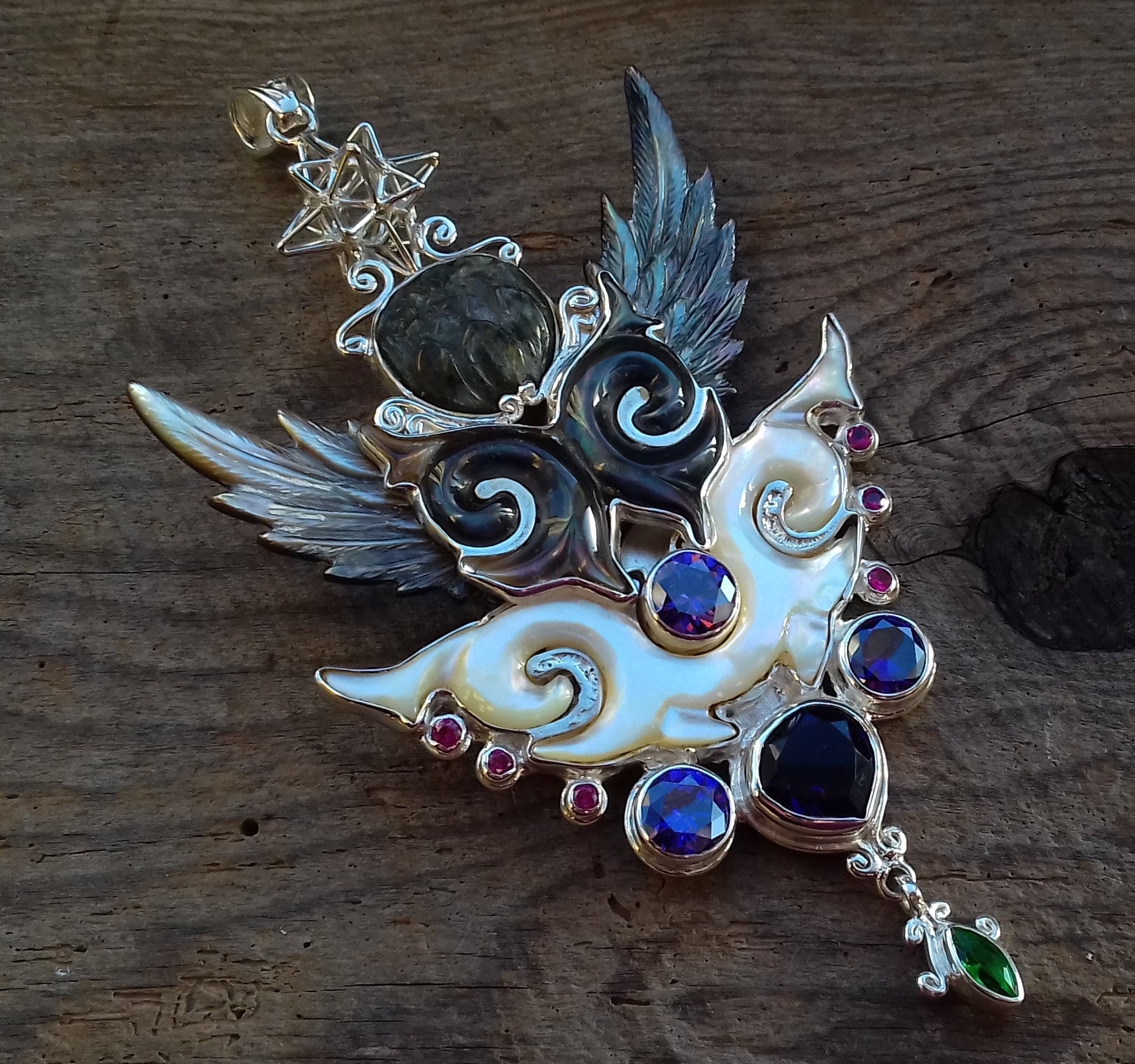 Ref.PD0273 - Silver pendant with Heart Star geometry, labradorite carved lotus flower, lab grown ruby, & amethysts gemstones, green quartz crystal, mother of pearl carved wings & Tibetan clouds.