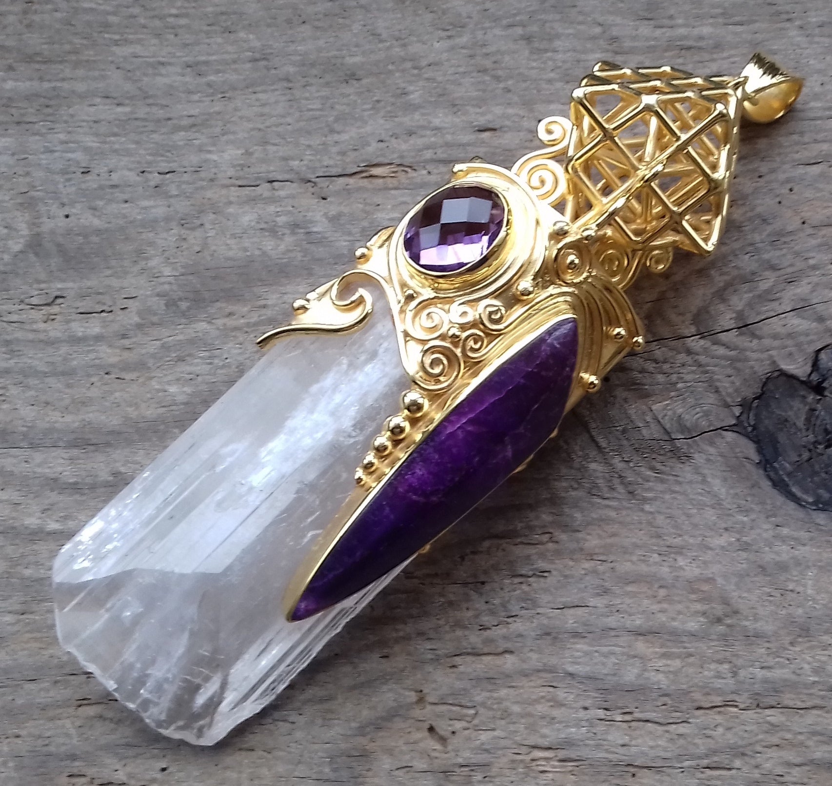Ref.PD0288 - Gold plated on silver pendant with Tantric Terra Prana geometry, amethyst, danburite, and sugilite gems.