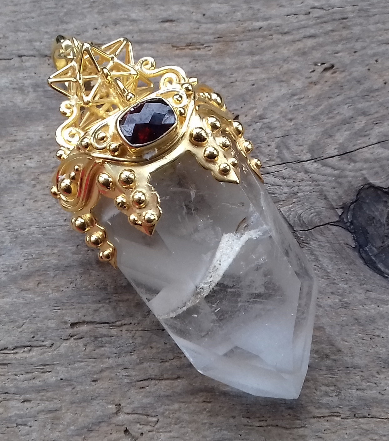 Ref.PD0384 - Gold plated on silver Solar Star geometry, phantom quartz crystal, garnet, and peridot (bale) gemstones.