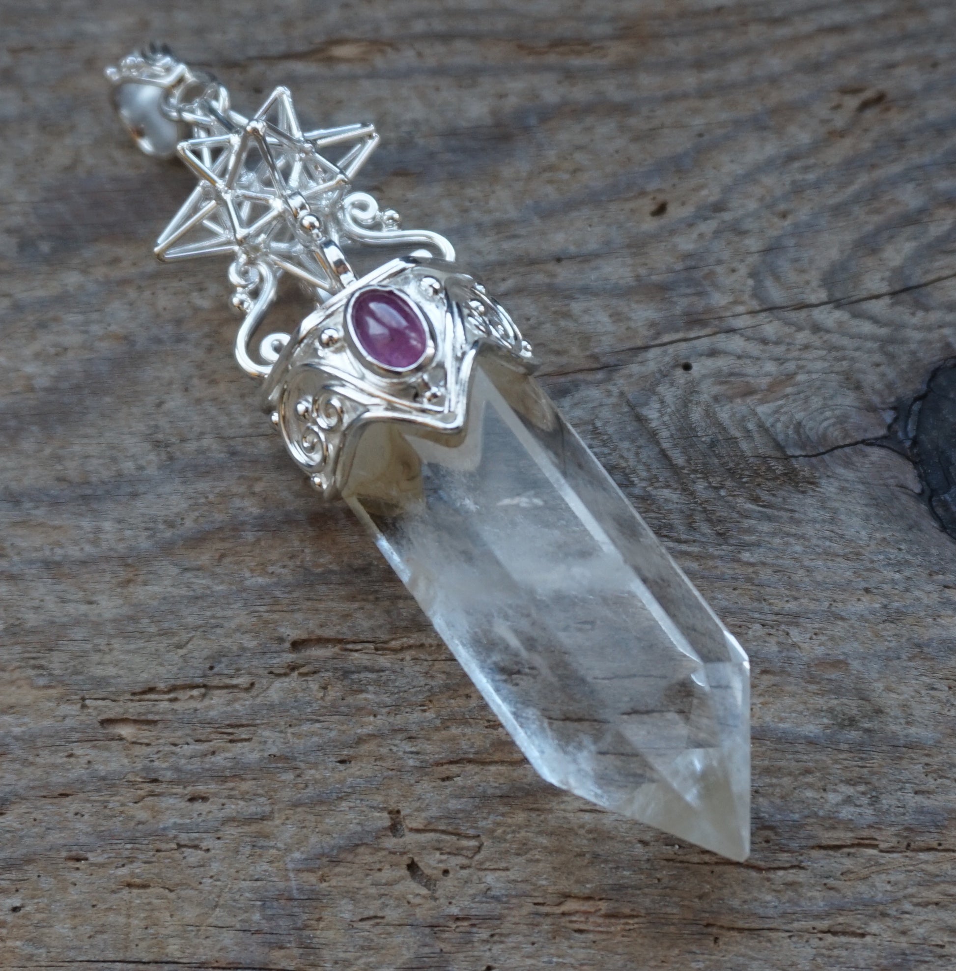 Silver pendant with Heart Star geometry, clear quartz crystal, and tourmaline gemstone.