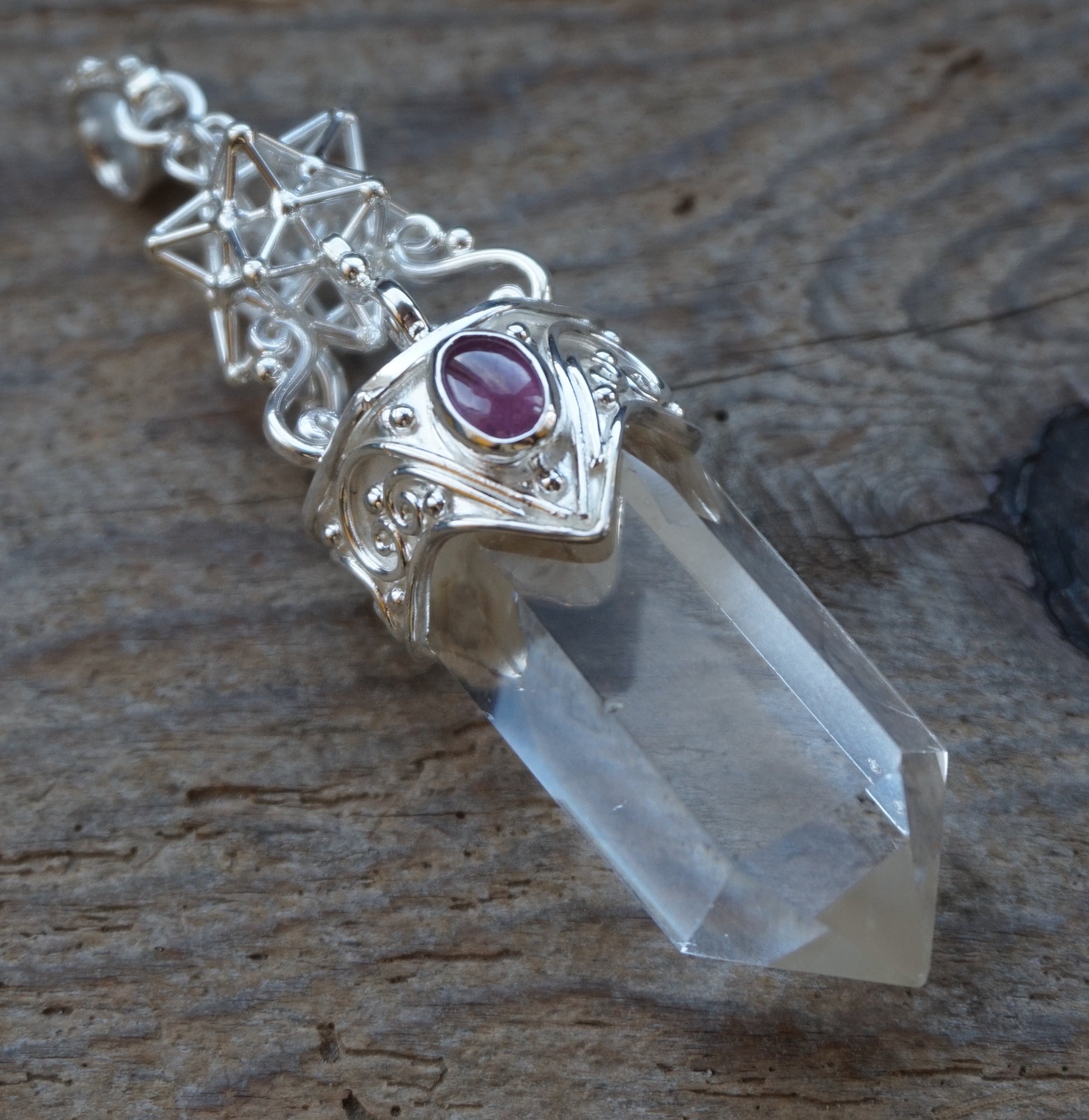 Silver pendant with Solar Star geometry, clear quartz crystal, and amethyst gemstone.