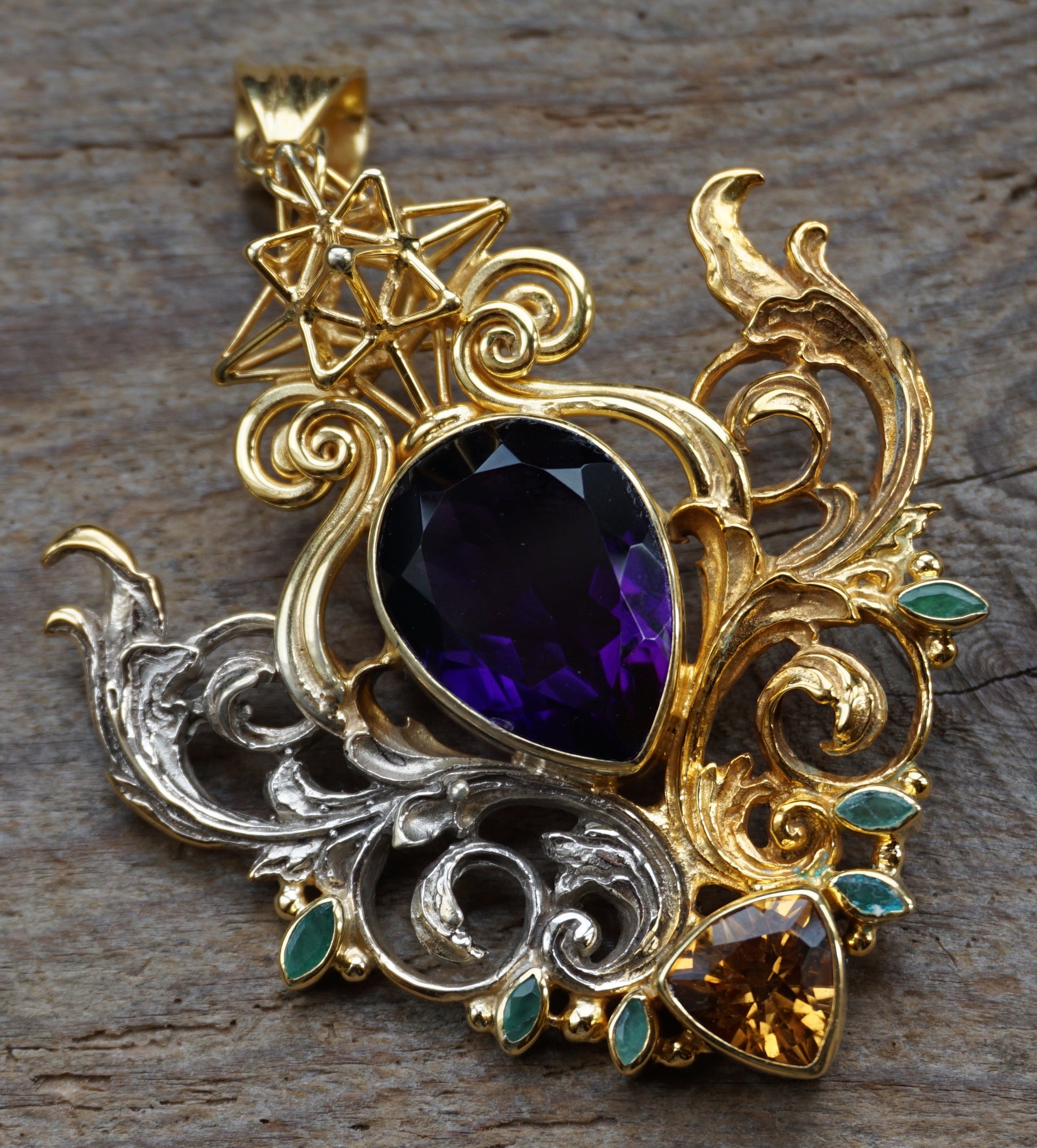 Gold plated on silver pendant with Heart Star geometry, emeralds, citrine, and amethyst gemstones.