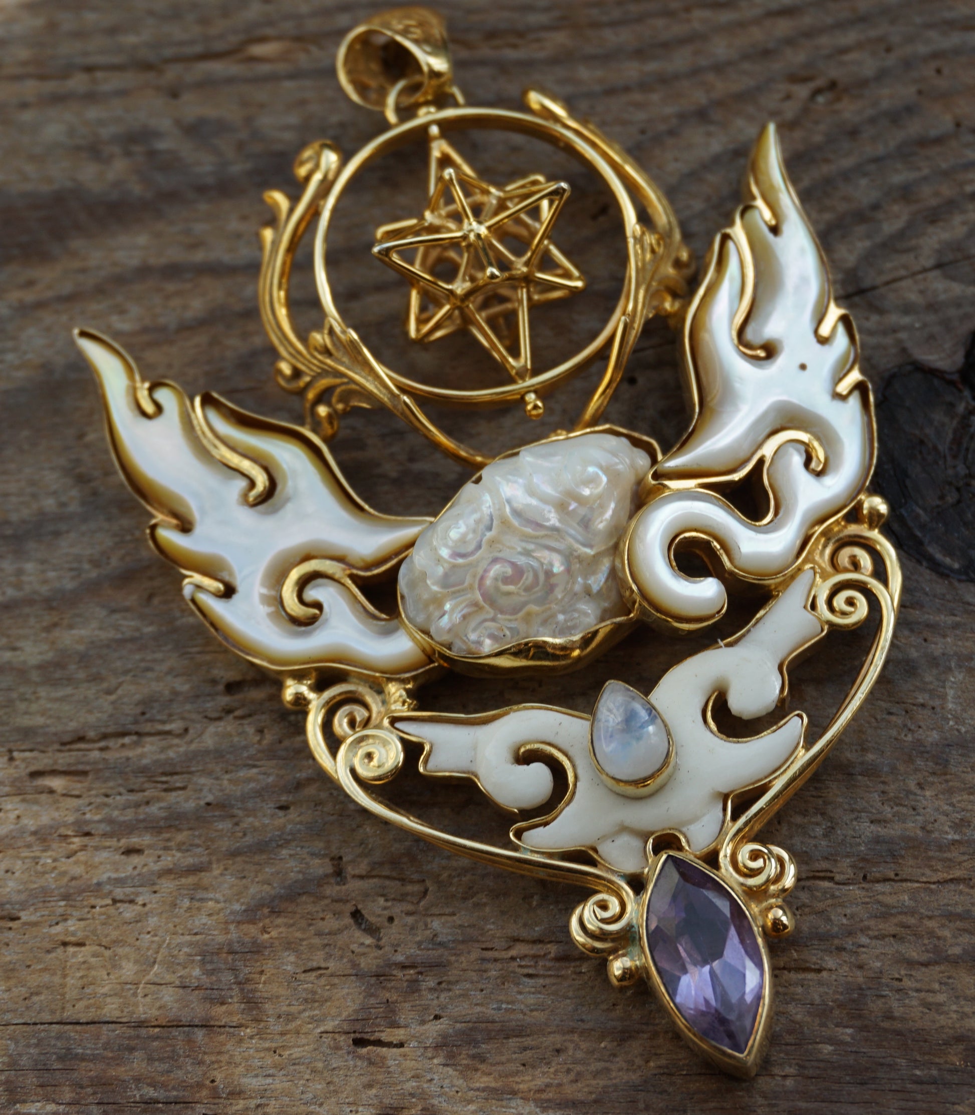 Ref.PD0442 - Gold plated on silver pendant with Heart Star geometry in a circle, river pearl & mother of pearl carved clouds, moonstone, and amethyst gems.