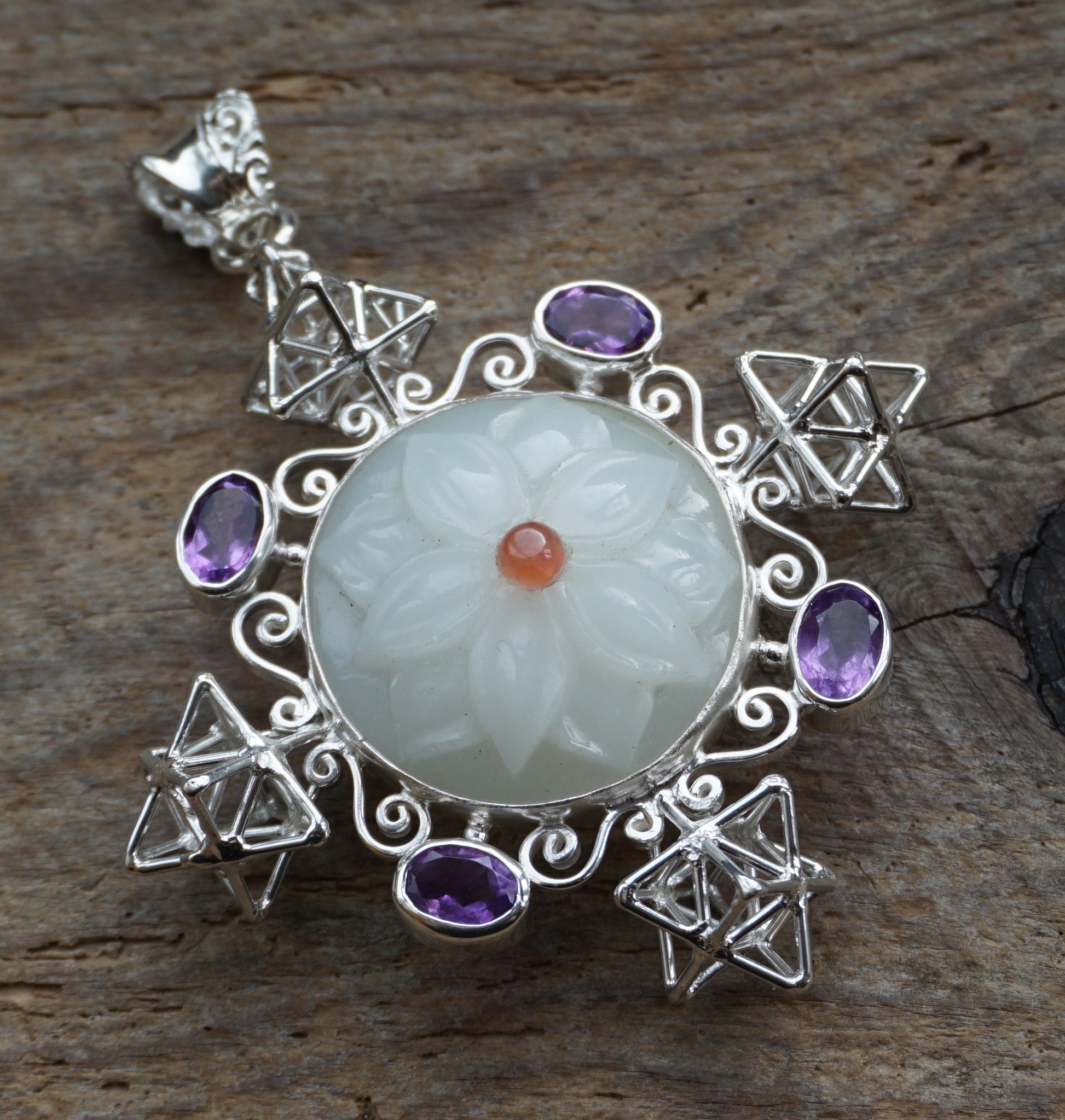 Silver cross pendant with Tantric Star geometries, white jade carved flower, amethyst, and carnelian gems.