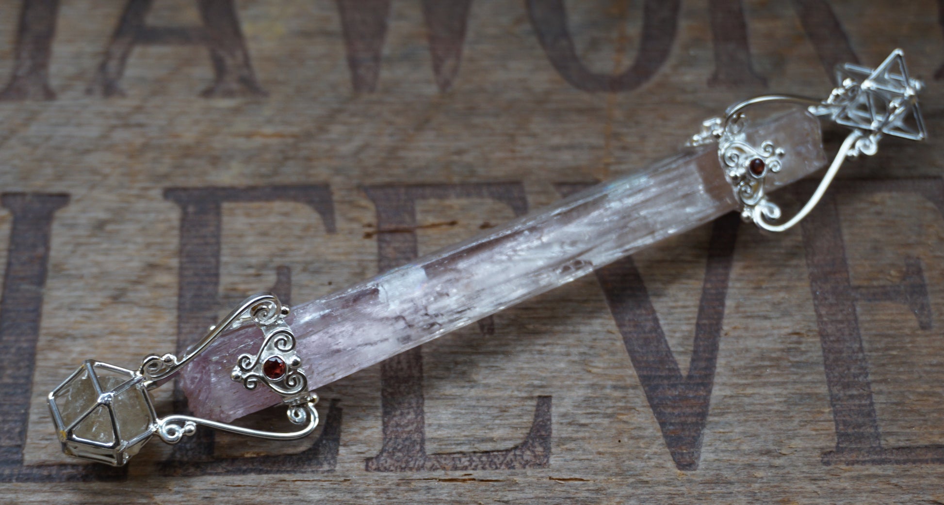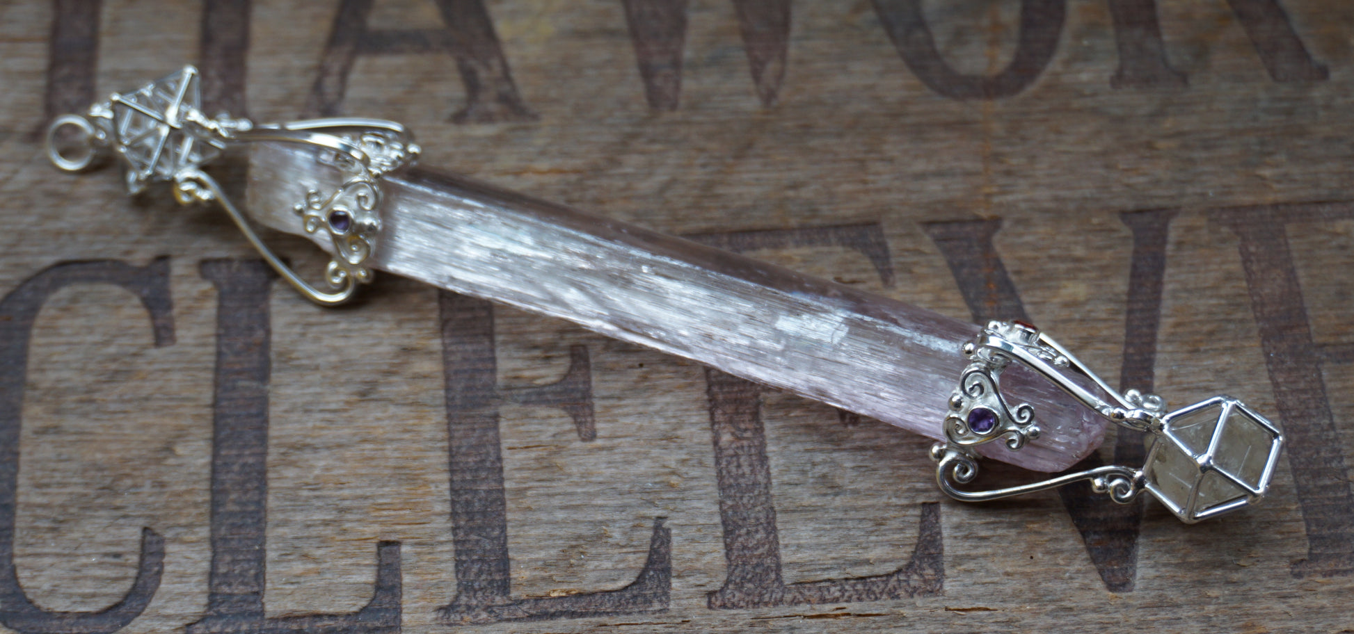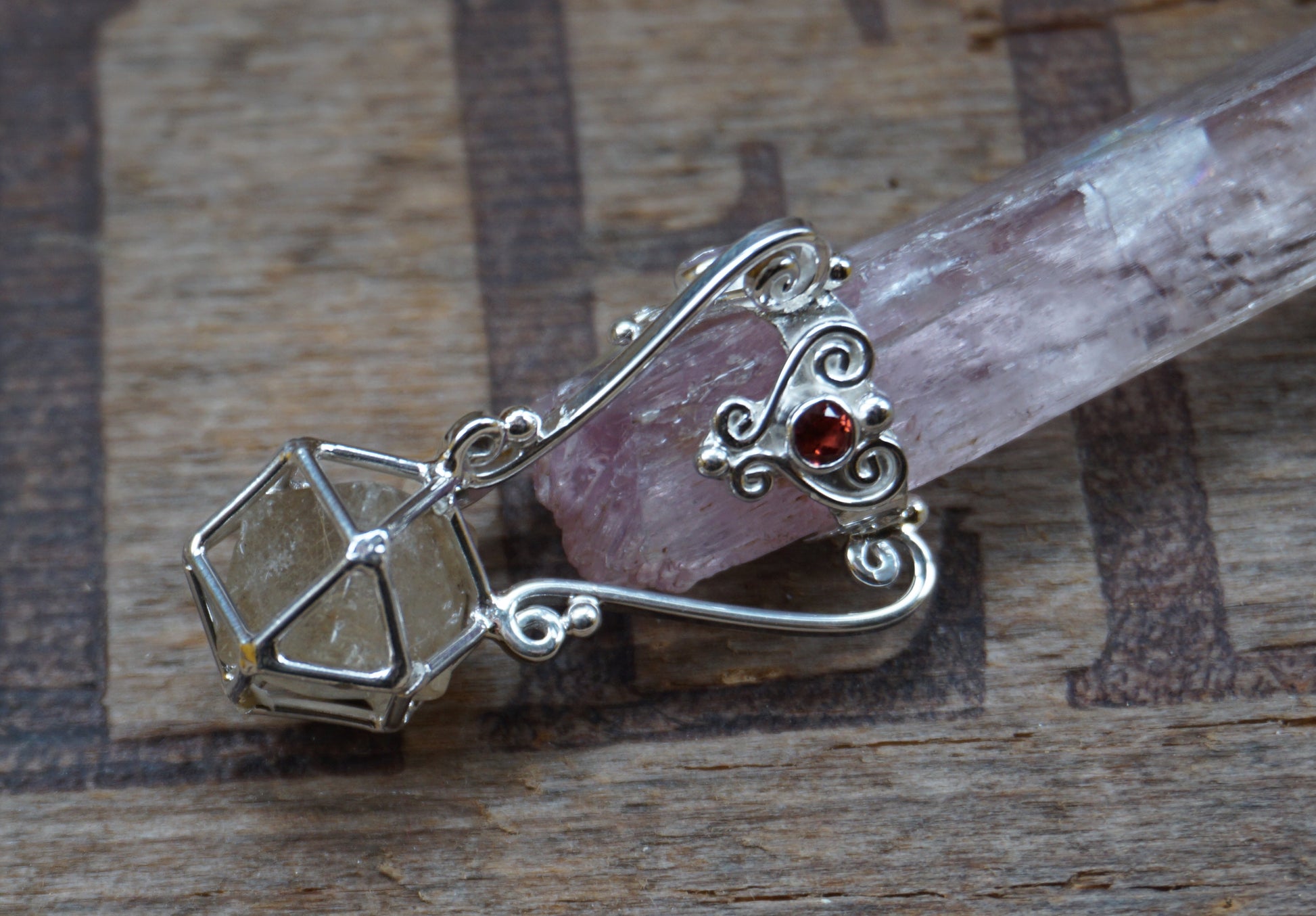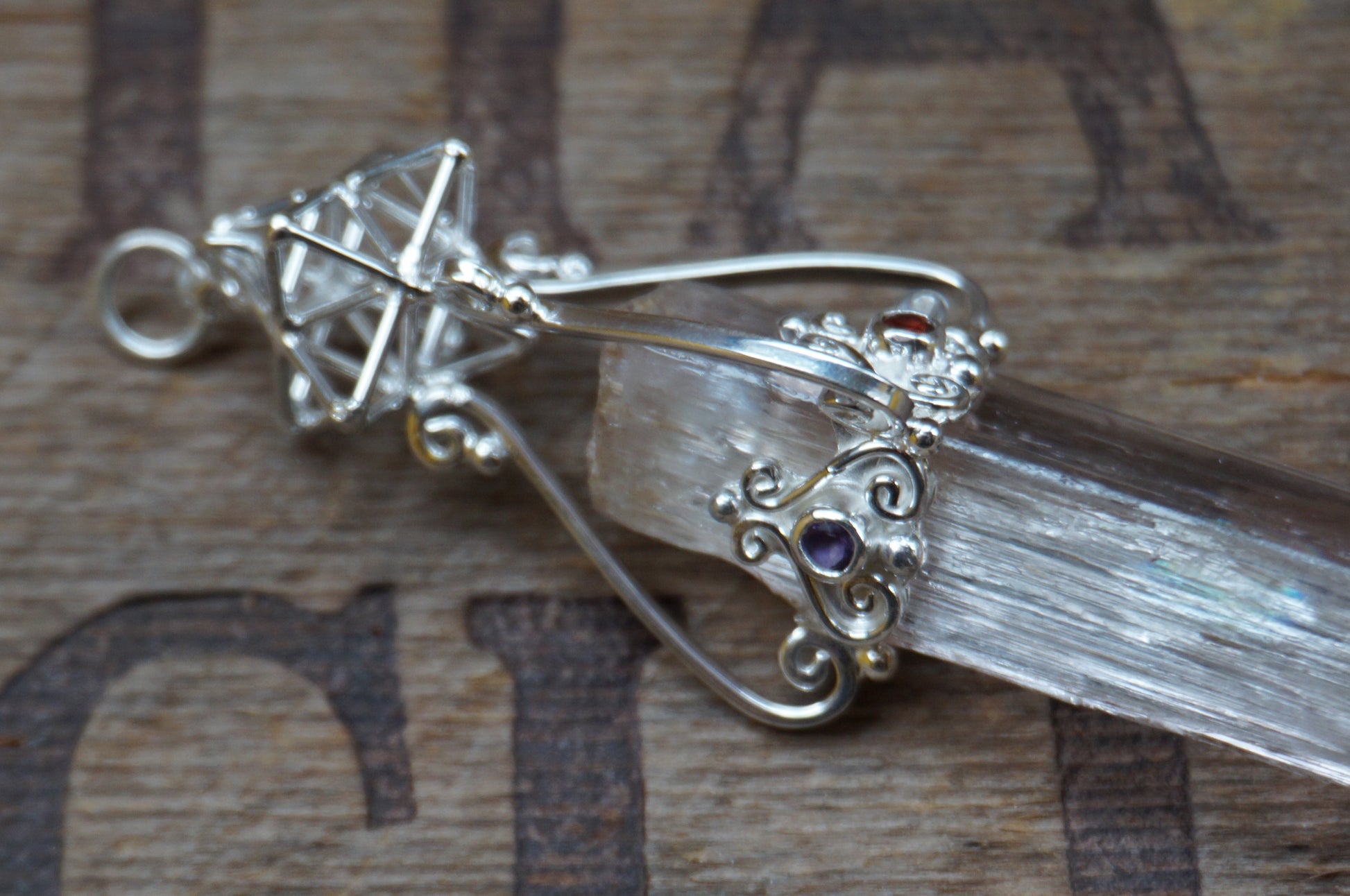 Ref.PD0447 - Silver pendant with Tantric Star + Cuboctahedron geometries, pink kunzite, selenite, garnet, amethyst, and citrine gemstones.