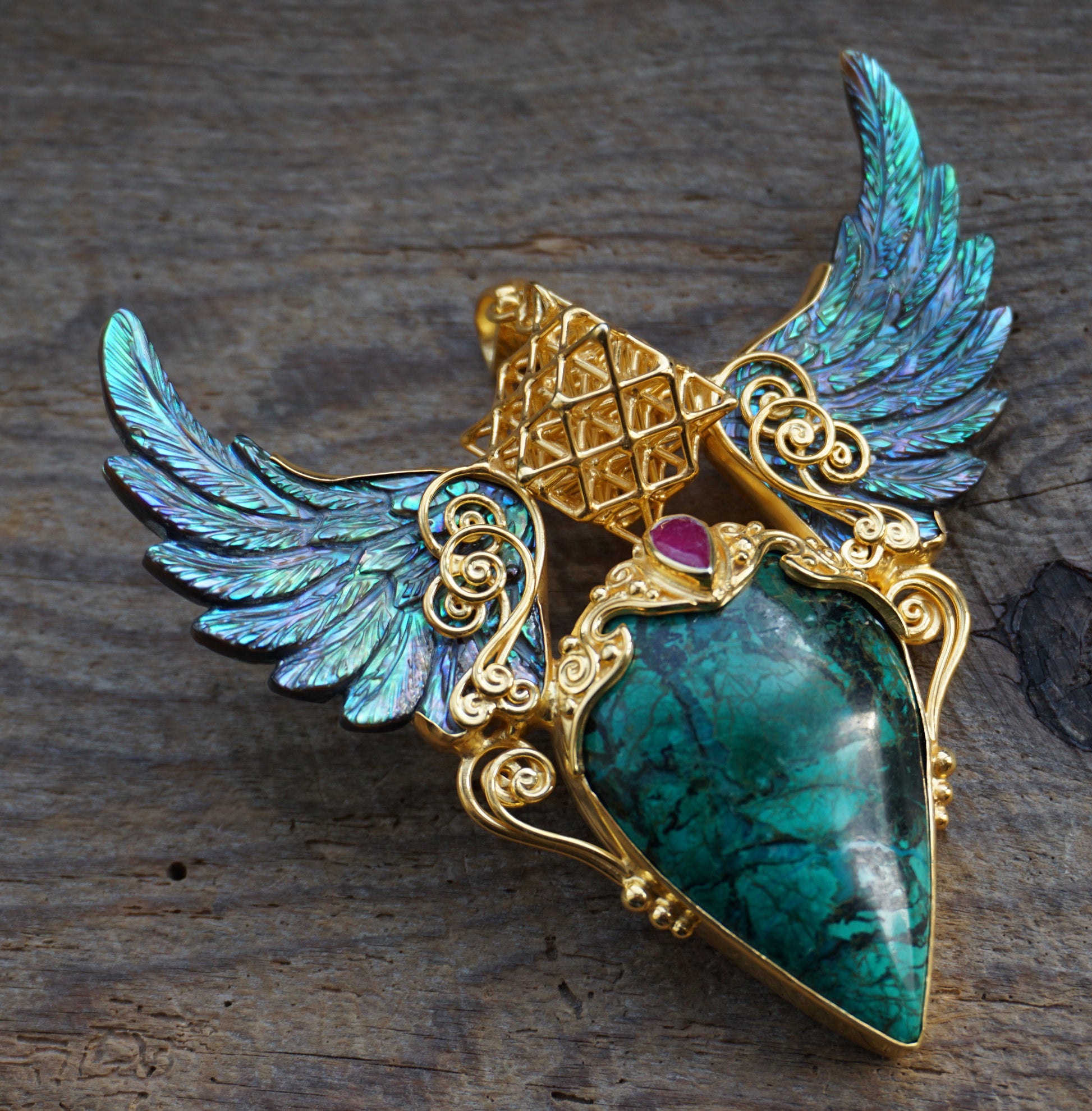 Ref.PD0467 - Gold plated on silver pendant with 64 cells geometry, abalone carved wings, Burmese ruby, and chrysocolla gemstones.