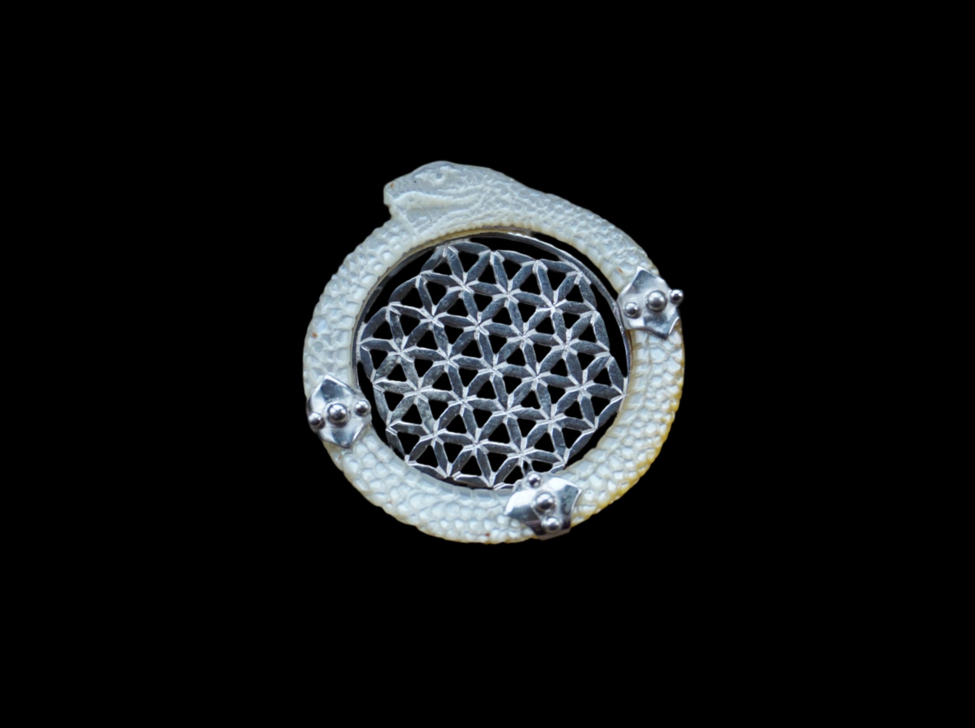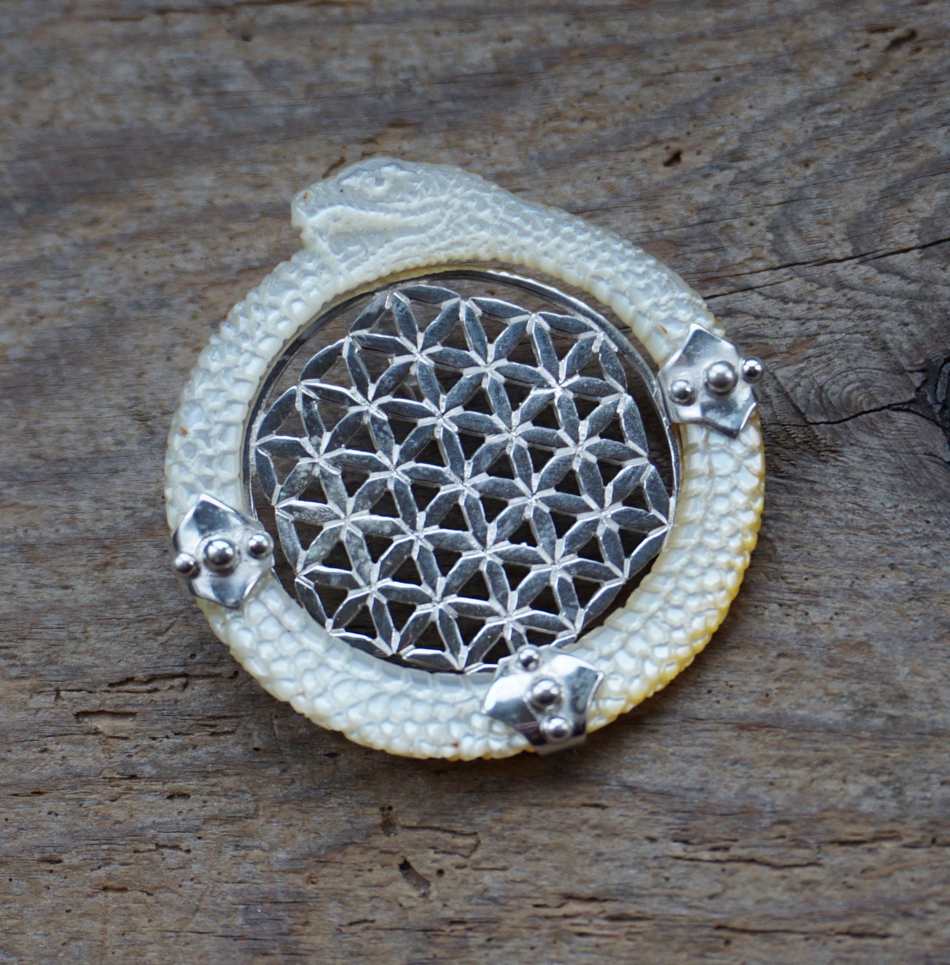 Ref.PD0484 - Mother of pearl carved Ouroboros with silver Creation Mandala, aka Flower of Life, pendant.