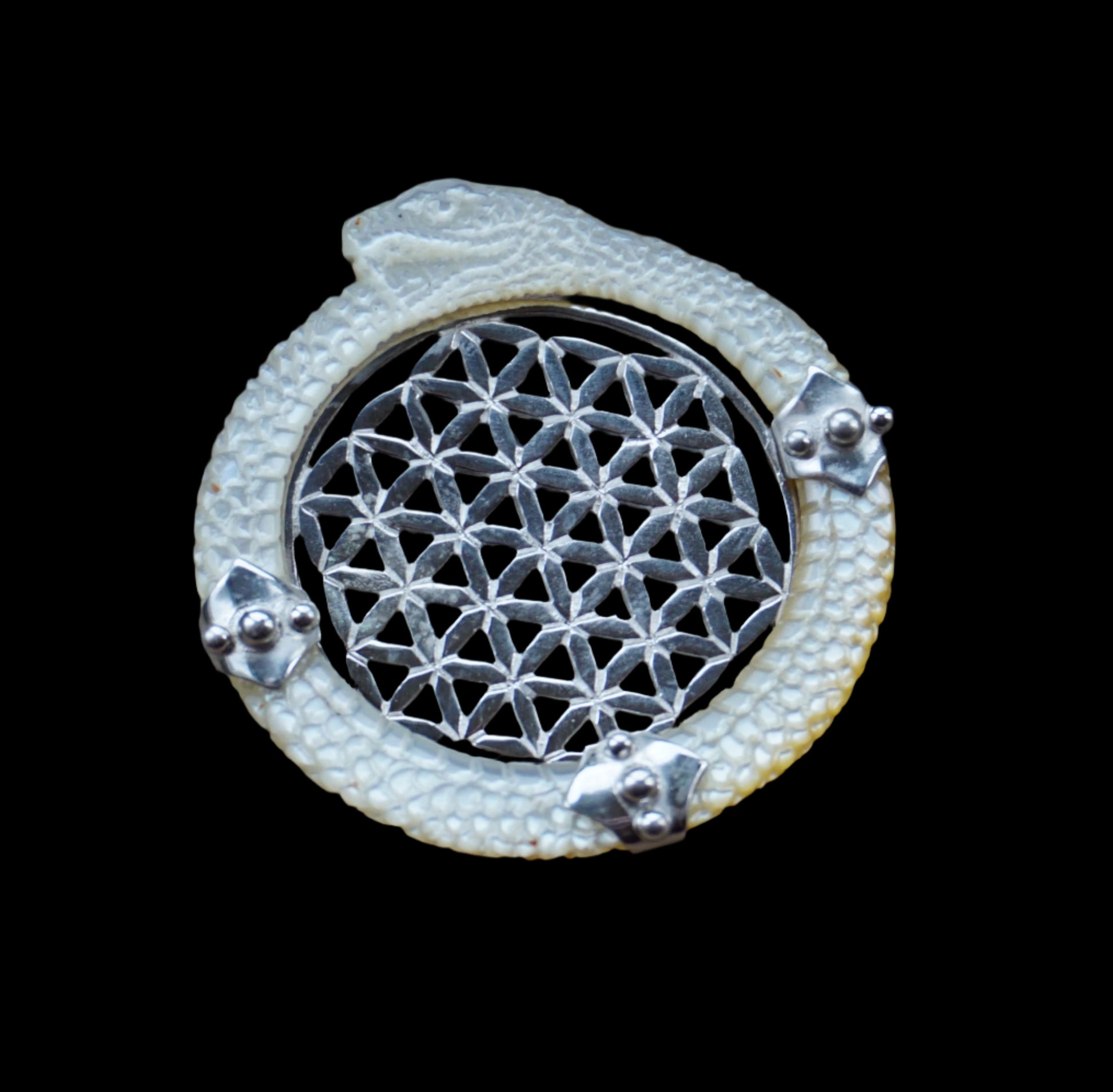 Ref.PD0486 - Mother of pearl carved Ouroboros with silver Creation Mandala, aka Flower of Life, pendant.