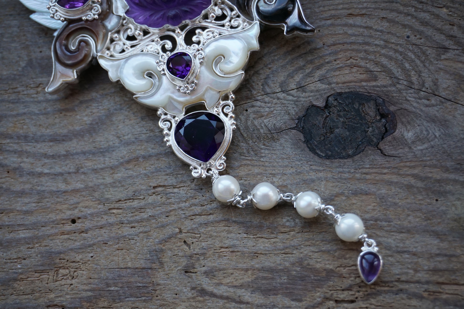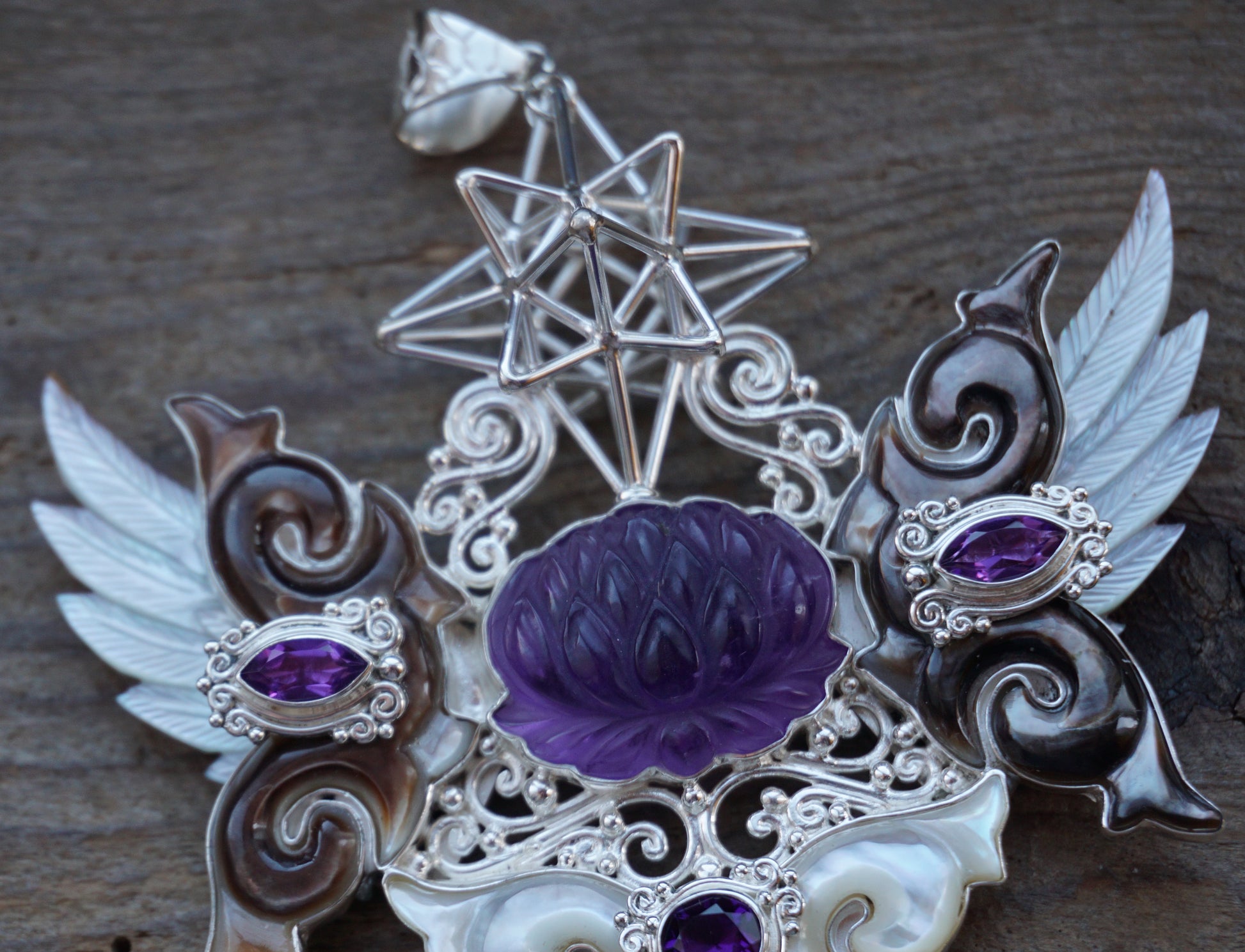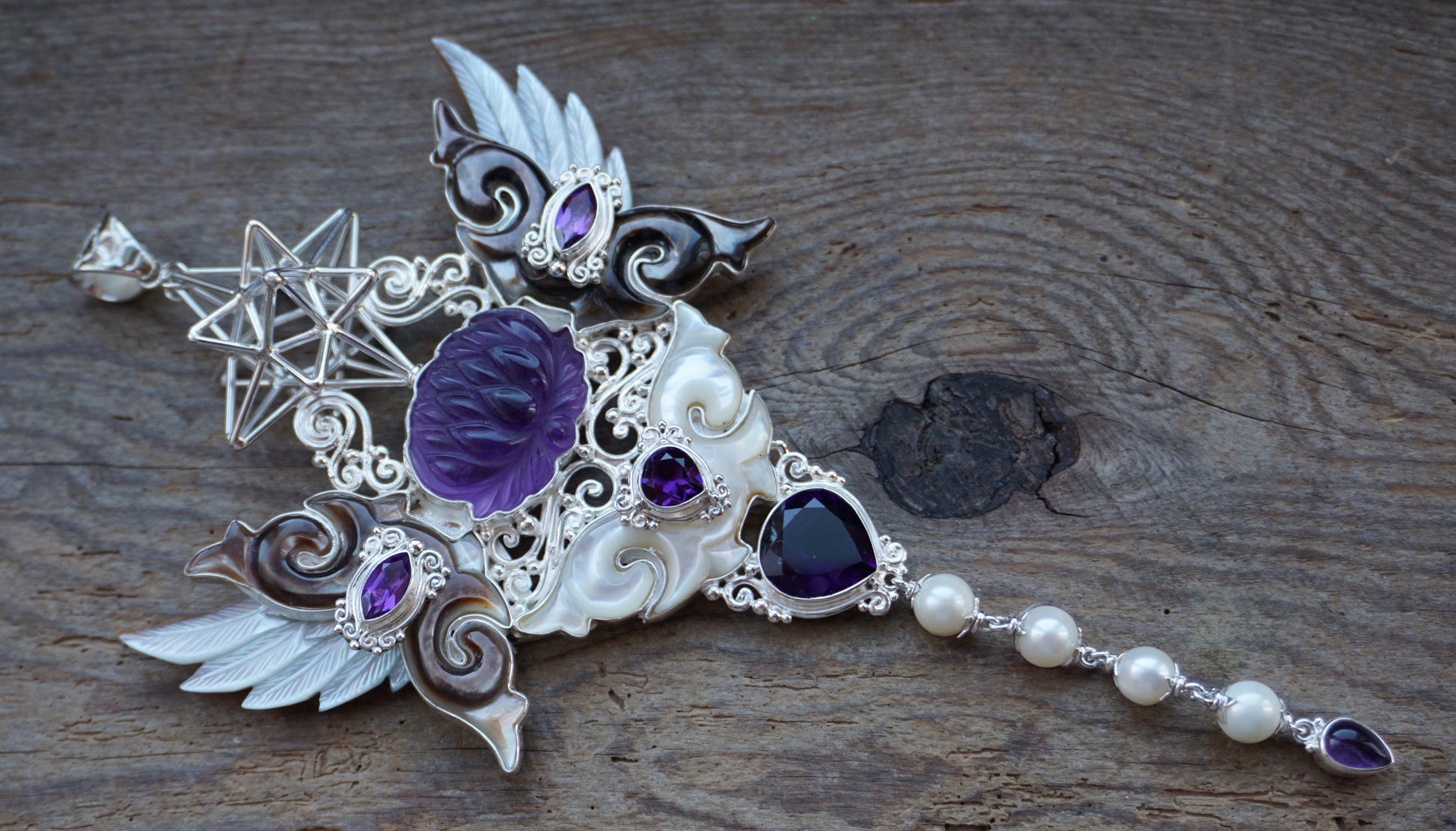 Silver XXL pendant with Heart Star geometry, mother of pearl carved wings & clouds, amethyst gems, and south sea pearls.